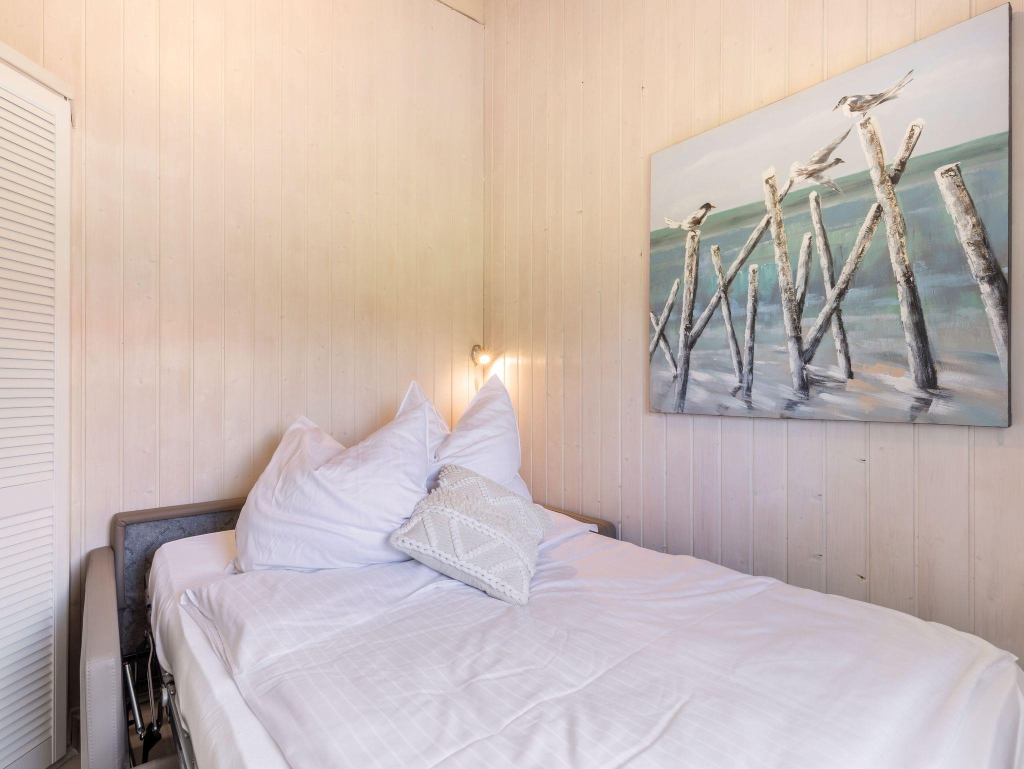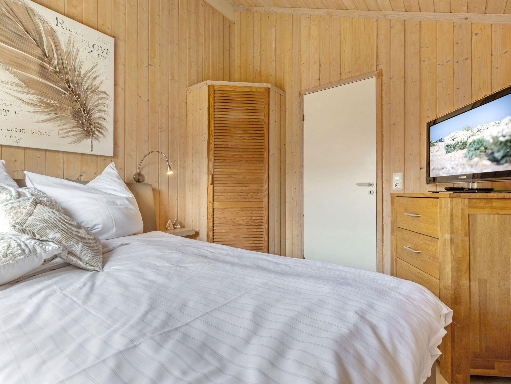 Holzwinkelbungalow mit ca. 94 qm Grundfläche, aufgeteilt in: großer Wohnbereich mit offenem Giebel und Kaminofen; 2 Schlafzimmer mit je 1 Doppelbett (160x200cm bzw. 180x200cm) und 1 Schlafzimmer mit Schlafsofa (140x200cm); offene Küche mit Geschirrspülmaschine; Dusche/WC; Waschmaschine und Trockner, Sauna, WLAN (Glasfaseranschluss). Außerdem: 2 möblierte Terrassen, großes, umzäuntes Grundstück mit Meerblick über die Wiesen, Strandkorb, Parkplatz am Haus, abschließbarer Fahrradschuppen, Nichtraucher, Hunde gestattet. Kaution Euro 250,00 mit der Restzahlung überweisen, Strom nach Verbrauch Euro 0,40 kWh.