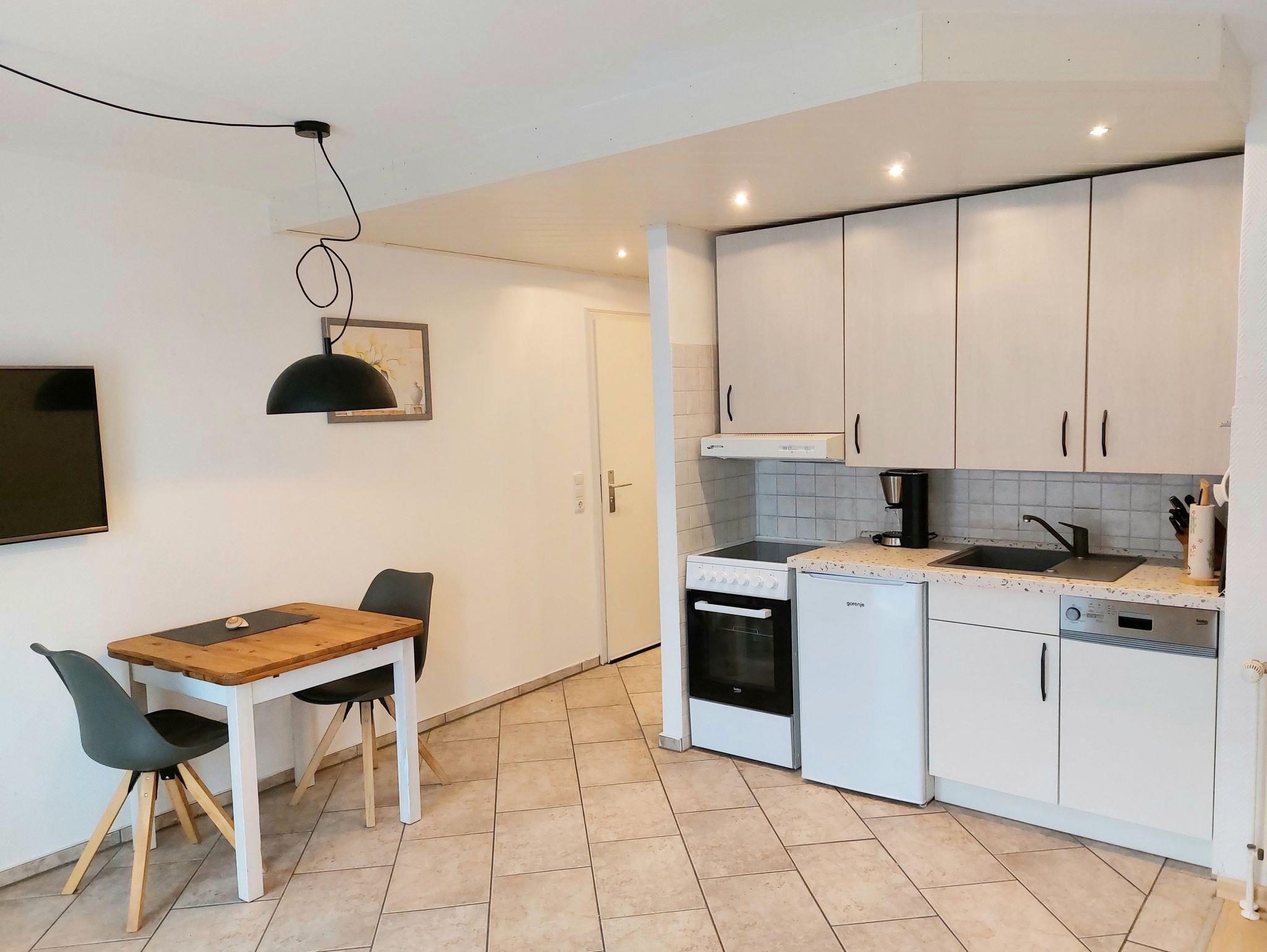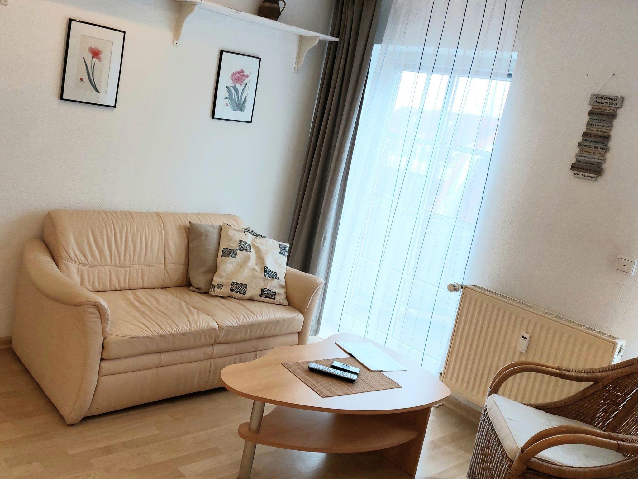 Aufgeteilt in: Wohnzimmer mit Essbereich, Schlafzimmer mit Doppelbett (140x200 cm mit einteiliger Matratze), Küchenzeile im Wohnbereich, Duschbad/WC, Balkon zur Ostseite, WLAN, PKW-Stellplatz und Fahrradbügel