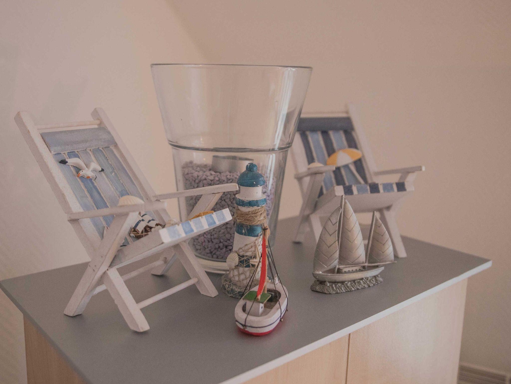 Ein großzügiges lichtdurchflutetes Wohnzimmer mit Essbereich für 5 Personen, Flachbildfernseher und DVD-Player ist das Herzstück der Ferienwohnung. Von hier haben Sie Zugang auf den zur Meerseite gelegenen Balkon, auf dem Sie beim Frühstück die ersten Sonnenstrahlen genießen oder den perfekten Urlaubstag ausklingen lassen können.