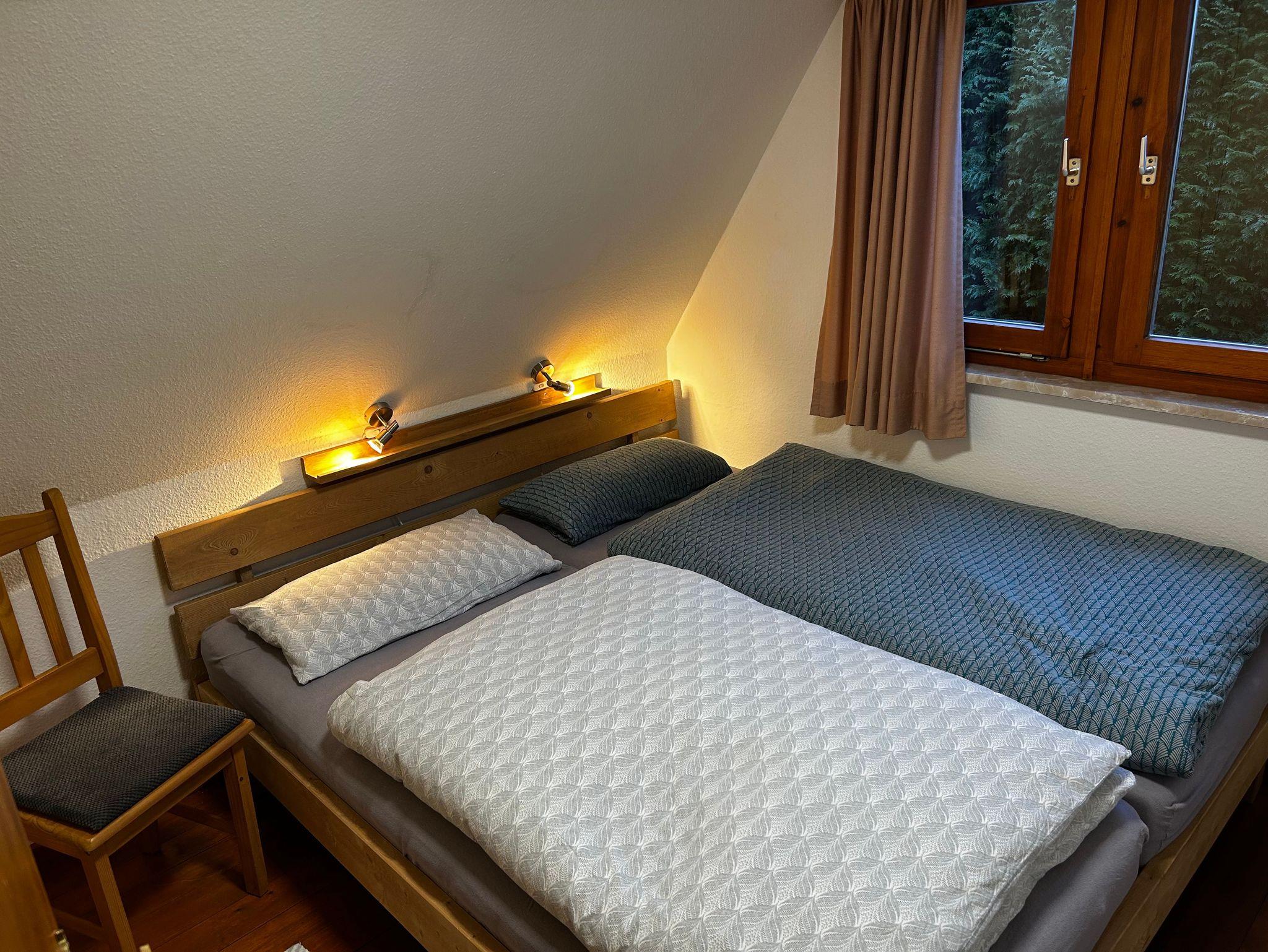 Das Schlafzimmer im Erdgeschoss ist mit einem komfortablen Doppelbett (1,80 m x 2,00 m) sowie einem Wandschrank ausgestattet. Gegenüber befindet sich das Badezimmer mit Dusche und WC.