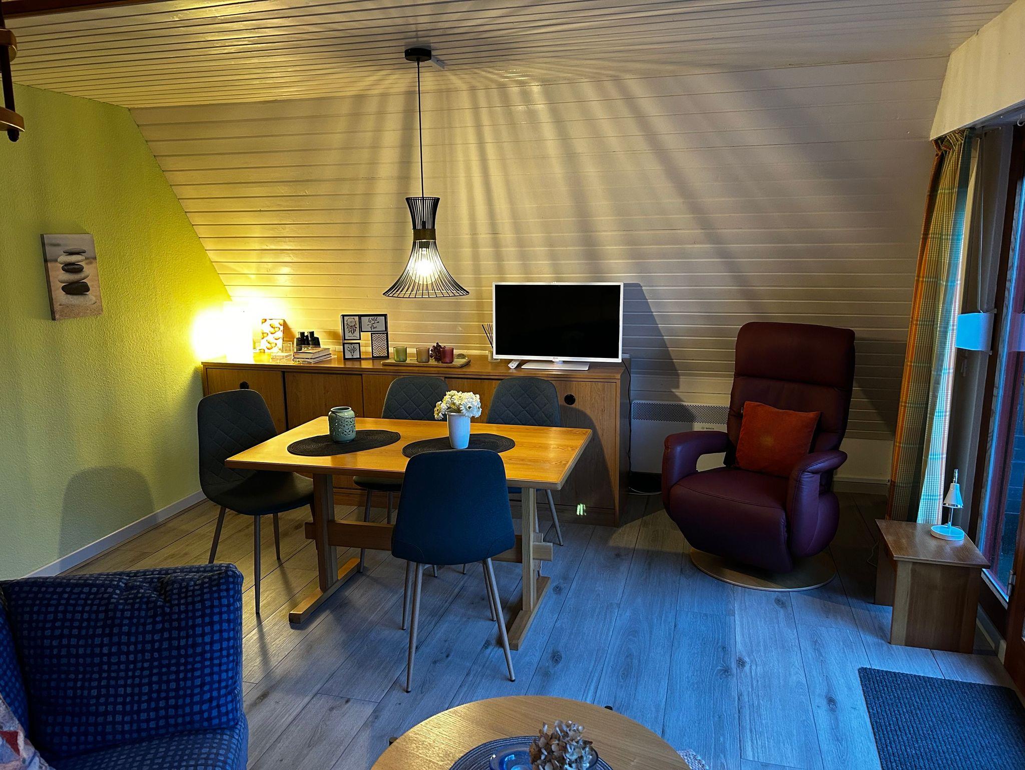Über eine schmale Wendeltreppe gelangen Sie vom Wohnzimmer aus in das Dachgeschoss. Hier befinden sich ein weiteres Schlafzimmer mit zwei Einzelbetten (je 90 cm) sowie ein kleines Zimmer mit Couch und Sitzecke auf der ruhigen Gartenseite. Ein schöner Rückzugsort zum Lesen oder Entspannen.