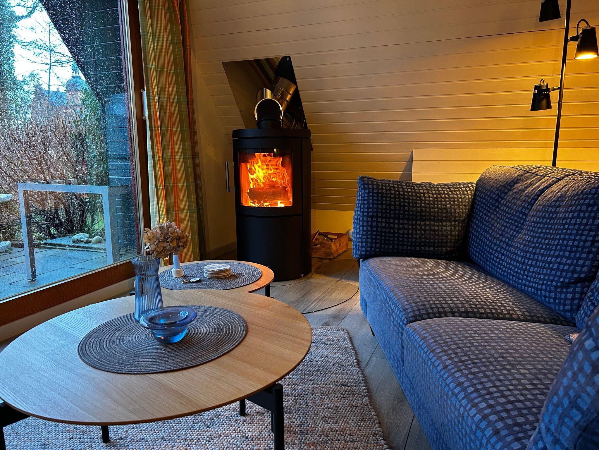 Im Eingangsbereich befinden sich eine Garderobe sowie eine Küchenzeile. Von hier aus gelangen Sie in das geräumige Wohnzimmer mit Essecke, gemütlicher Couchgarnitur, Relaxsessel und Kamin. Besonders an kühleren Tagen sorgt das Kaminfeuer für eine behagliche Stimmung - ideal für eine entspannte Auszeit zu zweit. Durch die großen Fenster genießen Sie einen herrlichen Blick in den Garten und über die Teichterrasse bis hin zum Schloss.