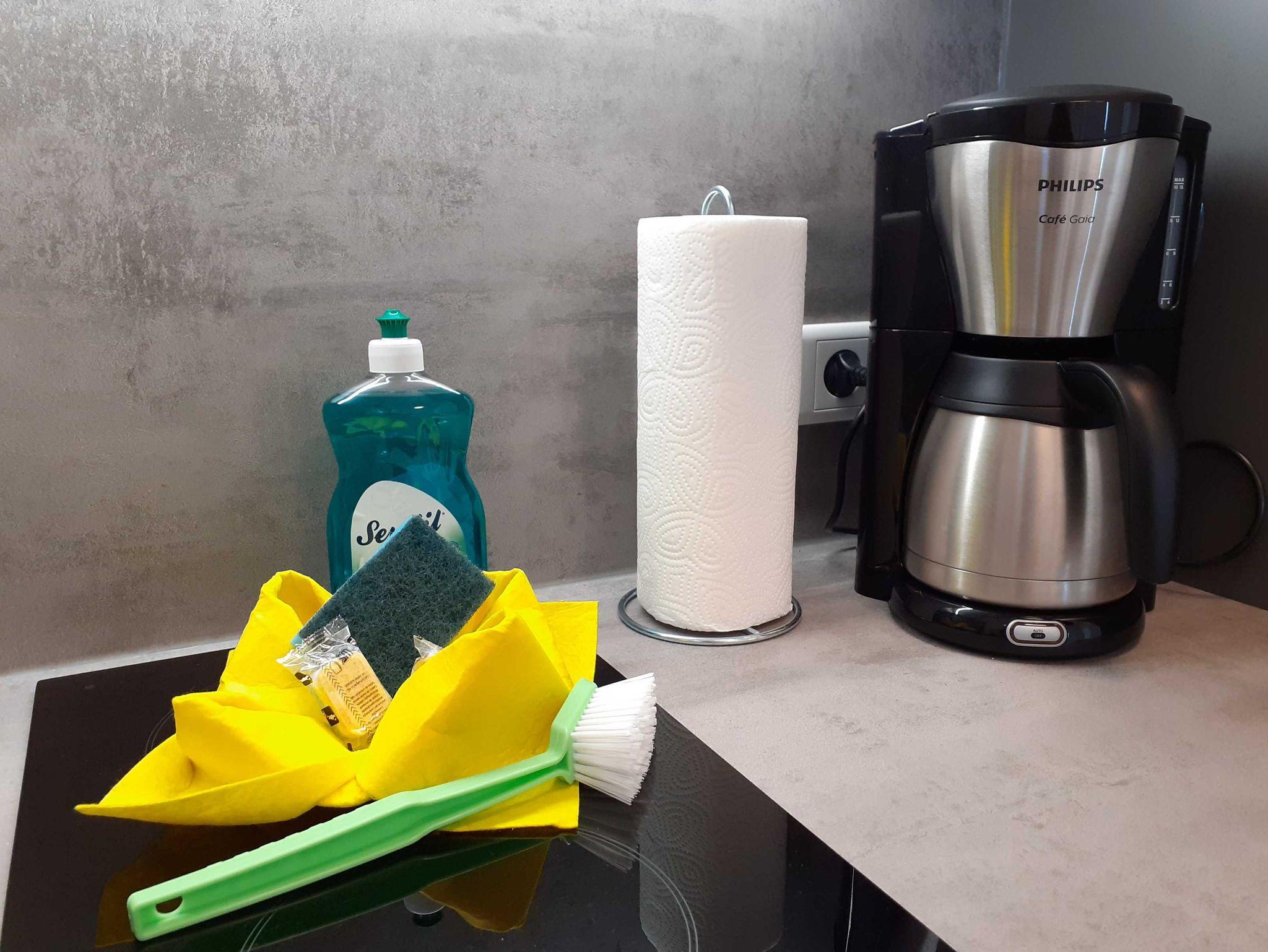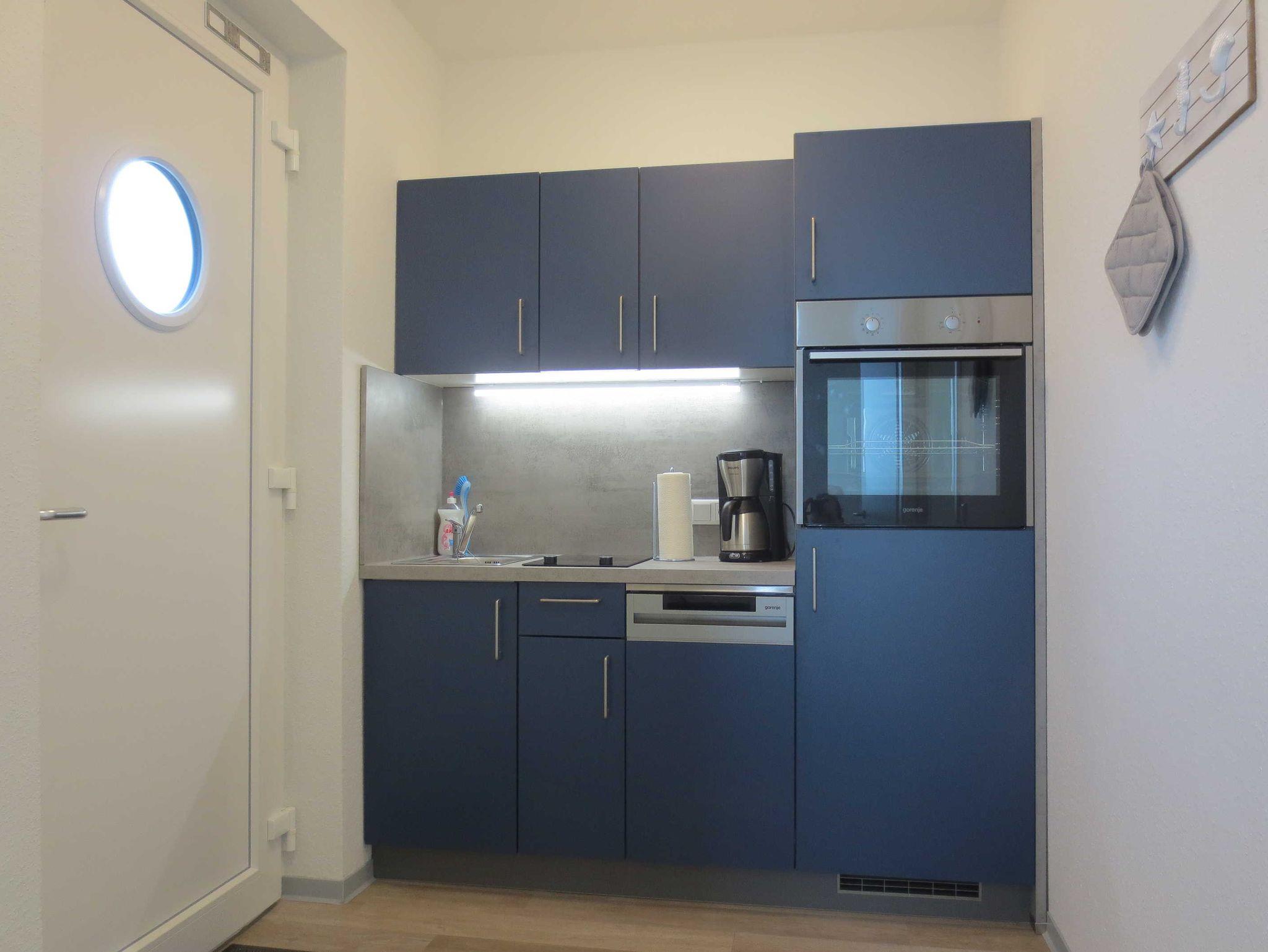 Eine voll ausgestattete Küchenzeile im Flur (2 Glaskeramik-Kochfeldern, Spüle, Kühlschrank, Backofen, Geschirrspüler, Kaffeemaschine, Toaster und Wasserkocher) bietet Ihnen alle nötigen Utensilien, um leckere Mahlzeiten zubereiten zu können.