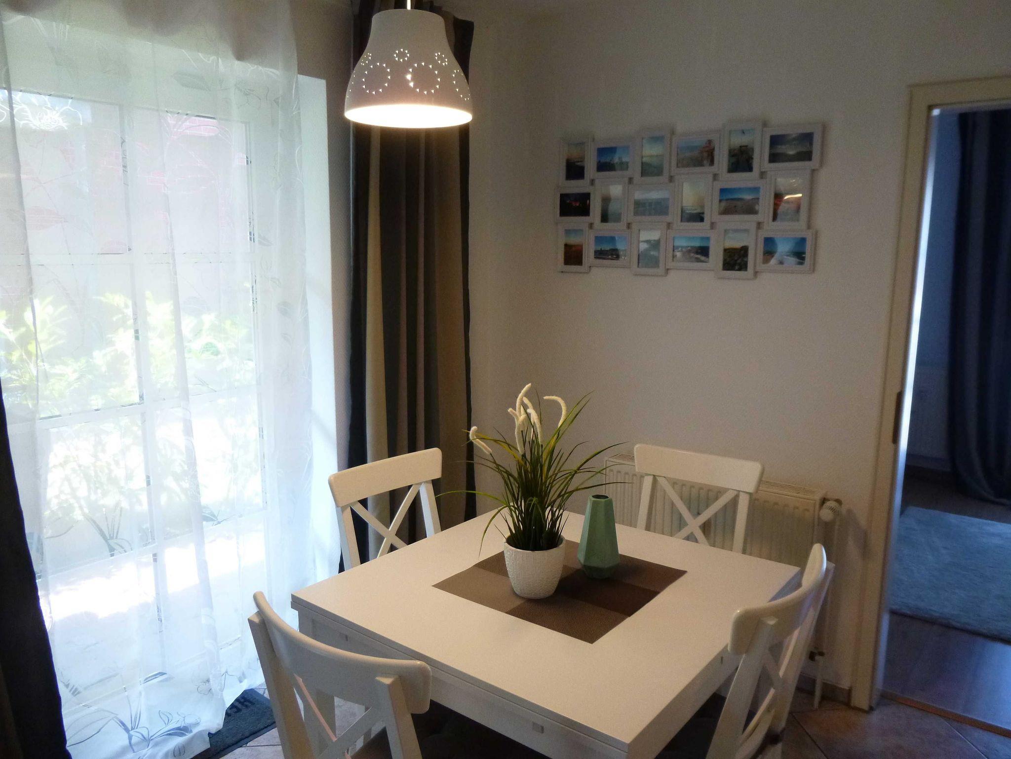Die Lüttje Stuv ist eine kleine, freundliche 2-Zimmer-Ferienwohnung im Parterre eines Mehrappartementhauses mit 6 Wohneinheiten. Auf ca. 45 qm Wohnfläche steht Ihnen ein Wohnraum mit Couchbereich und Essplatz für 4 Personen, ein Schlafzimmer mit einem Doppelbett (2x90x200cm) und einem Schlafsessel (Liegefläche 100x190cm), ein neues Bad mit ebenerdiger Dusche und eine kleine Küchenzeile im Wohnbereich mit 4-Platten Glaskeramikfeld, einem Tischbackofen und einem Geschirrspüler zur Verfügung. Vom Wohnzimmer gelangt man auf eine möblierte, große und mit Sichtschutzzaun versehene Terrasse, die zur Westseite ausgerichtet ist. Für Babys gibt es in der Wohnung ein Babyreisebett, einen ausklappbaren Wickeltisch und eine Babybadewanne. Außerdem steht den Gästen kostenfreies WLAN in der Wohnung und ein reservierter PKW-Stellplatz vor dem Haus zur Verfügung.