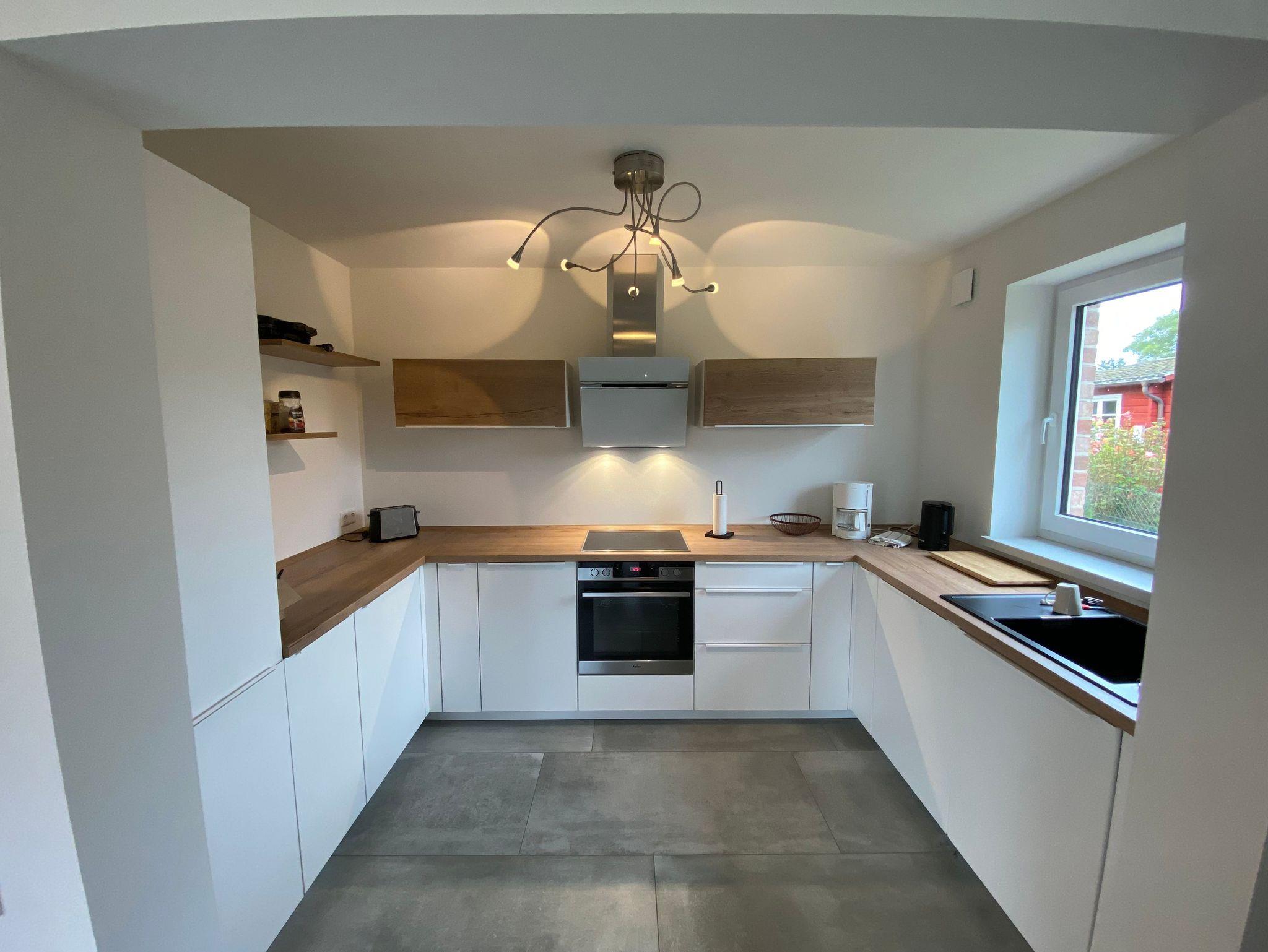 Die offene, voll ausgestattete Küche lädt zum ausgiebigen Kochen ein. Im Erdgeschoss finden Sie neben dem Gäste-WC auch noch einen Abstellraum mit Waschmaschine.