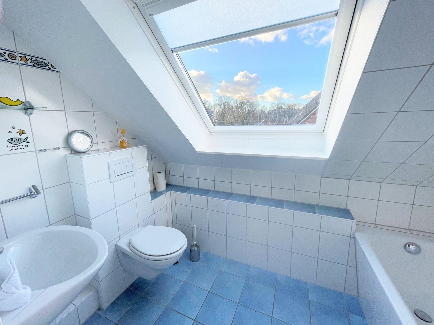 Zwei Schlafzimmer mit Doppelbetten, sowie ein Wannenbad sind vom Flur aus erreichbar.