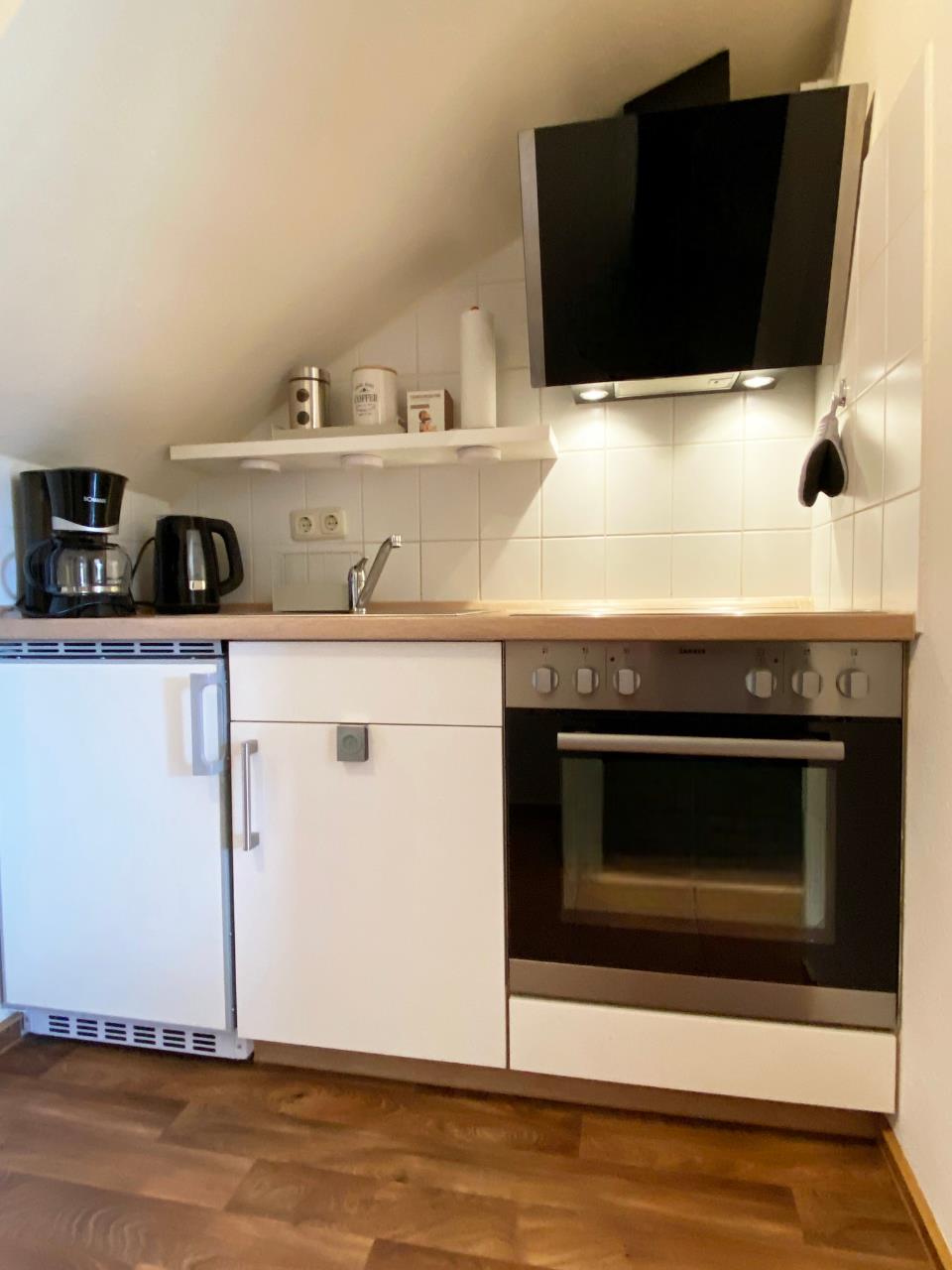 Die Wohnung verfügt über eine gemütliche offene Pantryküche mit Cerankochfeld, Backofen, Kühlschrank, Gefrierfach, Spülmaschine, Filterkaffeemaschine, Wasserkocher, Toaster und Handrührgerät. Im Schlafzimmer erwartet Sie ein komfortables Doppelbett (160x200cm) mit getrennten Matratzen und einem Kleiderschrank. Für eine angenehme Nachtruhe sorgt die Verdunklungsmöglichkeit.