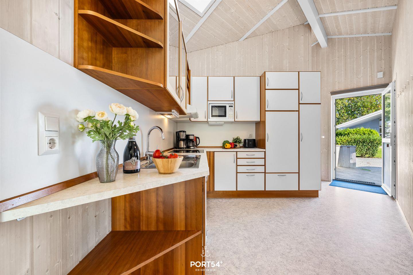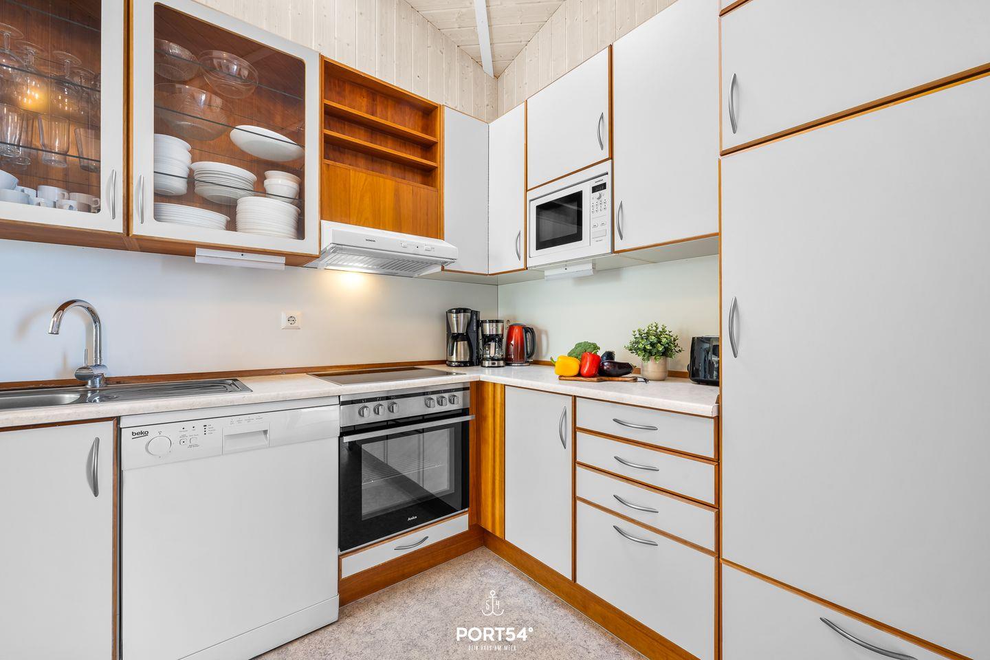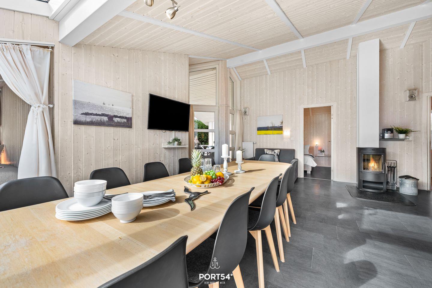 Das Herzstück des Hauses ist der lichtdurchflutete Wohn- und Essbereich mit hohen Decken und einem gemütlichen Kaminofen – perfekt, um Dich an kühleren Tagen einzukuscheln. Die großzügige, voll ausgestattete Küche lässt keine Wünsche offen – hier macht gemeinsames Kochen richtig Spaß.