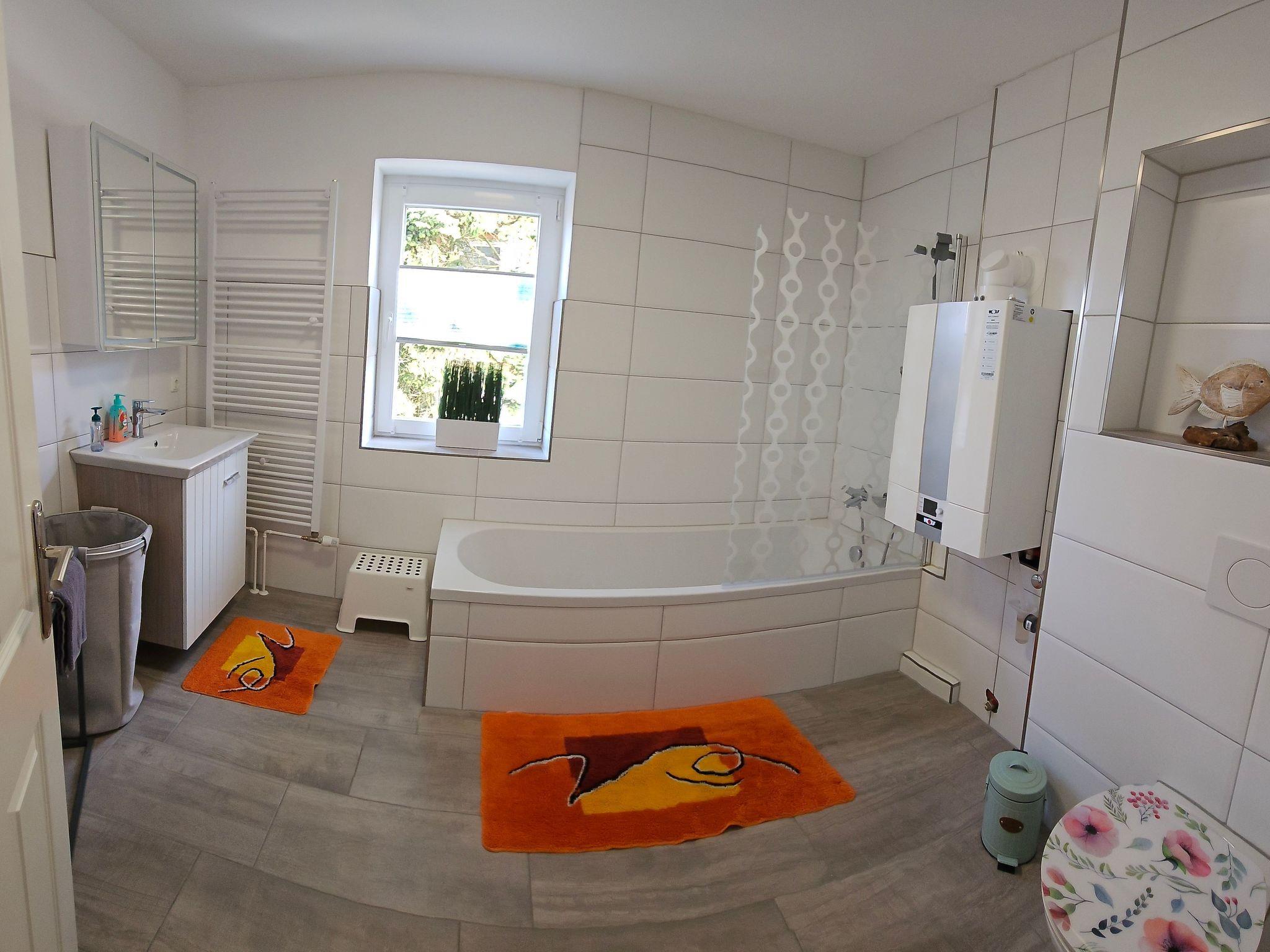 Das Badezimmer hat Tageslicht und eine Badewanne, in der duschen natürlich auch möglich ist.