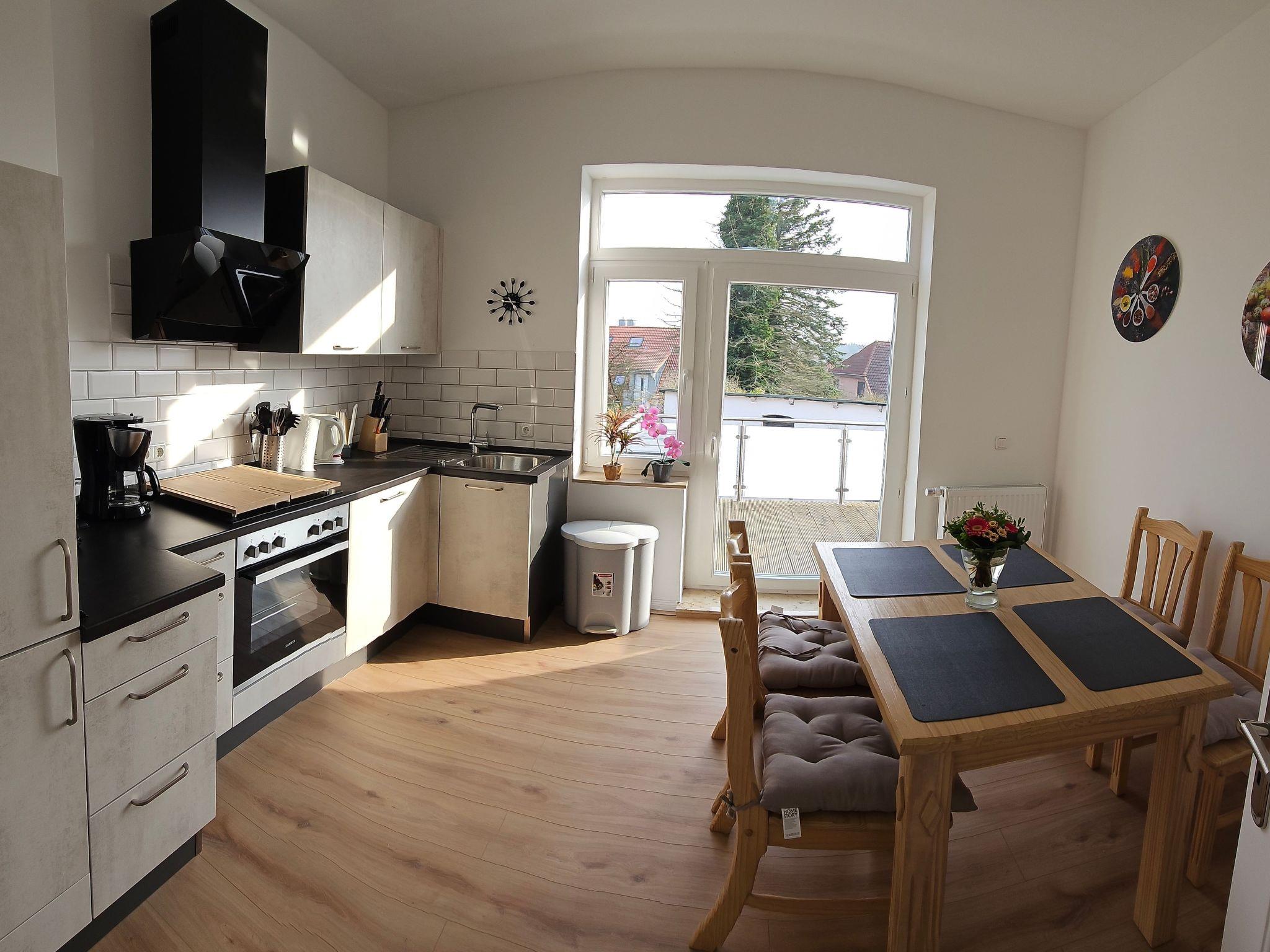Die Küche ist mit den verschiedensten Elektrogeräten wie Ceranfeld, Backofen, Kühl-/ Gefrierkombi, Kaffeemaschine, Wasserkocher, Toaster etc. ausgestattet. Der Zugang zur Dachterrasse erfolgt ebenfalls über die Küche.