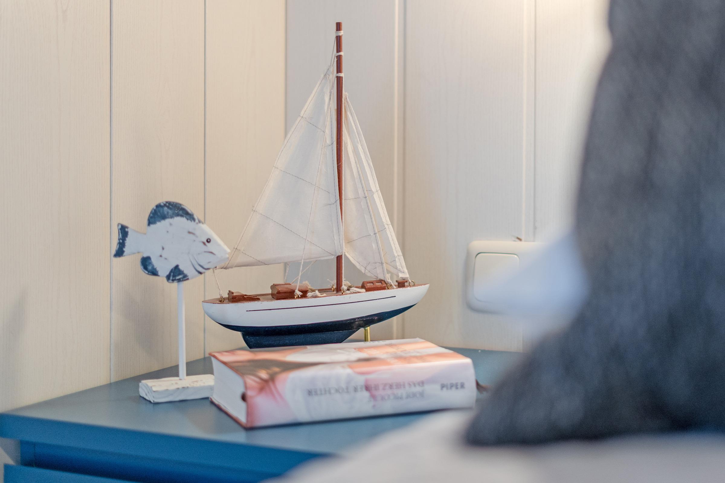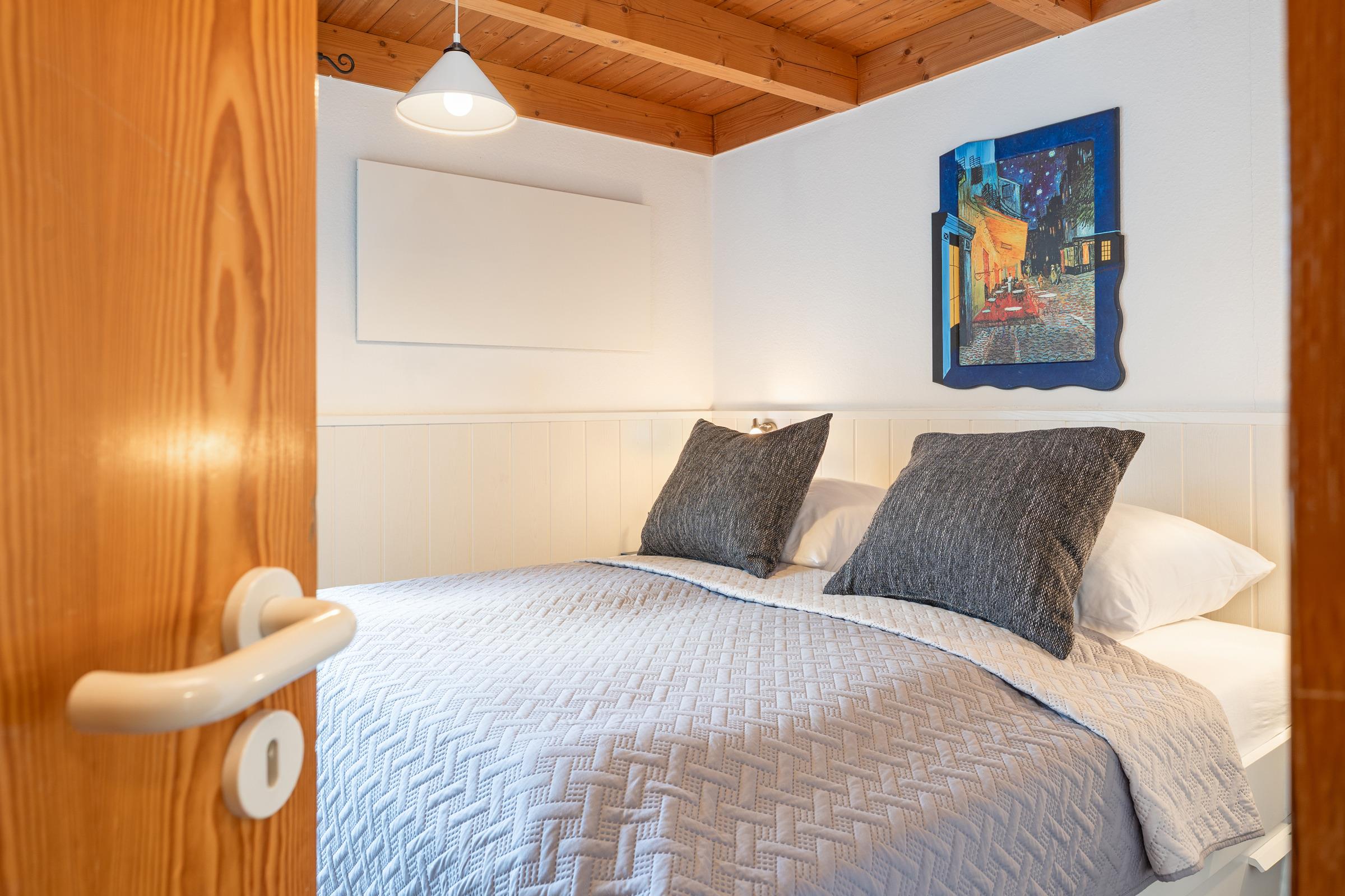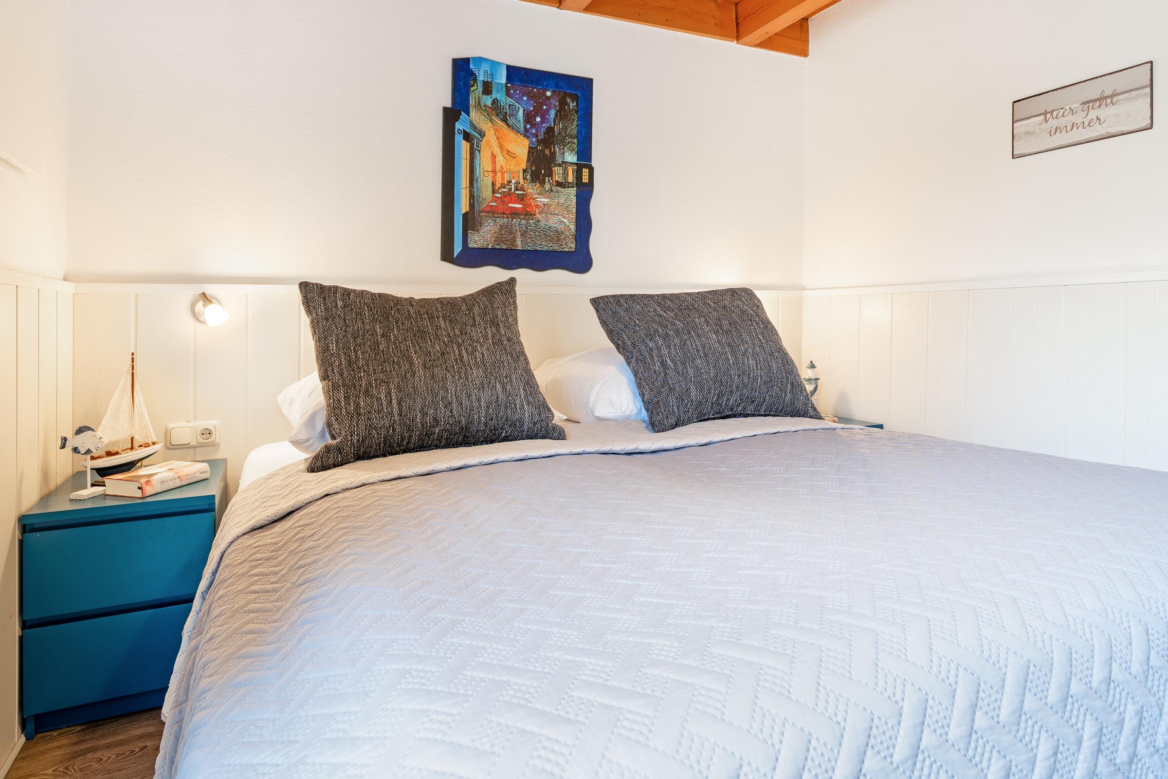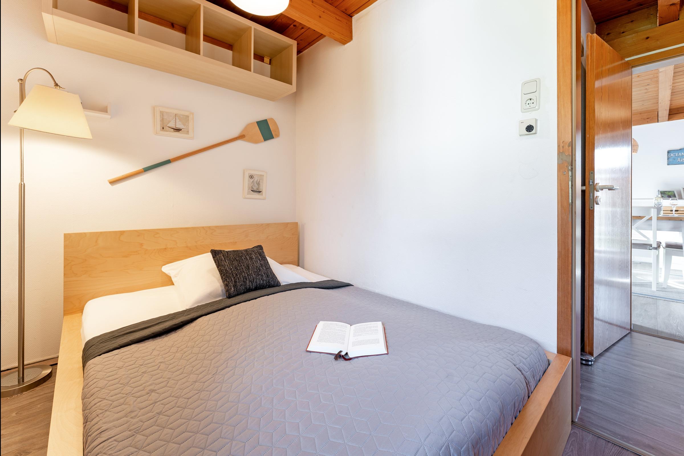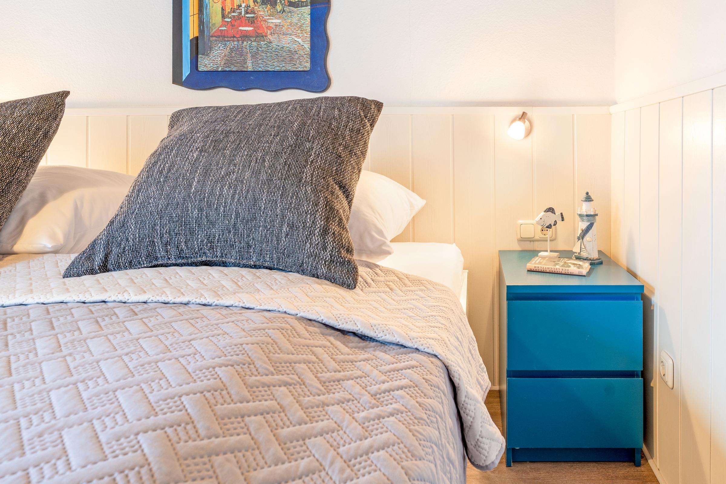 Das erste Schlafzimmer verfügt über ein Doppelbett, das zweite über ein französisches Doppelbett; zusätzlich bietet das Wohn-/Schlafzimmer ein Schlafsofa. Das Bad ist mit einer Dusche mit Haltegriff, welche eine Einstiegshöhe von 15cm hat und einem Haartrockner ausgestattet.