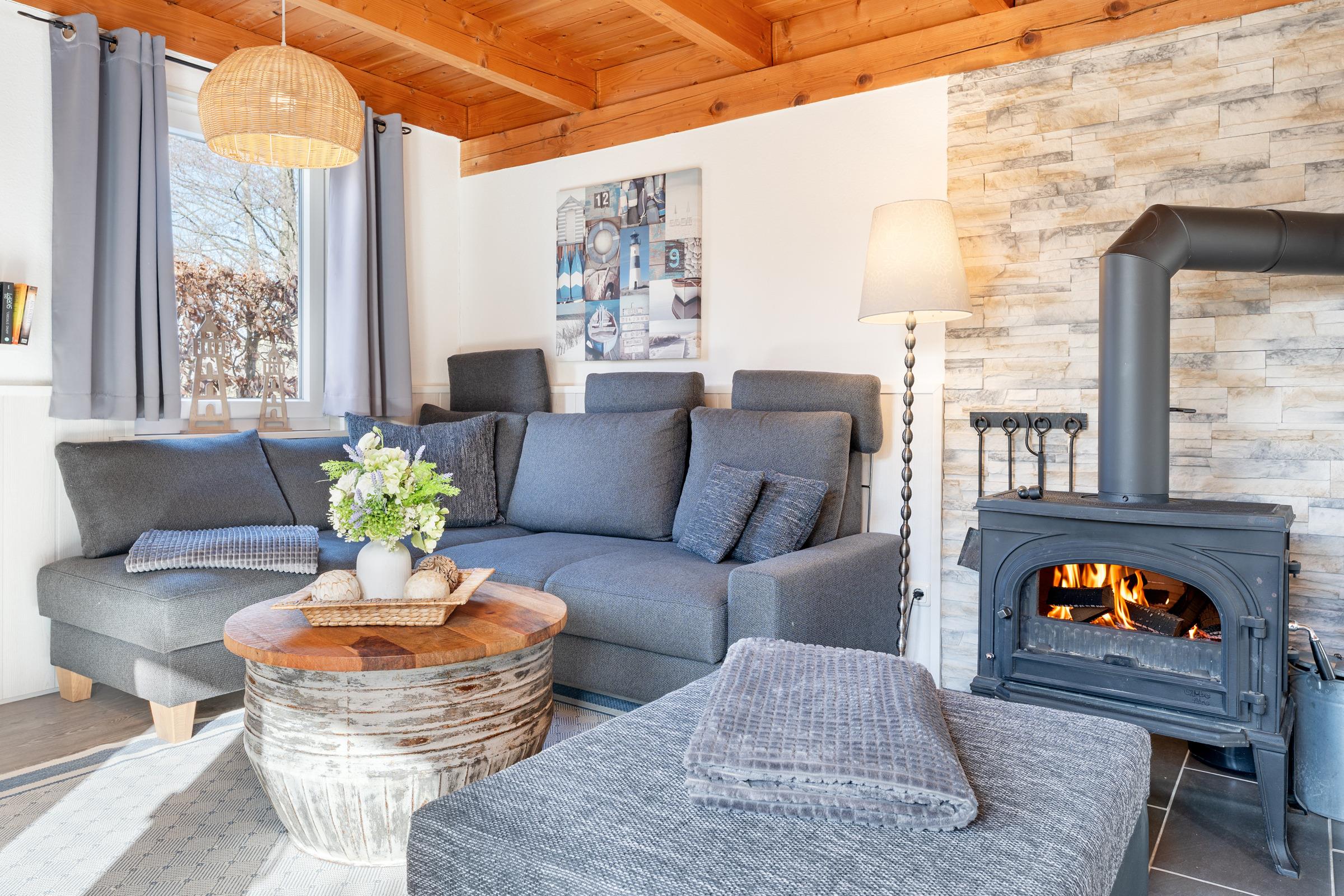Der Rundgang beginnt im gemütlichen Wohnbereich, der mit einem Fernseher, Kamin und CD-Player ausgestattet ist und eine behagliche Atmosphäre schafft. Ihnen stehen zwei Terrassen zur Verfügung. Eine mit West- und eine mit Ost-Ausrichtung, jeweils mit 12cm Schwelle, die mit Gartenmöbeln, Sonnenschirm und Sonnenliegen zum Entspannen einladen. Das Grillen ist erlaubt. Weiter geht es in die voll ausgestattete Küche, in der sie sich optimal in Ihrem Urlaub versorgen können. Im angrenzenden Essbereich genießen Sie gemeinsame Mahlzeiten.