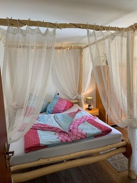 Ihr schlaft in einem tollen Himmelbett. Die Küche ist vollausgestattet mit einem Zwei-Platten-Herd, einem kleinen Kombi-Backofen mit Mikrowelle und einem Kühl-/Gefrierschrank.