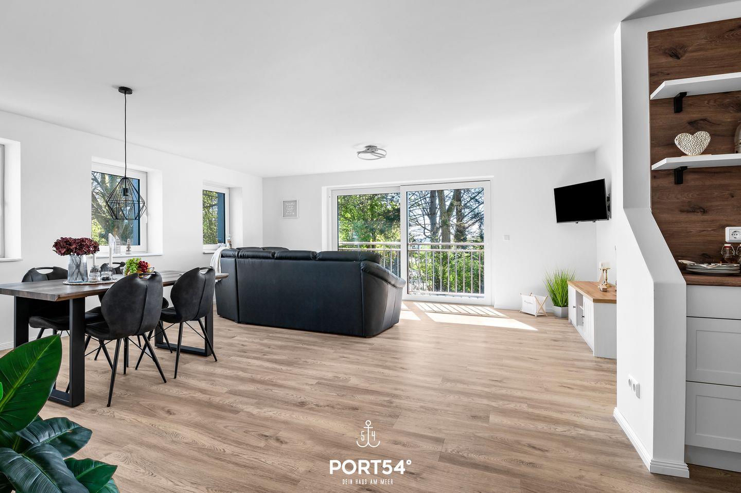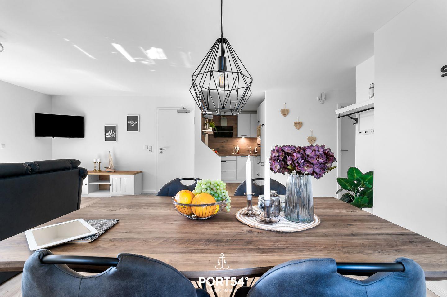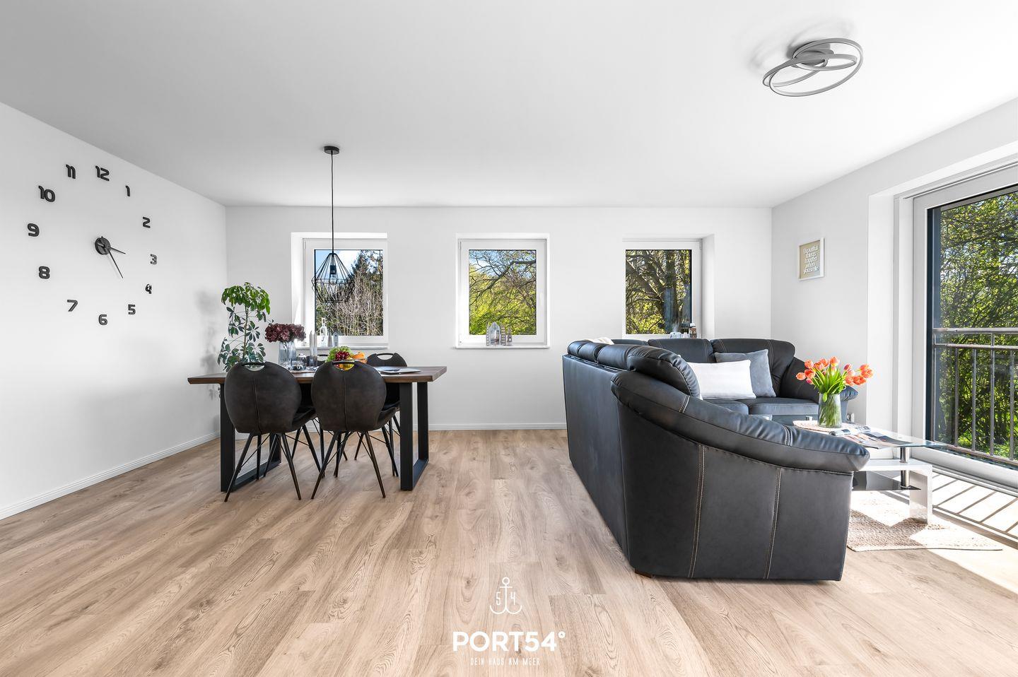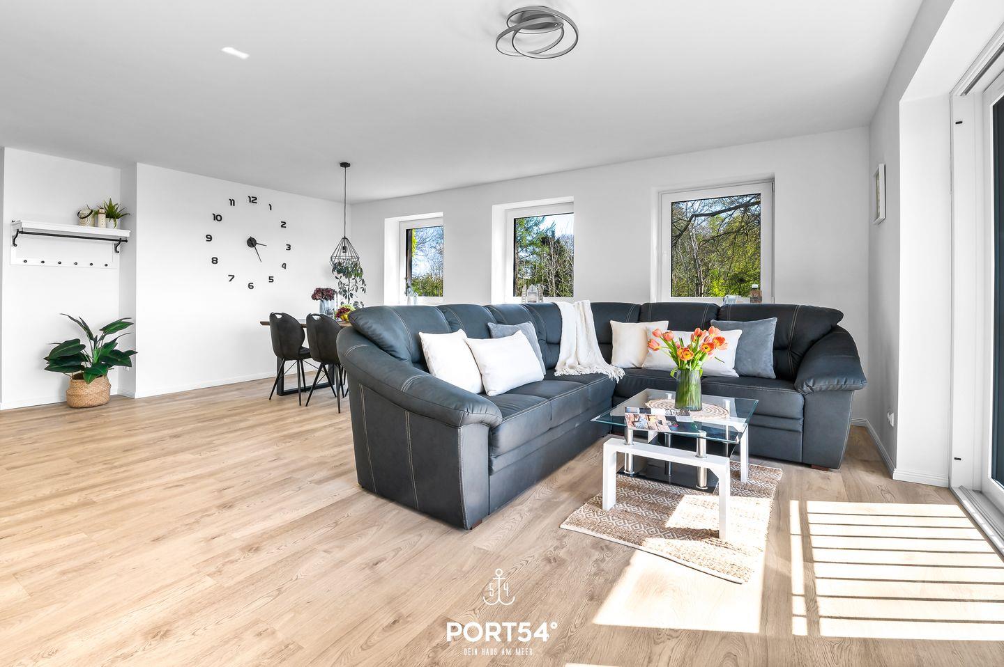 Der großzügige Wohn- und Essbereich besticht mit bodentiefen Fenstern, die Dir einen hervorragenden Blick auf die Schlei ermöglichen. Mache es Dir auf dem Sofa gemütlich und genieße bei einem Film die Aussicht – durch die Bäume kannst Du sogar die Schlei sehen. Die angrenzende offene Küche ist mit einem Essbereich und allem Notwendigen ausgestattet, um leckere Gerichte zaubern zu können.