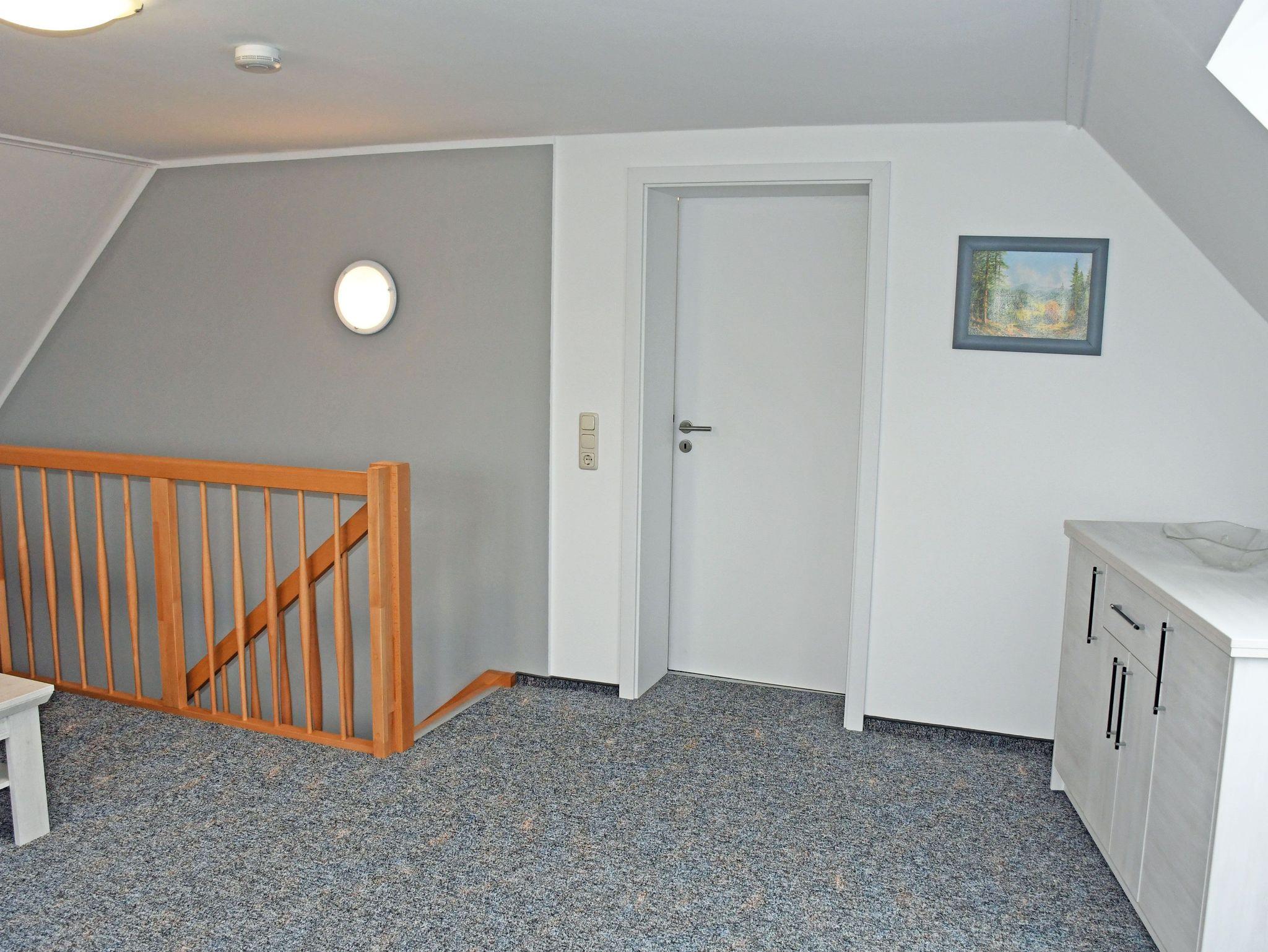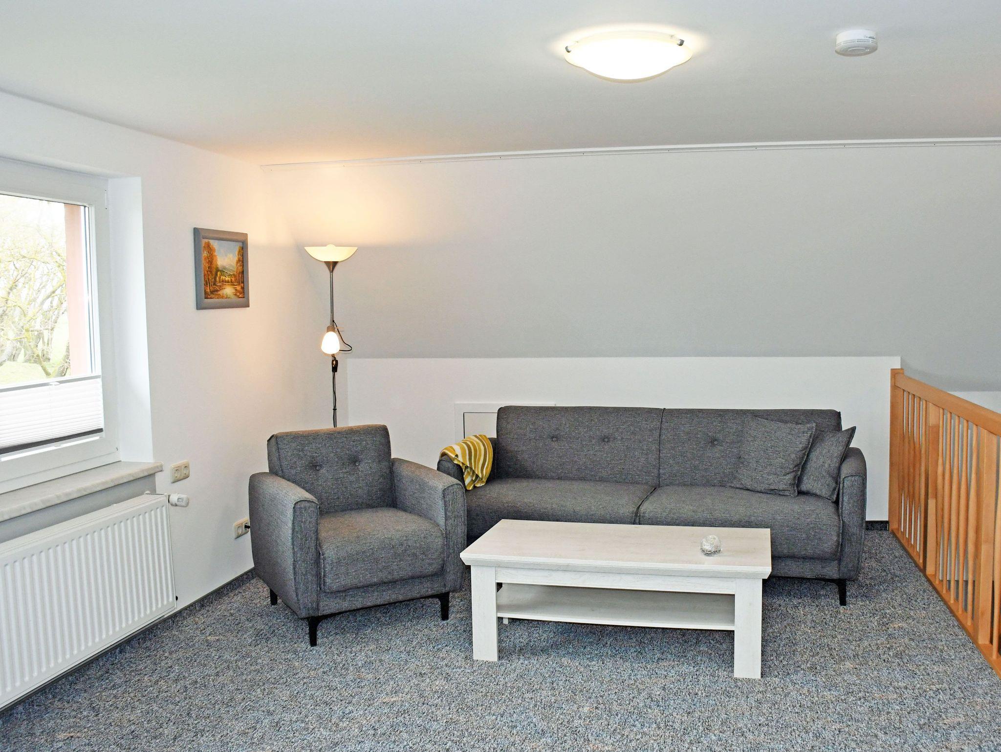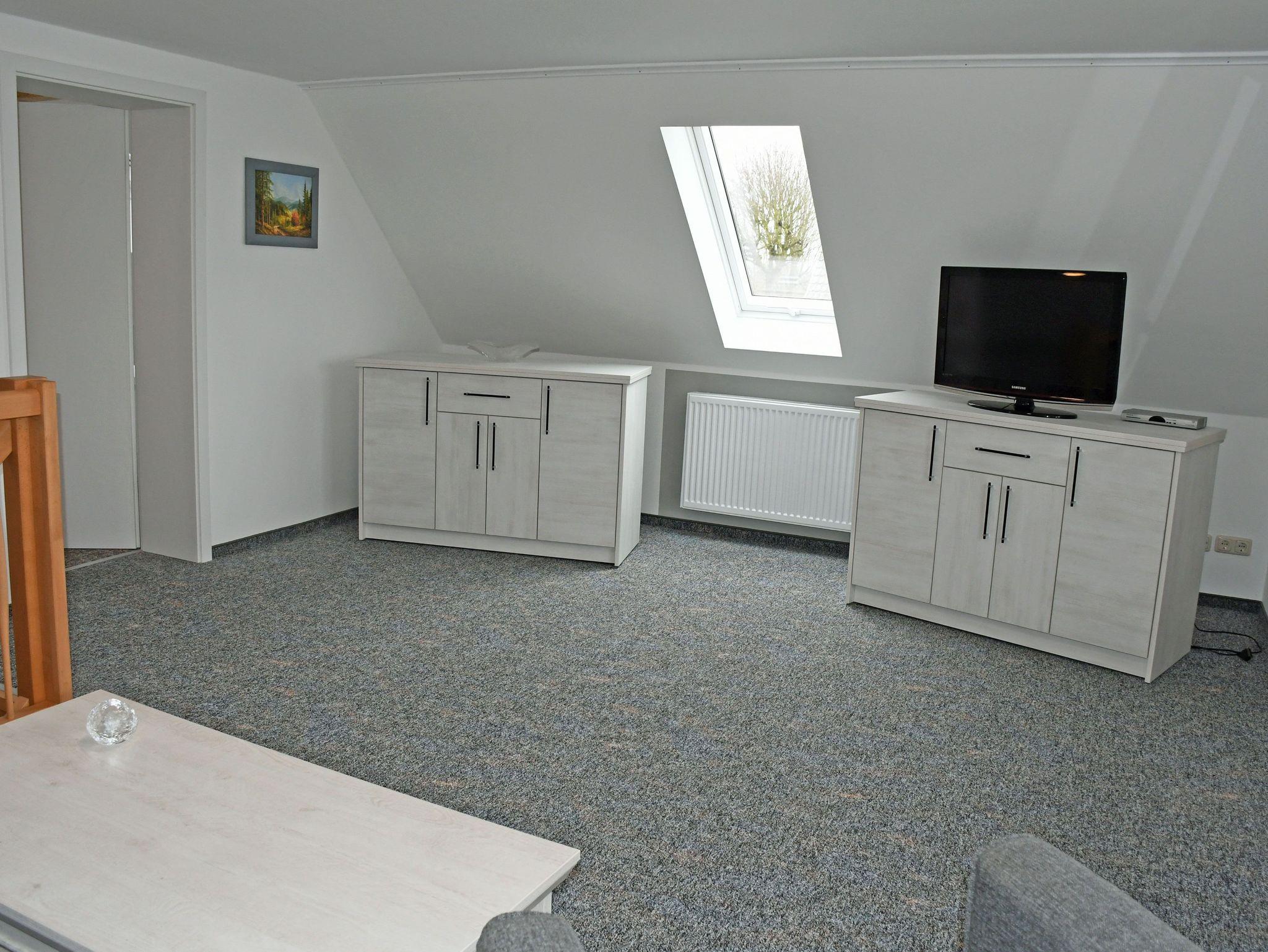 In dem im OG liegende großzügigen Wohnraum befinden sich eine Sitzcouch mit Tisch und Sessel, Leselampe und Flachbild-TV. Das im Obergeschoss befindliche Schlafzimmer ist mit einem bequemen Doppelbett mit Nachttischen und Leselampen sowie ein Kleiderschrank ausgestattet.