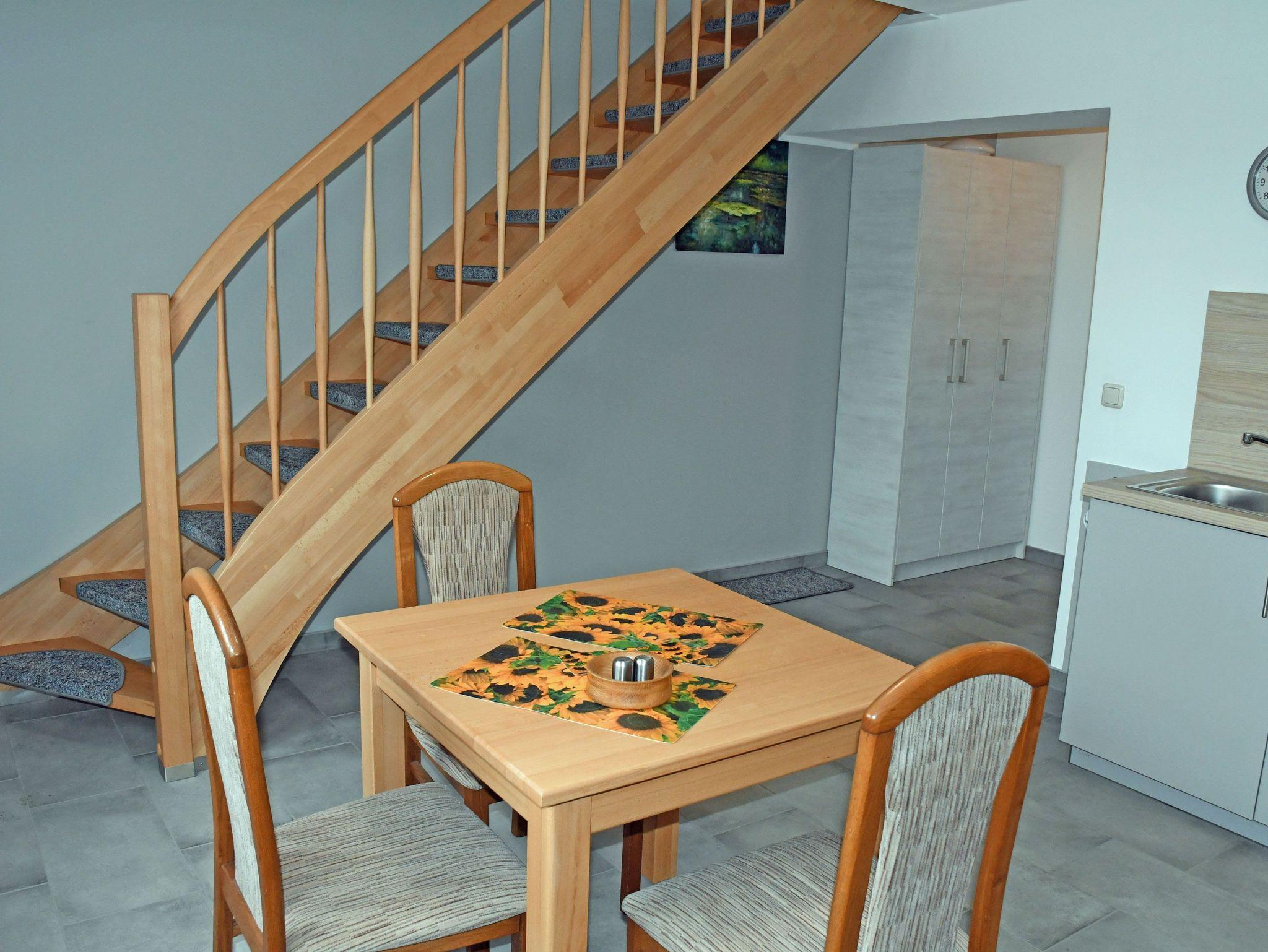 Im Erdgeschoss liegt die Küche. Hier steht auch ein Esstisch mit Stühlen. Die Küchenzeile ist mit einem Herd, Backofen, Wasserkocher, Kaffeemaschine, Toaster und Kühlschrank mit Gefrierfach komplett ausgestattet. Ebenfalls im EG liegt das Bad, es ist mit Dusche, WC und Waschtisch ausgestattet und verfügt über Tageslicht.