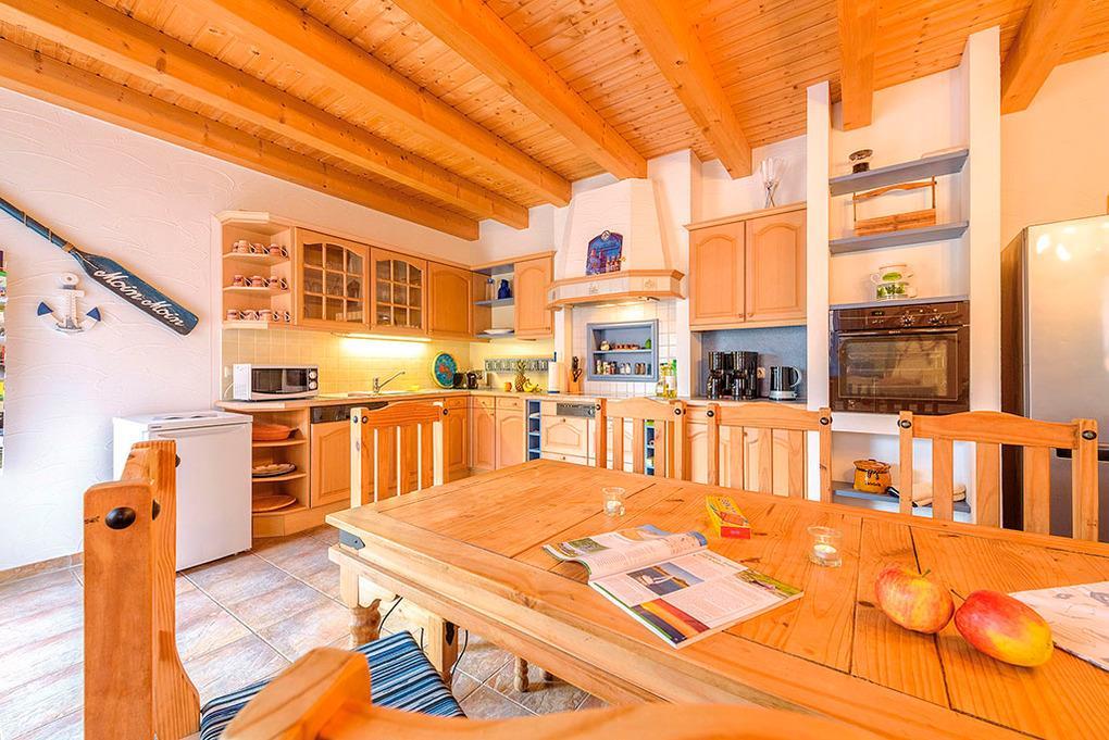 Parterre: Großes, gemütliches Wohnzimmer mit Kamin, großer Sitzgarnitur, Flachbild-TV, Stereoanlage. Großzügiger Küchen-/Essraum mit großem Esstisch, gut ausgestatteter Küchenzeile (Ceranfeld 4 Platten, Backofen, Mikrowelle, Tiefkühltruhe, Spülmaschine). Bad mit Du, Wb, WC. Separate Ferienwohnung mit eigenem Eingang: 2 Doppelzimmer mit jeweils 2 Einzelbetten. Kleine Küche mit Küchenzeile und Essbereich. Bad mit Du, Wb, WC.