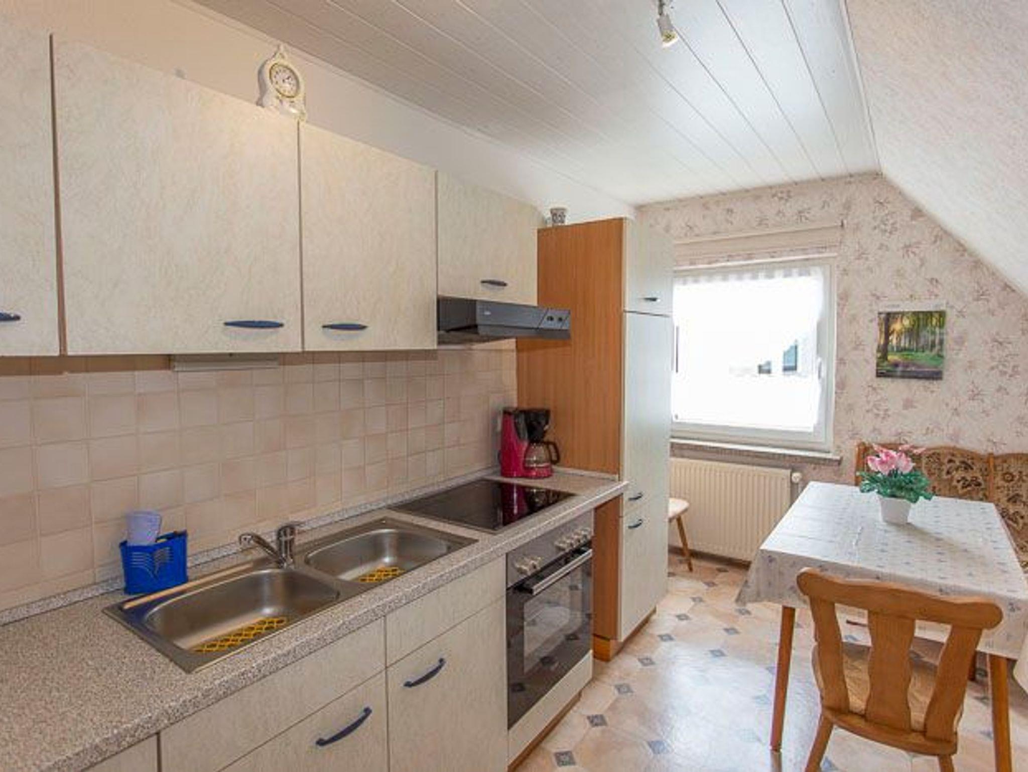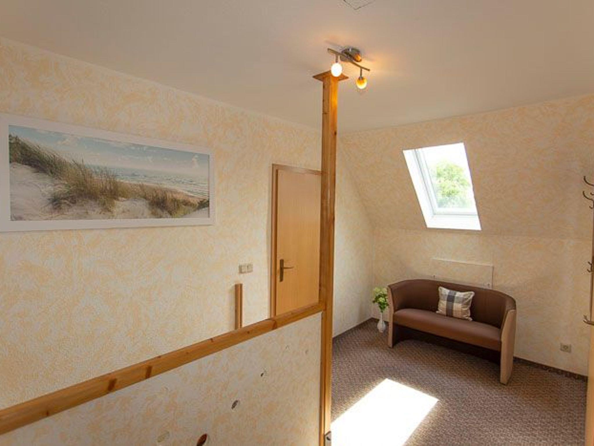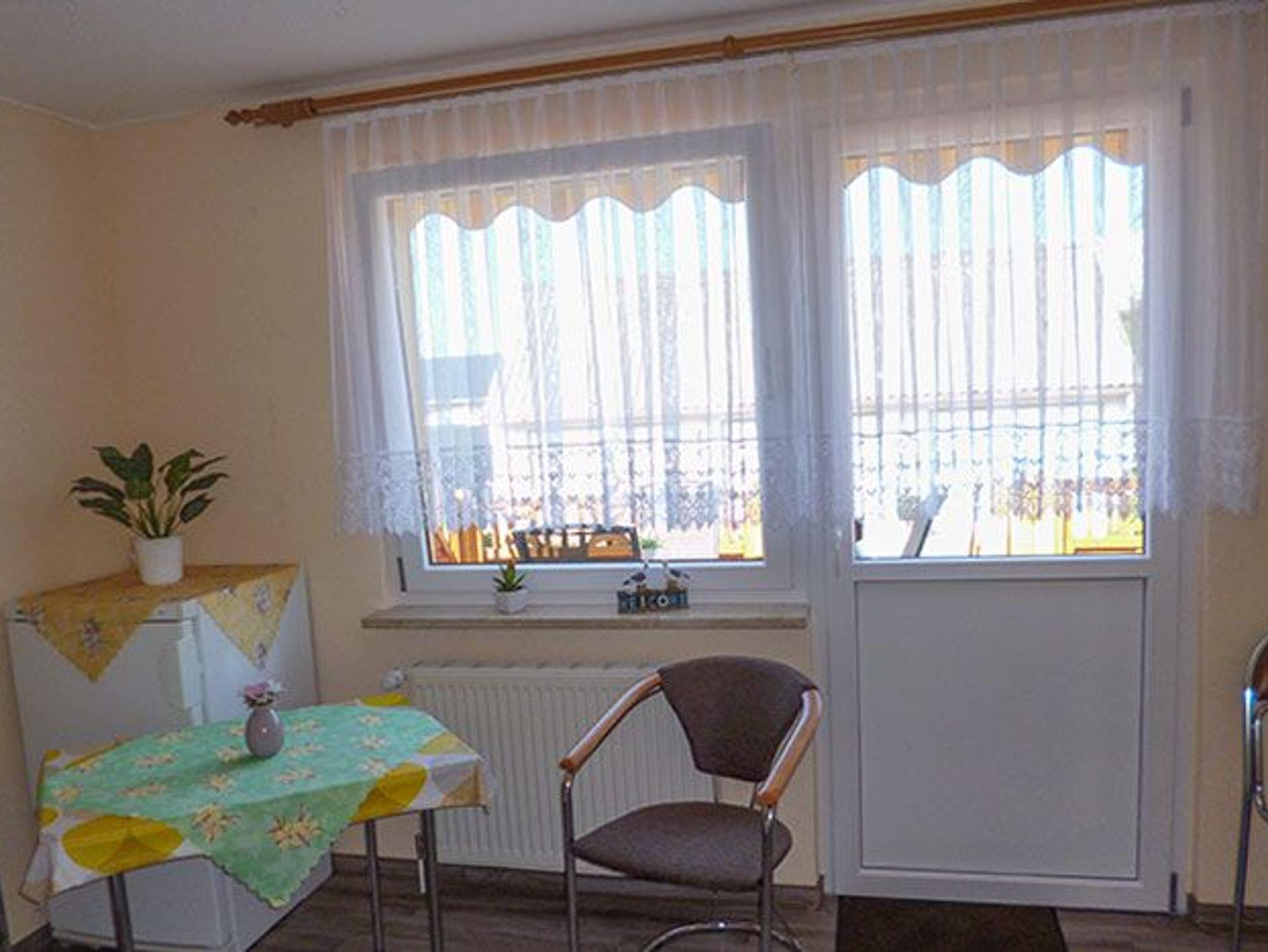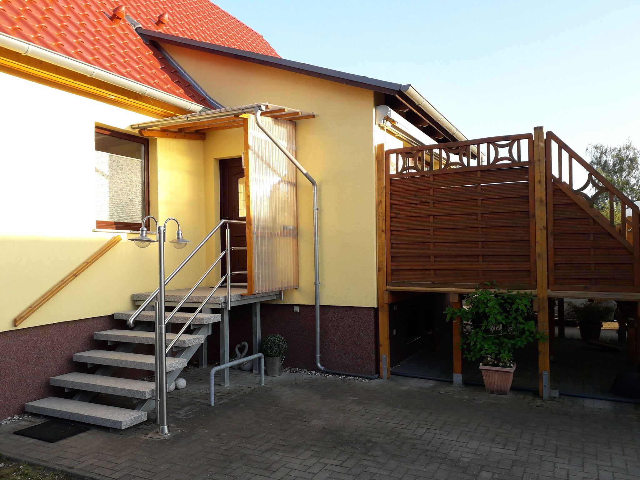 Die Ferienwohnung mit separatem Eingang befindet sich auf 2 Etagen im Hause des Vermieters. Im Erdgeschoss befindet sich eine Veranda mit Zugang zur Terrasse und ein Bad mit WC und ebenerdiger Dusche. Über eine Treppe geht es ins Obergeschoss, in dem sich die Küche mit Essbereich, das Schlafzimmer mit Doppelbett und das Wohnzimmer mit maximal zwei Aufbettungsmöglichkeiten befinden. Im Obergeschoss befindet sich außerdem ein kleines zusätzliches WC.