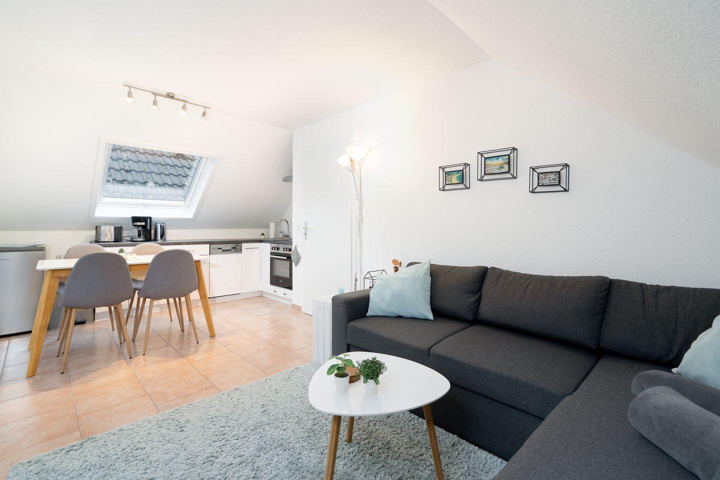 Die Ferienwohnung bietet mit zwei gut geschnittenen Zimmern ausreichend Platz für Paare, kleine Familien oder Alleinreisende. Das separate Schlafzimmer sorgt mit einem Doppelbett (2 x 90cm x 200cm, Matratzenhärtegrad 3) für erholsame Nächte, während der Wohnbereich mit gemütlichem Schlafsofa einen weiteren Schlafplatz bietet (Liegefläche ca. 150 x 195 cm). Durch die offene Gestaltung wirkt der Wohnraum hell und einladend. Sichtschutz an allen Fenstern sorgt in der gesamten Wohnung für Privatsphäre und ein angenehmes Wohngefühl sowie angenehme Verdunklung zur Nacht. Familien mit Kindern sind herzlich willkommen; ein Kinderhochstuhl steht zur Verfügung.
