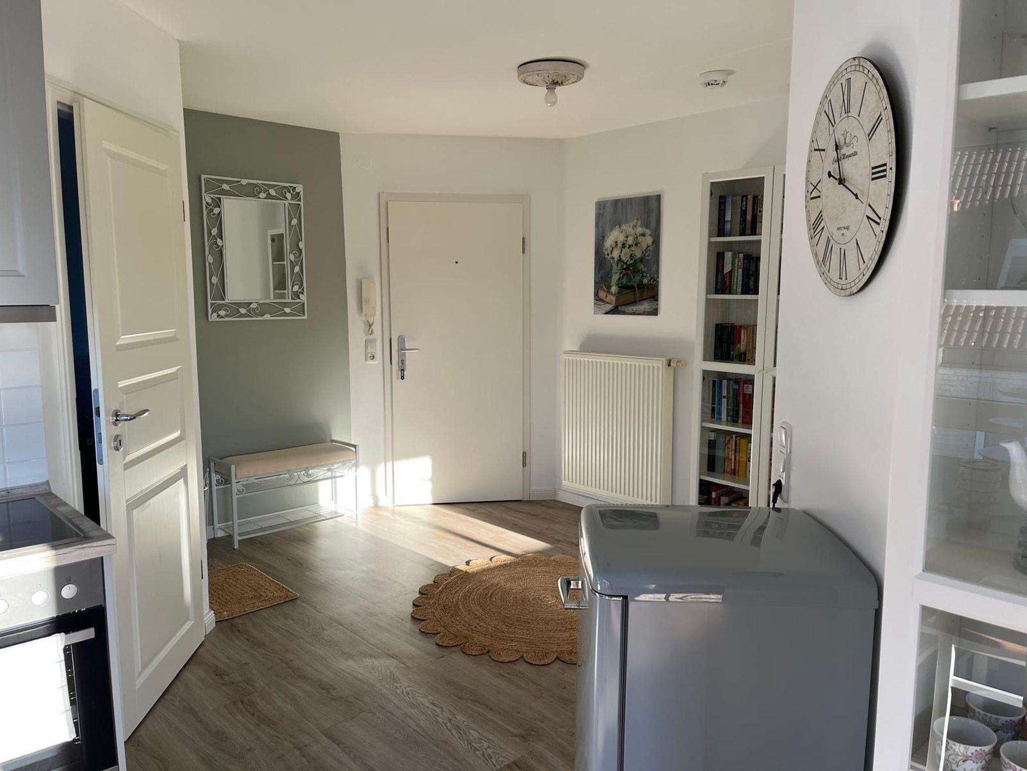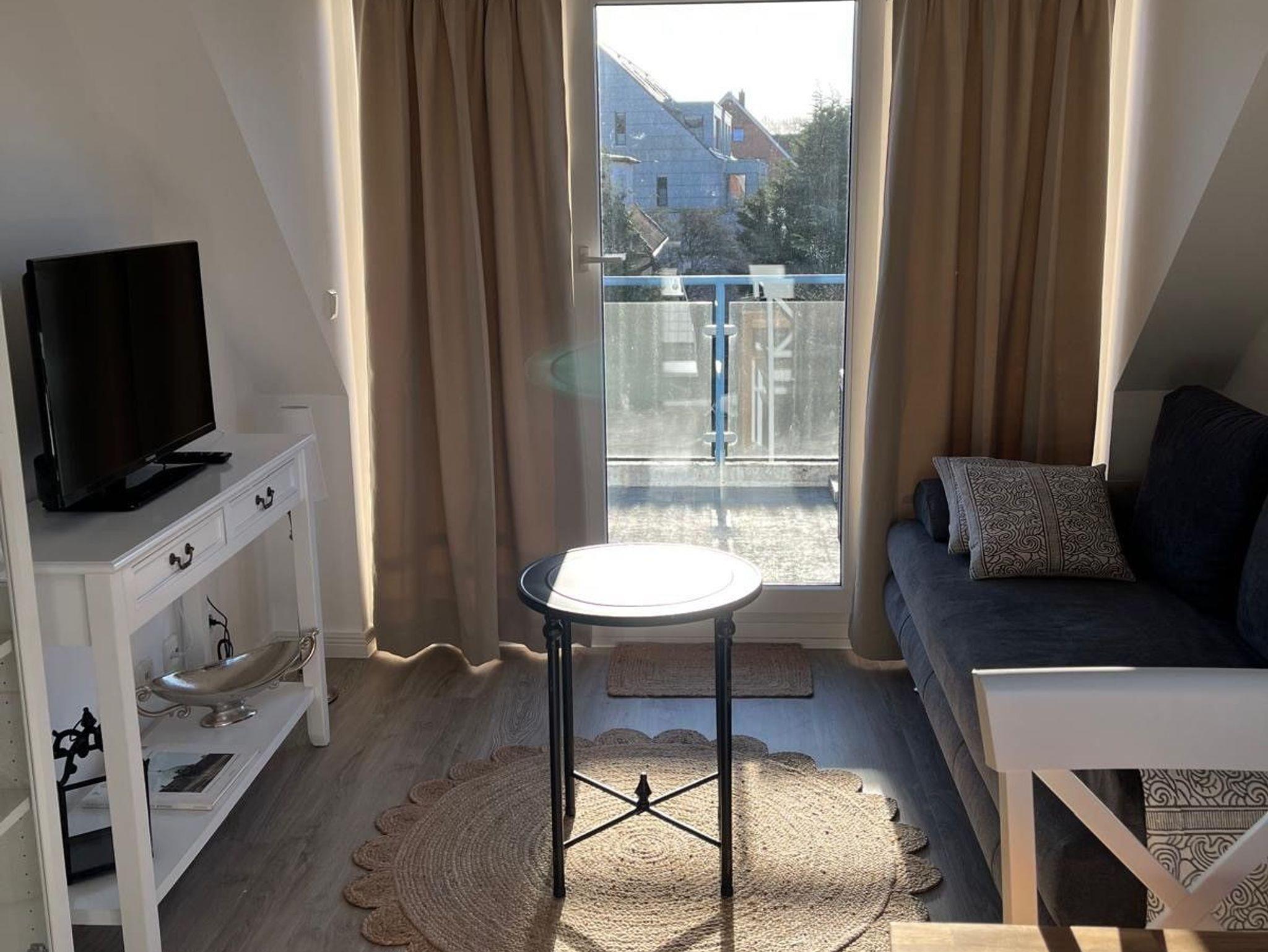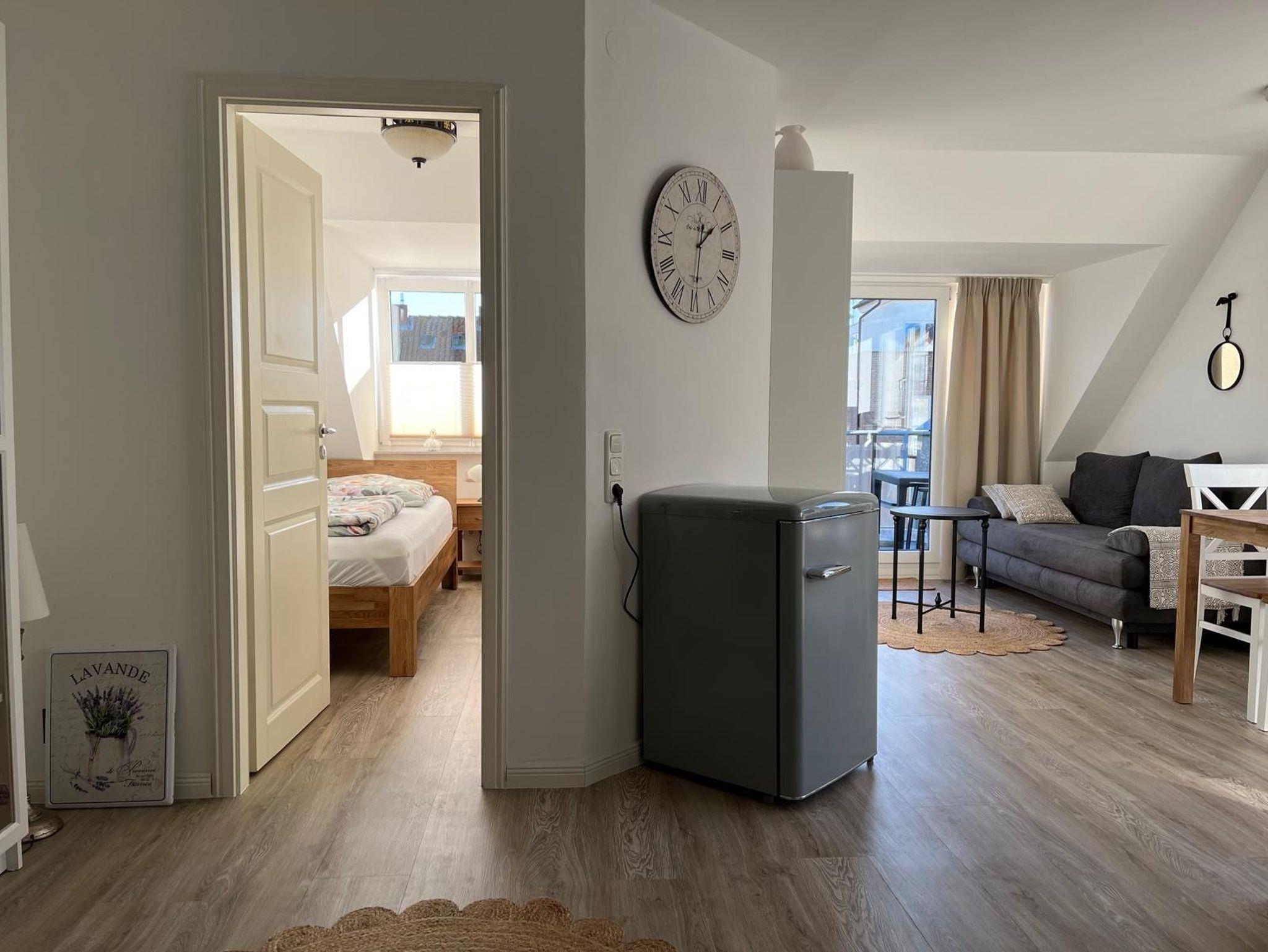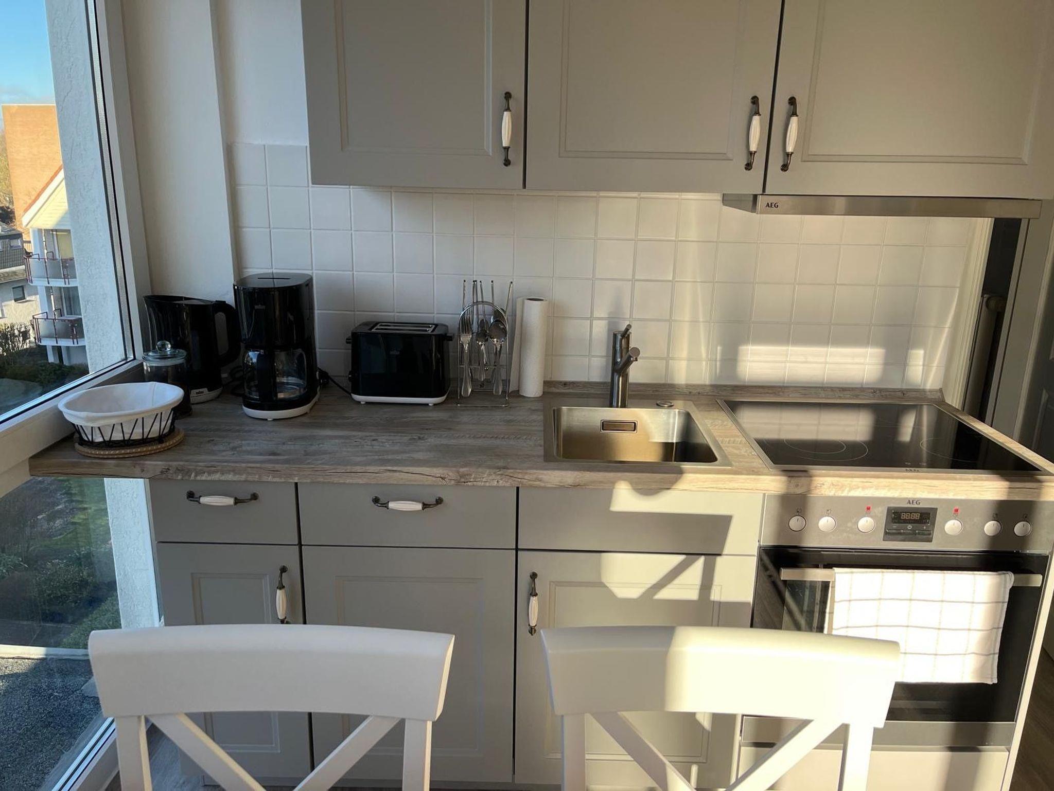 Charmante sonnige 2 Zimmer Wohnung, 36 Quadratmeter, im Landhausstil mit Balkon und Meerblick! Erholung pur! Das Badezimmer ist mit Dusche und WC ausgestattet und hat ein Fenster. Das gemütliche Schlafzimmer verfügt über 2 Einzelbetten 90 x 200 cm, einen Nachttisch und Kleiderschrank. Die offene Einbauküche verfügt über Markengeräte wie Kühlschrank, Backofen, Herd, Geschirrspülmaschine, Umluftabzugshaube, Kaffeemaschine, Toaster sowie Wasserkocher.