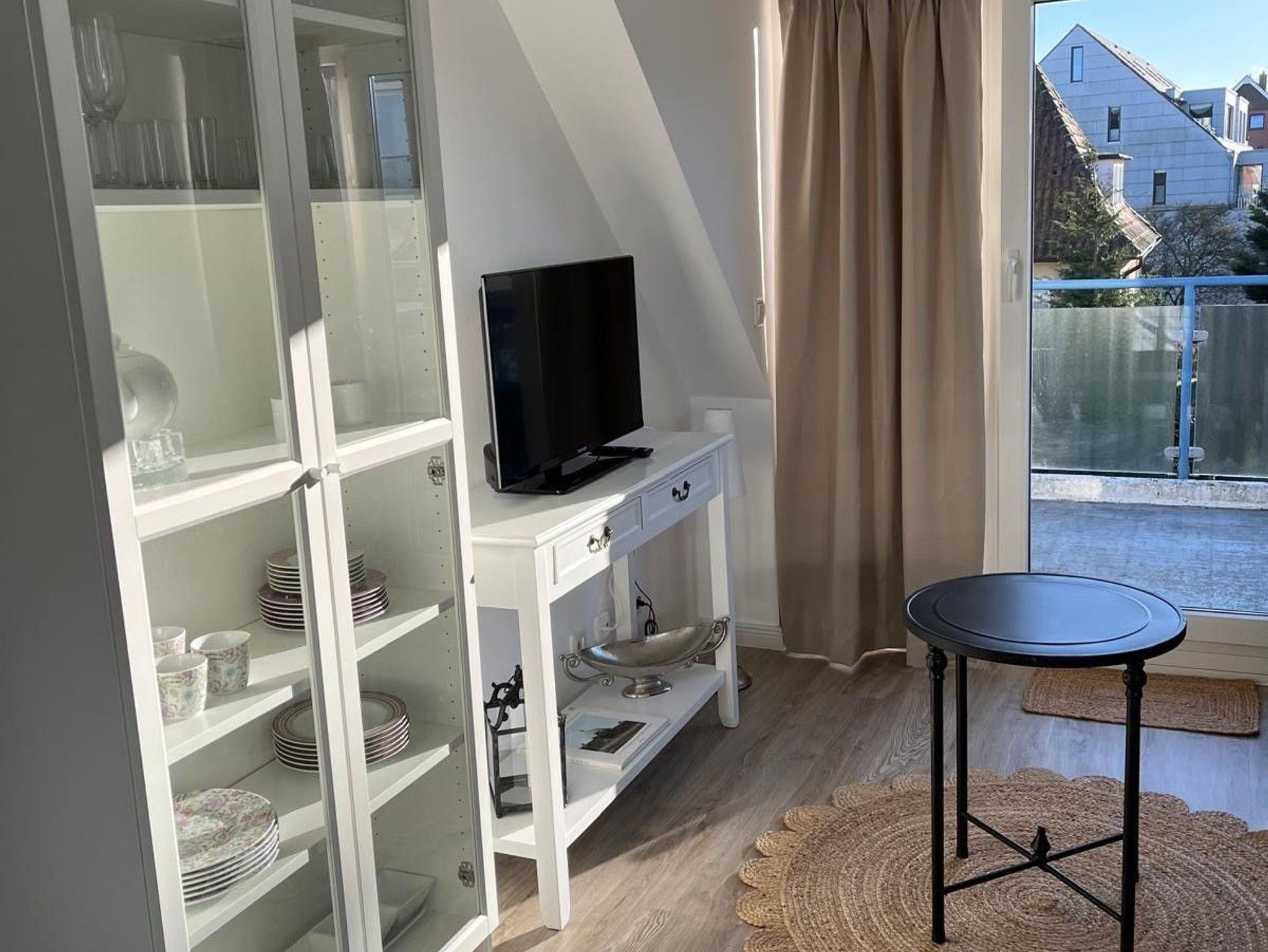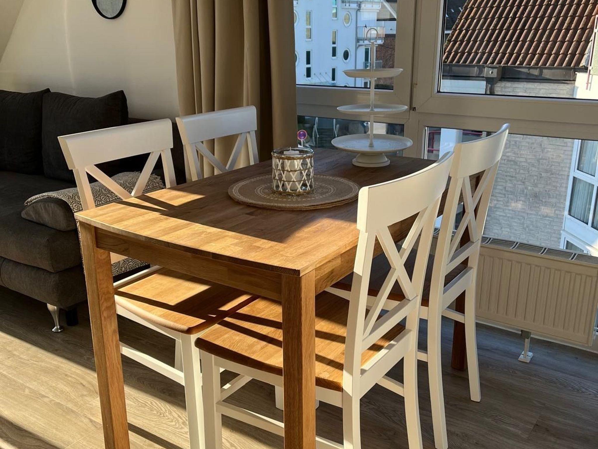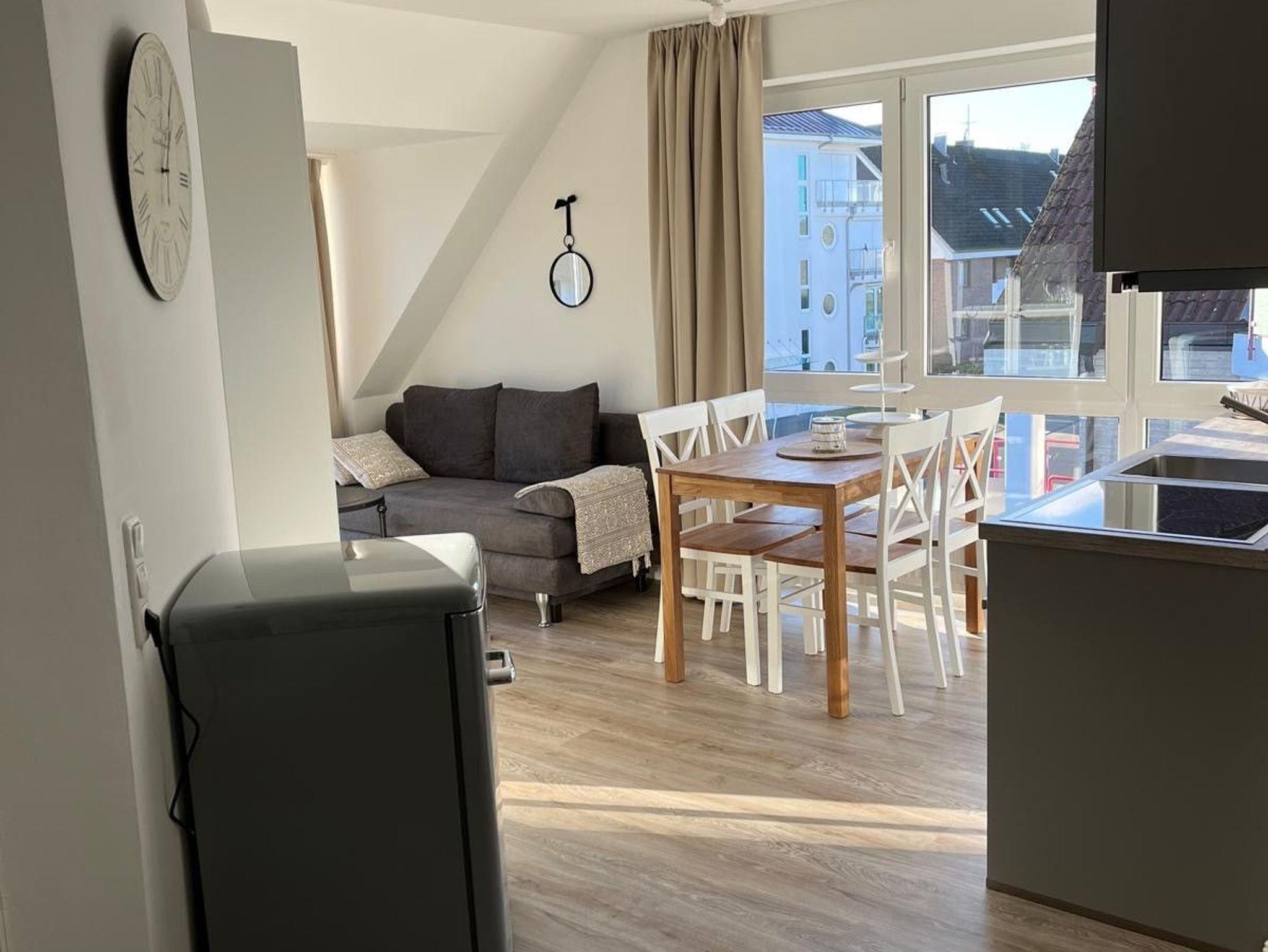 Charmante sonnige 2 Zimmer Wohnung, 36 Quadratmeter, im Landhausstil mit Balkon und Meerblick! Erholung pur! Das Badezimmer ist mit Dusche und WC ausgestattet und hat ein Fenster. Das gemütliche Schlafzimmer verfügt über 2 Einzelbetten 90 x 200 cm, einen Nachttisch und Kleiderschrank. Die offene Einbauküche verfügt über Markengeräte wie Kühlschrank, Backofen, Herd, Geschirrspülmaschine, Umluftabzugshaube, Kaffeemaschine, Toaster sowie Wasserkocher.