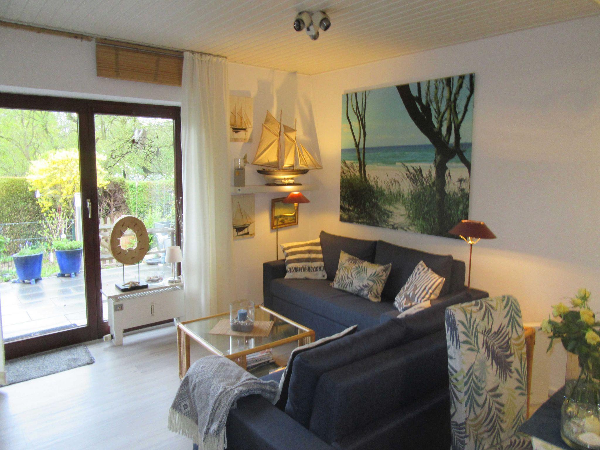 4-Sterne-Ferienwohnung: 2,5 Zi.-Wohnung + großer, eingezäunter Terrasse. Schlafzimmer (großes Doppelbett + TV). Kombinierter Wohn-Essbereich. 43-SONY-TV mit Netflix-Zugang, DVD, Radio, Spiele, Bücher, CD's, DVD's. Essplatz für 4 Personen. Küchenzeile mit Ceran, Backofen, Kühl-/Gefrierkombi, Geschirrspüler, Microwelle etc. Bad/WC mit, Dusche, Föhn. Die Wohnung verfügt über W-LAN, ALEXA, Netflix, Spotify, Festnetztelefon und Waschmaschine. Es stehen 2 Fahrräder zur Verfügung. Gelegentliche Hintergrundgeräusche aus Richtung des Regional-Bahnhofs sind möglich. Ruhige Sackgassenlage. 3 Minuten zum Bäcker und 100m zum Wald. 600m zum Einkaufszentrum und 1.000m zur Promenade.