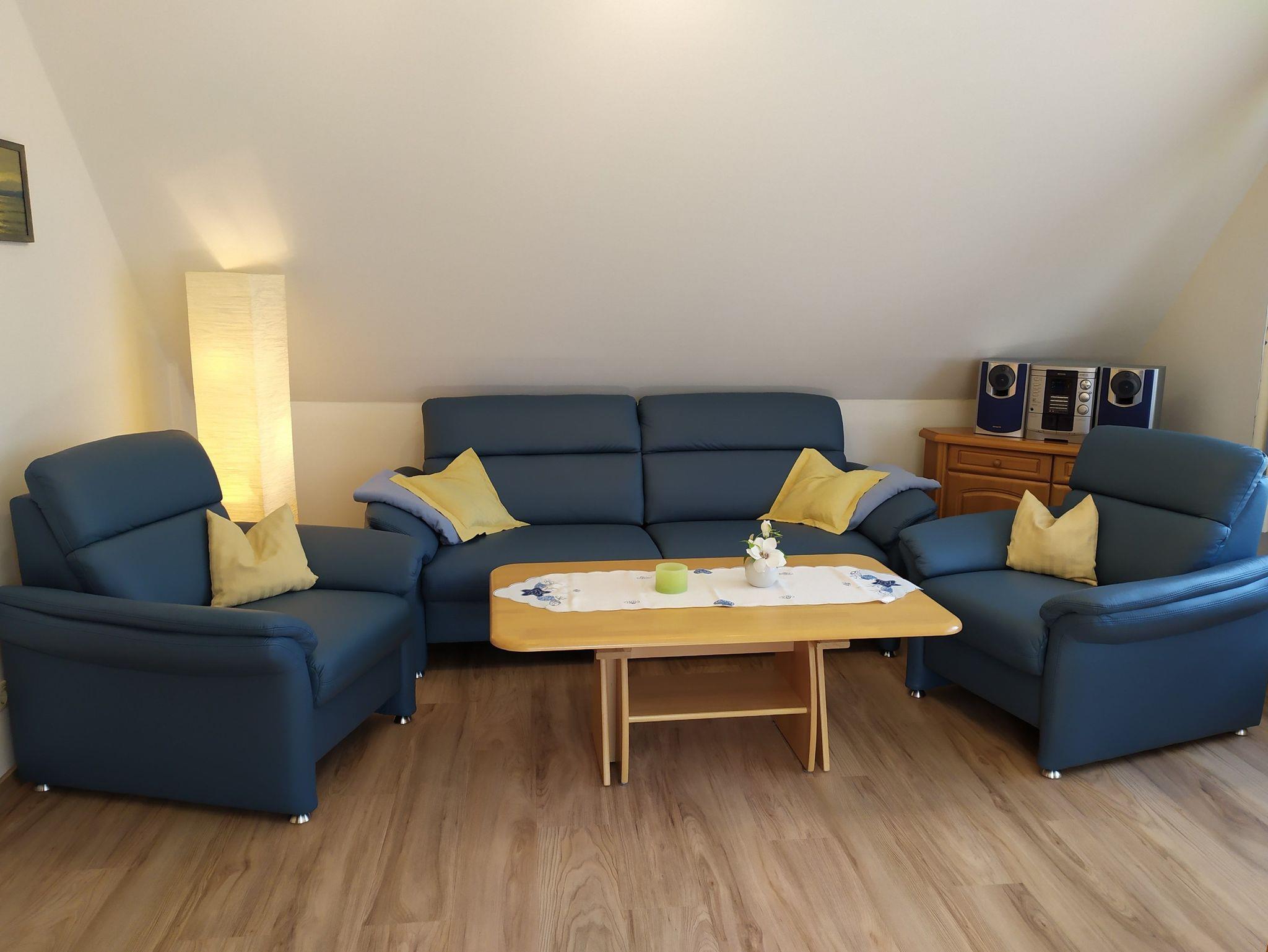 Im modernen Wohn-Schlafraum befinden sich ein Schrank-Doppelbett (1,60 x 1,90m), eine 3-er Couch plus 2 Sessel, ein 40 Zoll großes Flachbild-TV (Kabel), ein DVD-Player, eine Hifi-Anlage, ein Schwingstuhl und ein Esstisch für bis zu 4 Personen. Für gemütliche Abende haben wir Bücher, DVD´s und Spiele für Groß und Klein bereitgestellt.