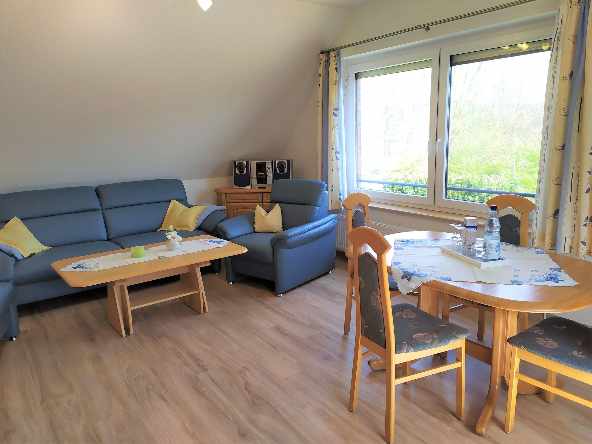 Die Ferienwohnung 4 liegt im 1. Obergeschoss, hat ca. 55 m² und bietet einen wunderschönen Blick in unseren Garten und den direkt angrenzenden Kurpark.