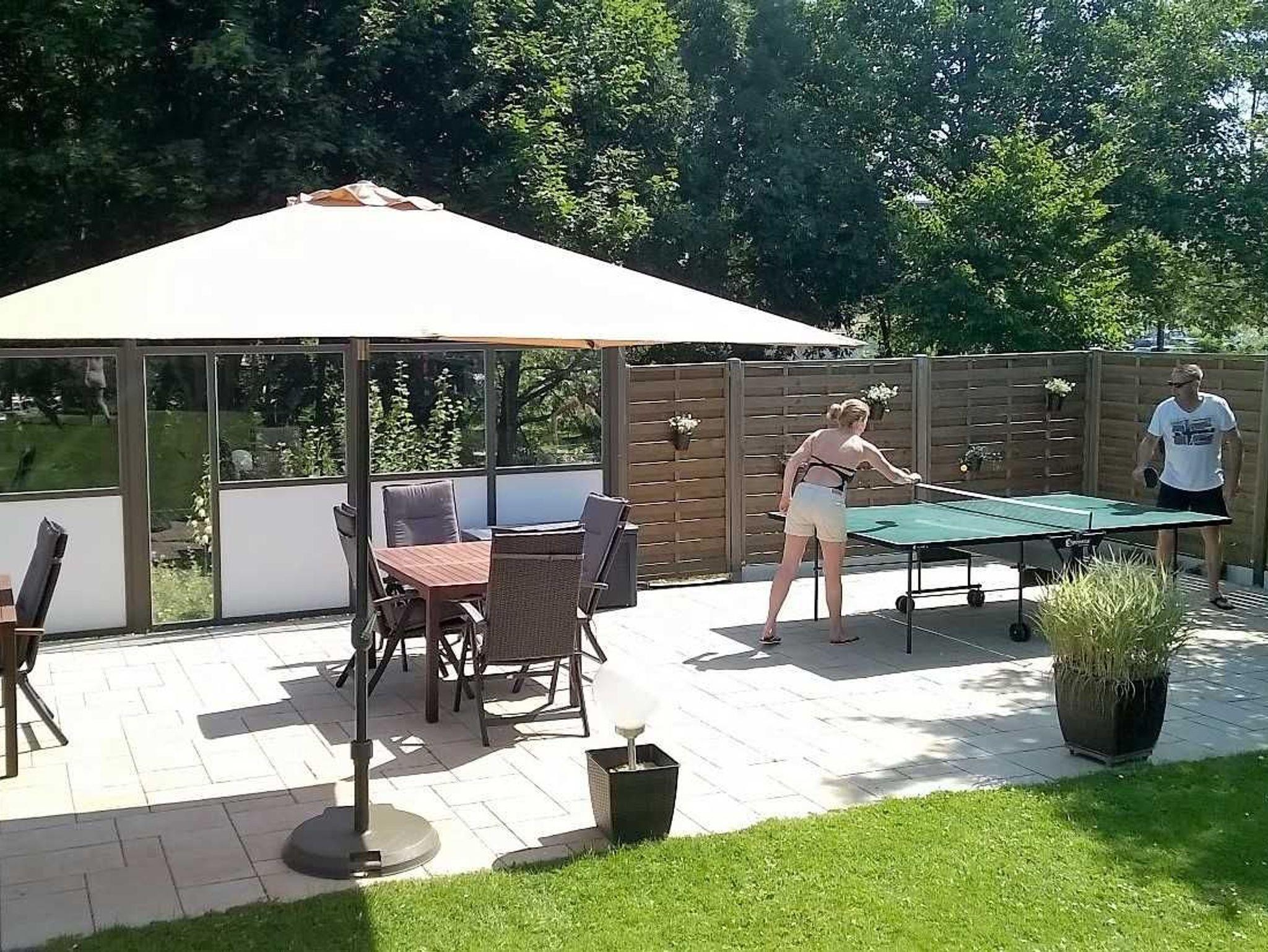 Unser großer Garten mit Liegewiese, Terrasse, Trampolin und Strandkorb lädt zum Relaxen, Spielen, Klönen, Tischtennis oder Grillen ein.