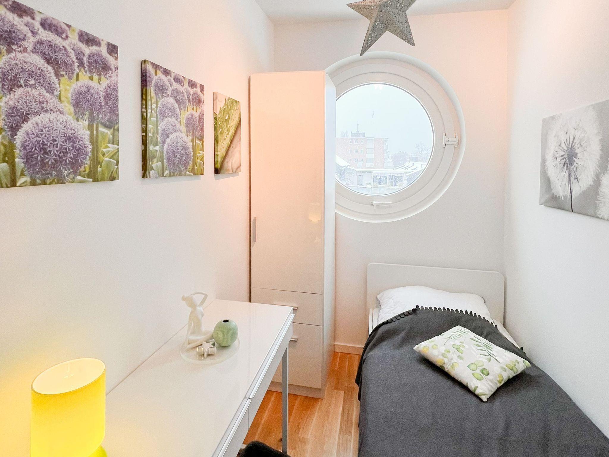Das Scharbüdchen bietet ausreichend Raum für 3 Personen, um einen erholsamen Ostseeurlaub in Strandnähe zu verleben. Die stimmige Inneneinrichtung mit vielen liebevollen Details und die hellen Räumlichkeiten tragen garantiert zum Wohlbefinden bei. Der kombinierte Wohn- Essbereich[nbsp] verfügt über eine moderne Sofaecke mit Sessel, TV und einen schönen Essbereich, der ausreichend Platz für 4 Personen bietet. Die integrierte Einbauküche ist bestens mit allen technischen Geräten ausgestattet. Der vorgelagerte Südbalkon ist mit gemütlichen Gartenmöbeln ausgestattet. Genießen Sie entspannte Sonnenstunden an der frischen Seeluft.[nbsp] Das Schlafzimmer ist mit einem Doppelbett (160x200) und 2 offenen Schränken eingerichtet und verfügt über einen kleinen französischen Balkon, von dem Sie einen seitlichen Blick auf die Ostsee genießen können. Das zweite, kleine Schlafzimmer ist mit einem Einzelbett ausgestattet. Alle Fenster der Wohnung sind mit elektrische Außenjalousien versehen. Das Duschbad ist hochwertig und modern mit reichlich Tageslicht.