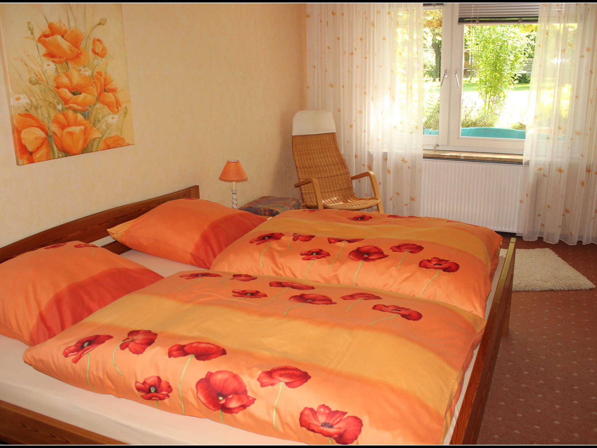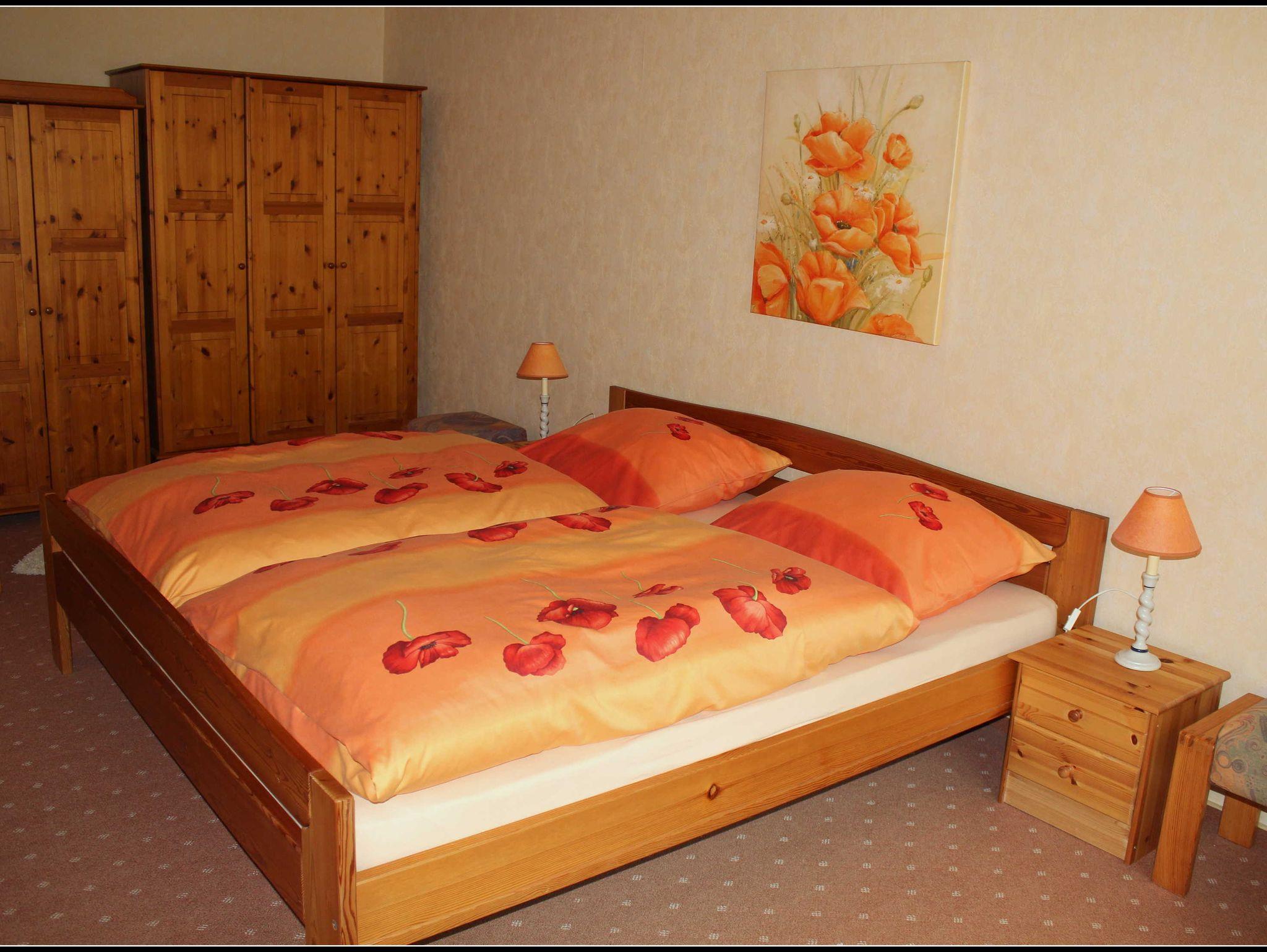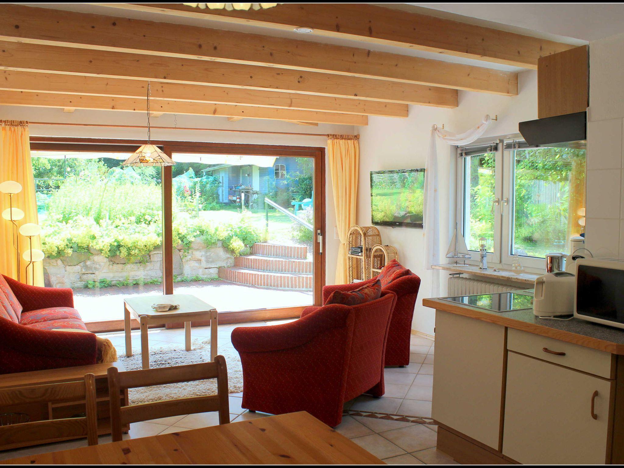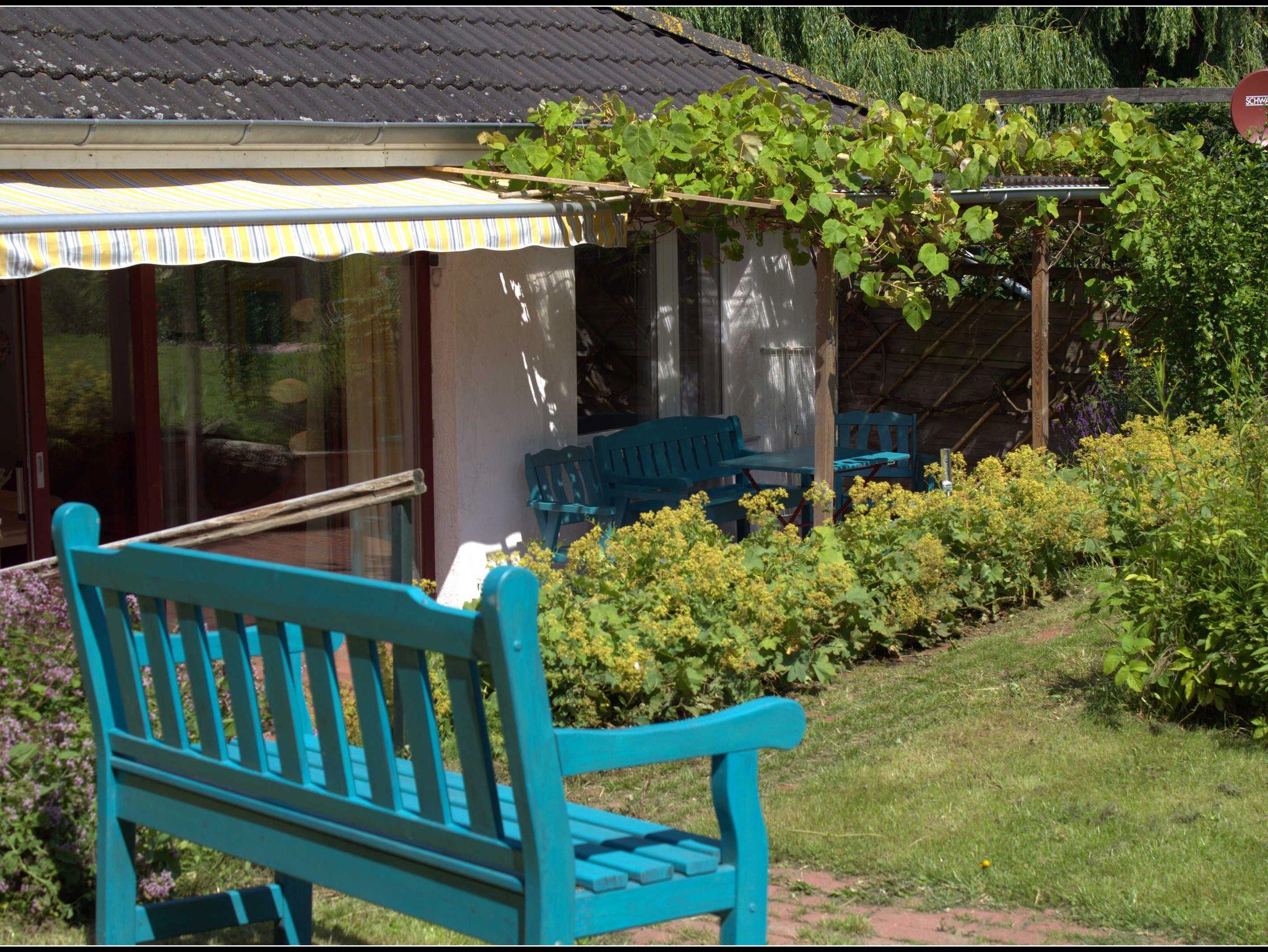 Der ca. 65 m² große Bungalow befindet sich in einem Extrahaus mit separatem Eingang. Die Gäste gelangen ohne Stufen in die Unterkunft, da diese sich im Parterre befindet. Die große Terrasse mit einem überdachten Freisitz lädt zum gemütlichen Beisammensein ein. Der kleine Bungalow besteht aus einem kombinierten Wohn-/Essraum mit Essplatz und Fünfer-Sitzgruppe als Polstergarnitur, Sat-TV, intergierter Küchenzeile mit Ceranfeld/Herd und Mikrowelle. 2 separate Schlafräume mit Elternzimmer mit einem Ehebett und einem Kinderzimmer mit einem Etagenbett. Ein Kinderbett sowie ein Einzelbett für eine erwachsene Person kann je nach Wunsch in einem der Schlafzimmer beigestellt werden.