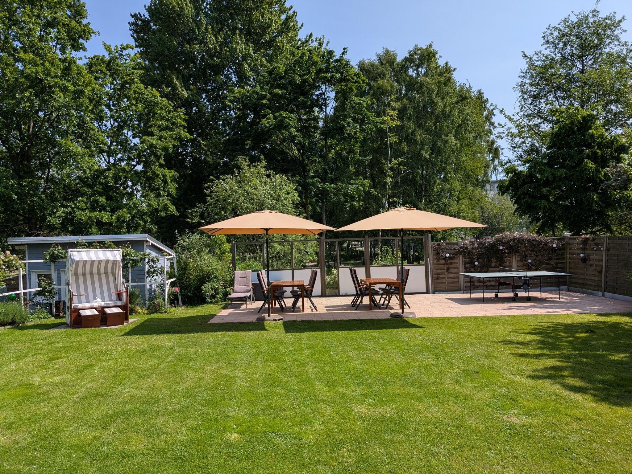 Unser großer Garten mit Liegewiese und Terrasse lädt zum Relaxen, Spielen, Klönen, Tischtennis oder Grillen ein.