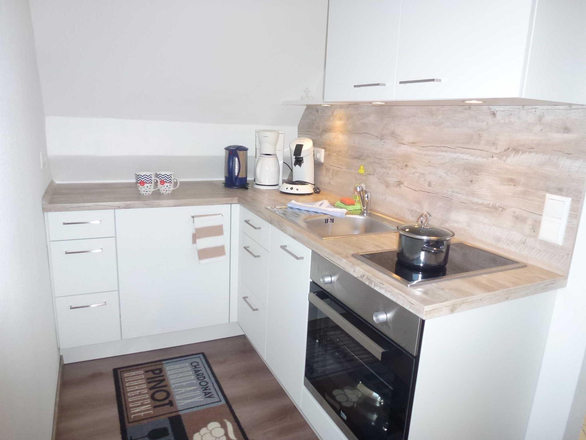 Die kleine Küchenzeile ist komplett ausgestattet. Hier befinden sich Geschirr, Kaffeemaschine, Senseo-Padmaschine, Wasserkocher und ein Toaster.