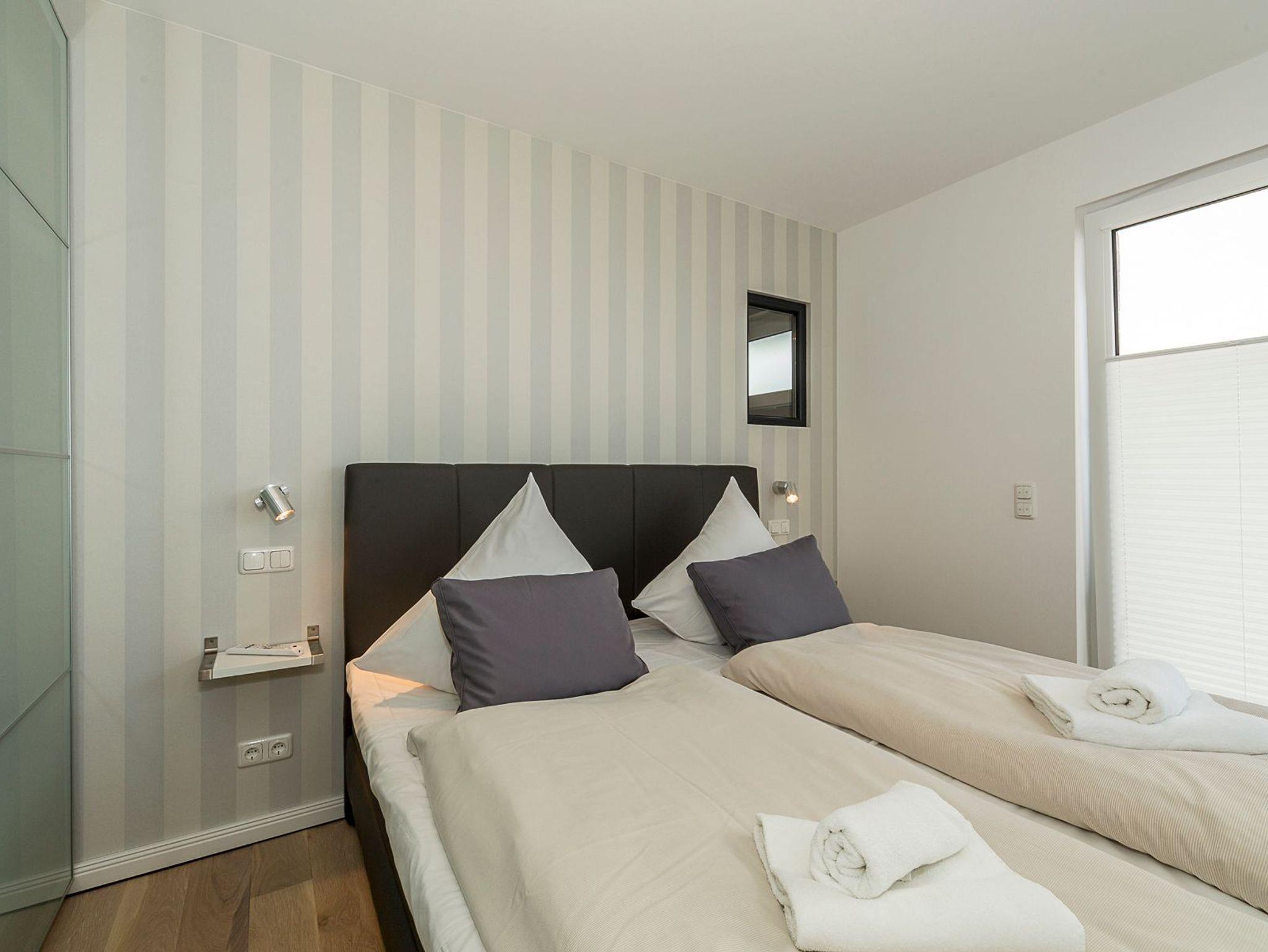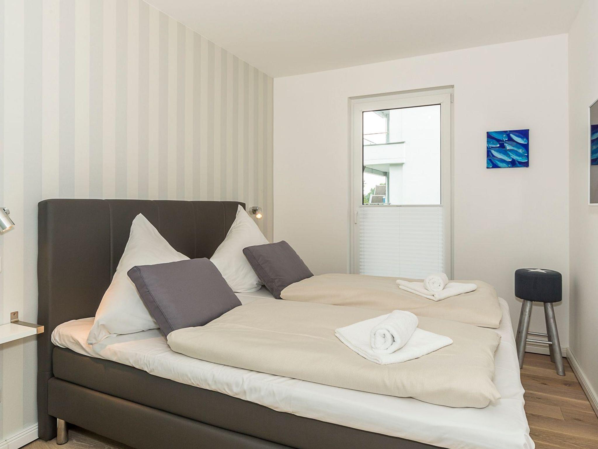 3-Zimmer-Ferienwohnung, ca. 66 m²,[nbsp] für bis zu vier Personen mit zwei Schlafzimmern, Duschbad, Balkon nach Südwesten sowie einer Terrasse nach Westen und Norden, seitlichem Meerblick, Kfz-Außenstellplatz, WLAN, Strandkorb gegenüber am Strand (saisonbedingt 15.05. - 15.09.).