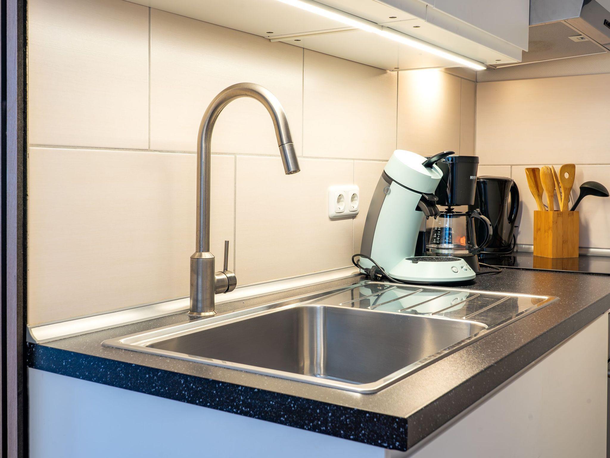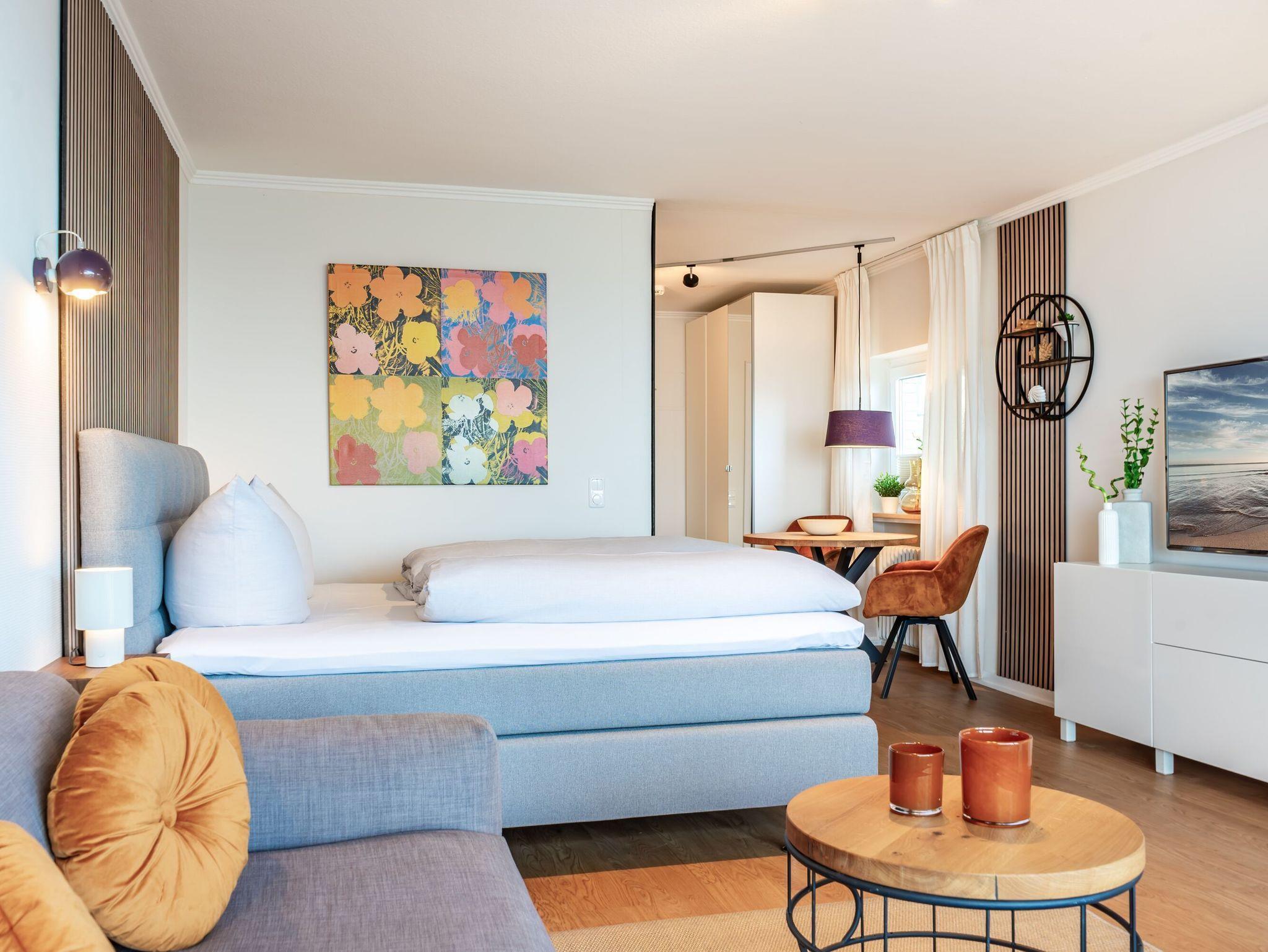 Diese 1-Zimmerwohnung bietet Platz für bis zu 2 Personen. Verschiedene Design-Klassiker sorgen für eine stylische und gleichzeitig gemütliche Atmosphäre. Es erwarten Sie ein bequemes Schlaraffia Boxspringbett (1,80x2,00m) und eine elegante Designer-Wohnzimmercouch von Rolf Benz, von welcher aus Sie den traumhaften Blick auf die Ostsee genießen können. Ein modernes Duschbad mit Kosmetikspiegel, eine Küchenzeile mit einem Geschirrspüler, einer Senseo-Kaffeemaschine sowie einer Filterkaffeemaschine und einem Wasserkocher, WLAN und ein Flachbildfernseher runden das Angebot ab. Die große Terrasse mit Blick auf die Ostsee lädt zum Outdoor-Living ein. Durch die Terrassenbauweise des Hauses können Sie hier viele Sonnenstunden genießen. Für Ihren PKW steht Ihnen hinter dem Haus ein Stellplatz zur Verfügung. Falls Sie eigene Fahrräder mitbringen möchten, können Sie diese in einer, nur zu dieser Wohnung gehörenden, abschließbaren Fahrradbox unterbringen.