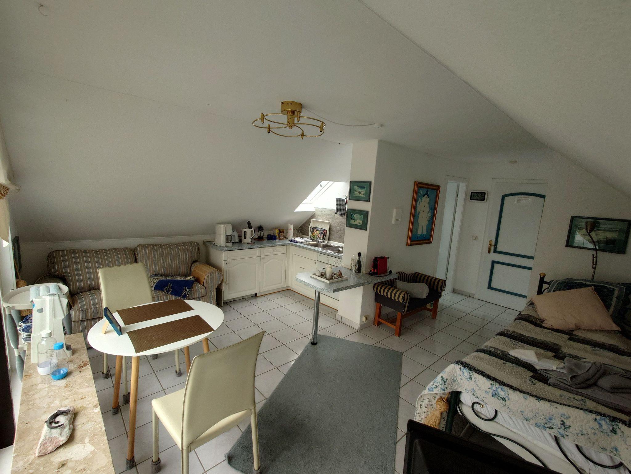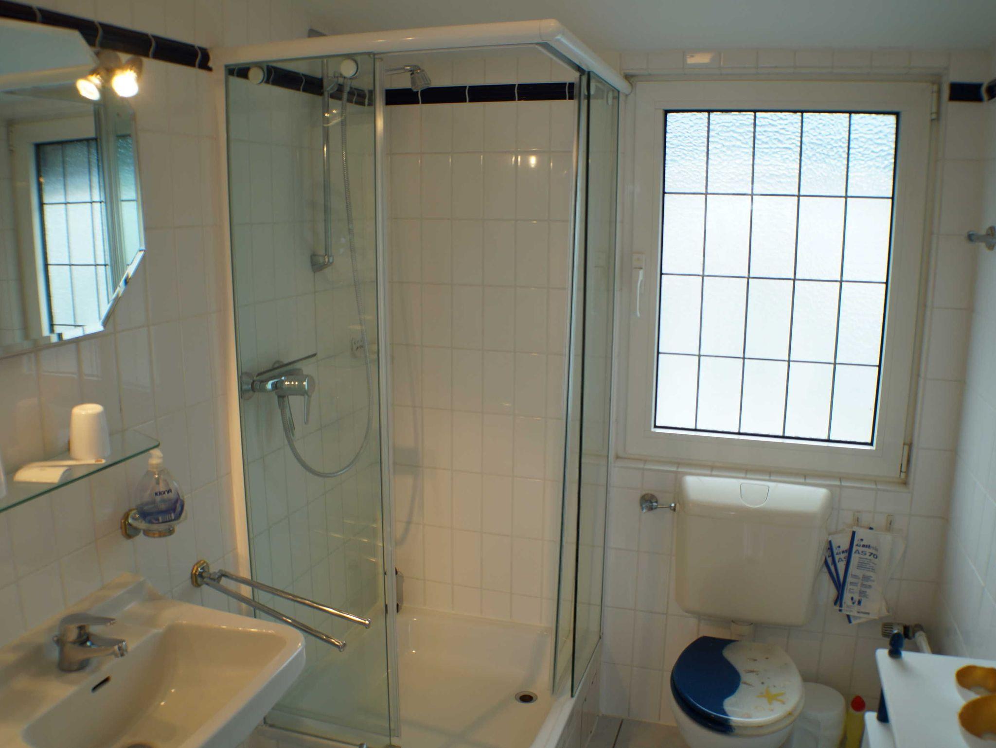 1. Obergeschoss: 1-Raum-Singlewohnung mit ca. 30 m², mit großem Studiofenster, incl. Küchenzeile und Ess-Bar, franz. Bett (2,00 x 1,40 m, Einstiegshöhe: 60cm). Separate Dusche mit DK-Fenster, WC, stationärer Schminkspiegel, Fön. Ein begehbarer Kleiderschrank sowie Fensterlüftung. Gartenbenutzung mit Sitzplatz, Tisch und Stühlen.