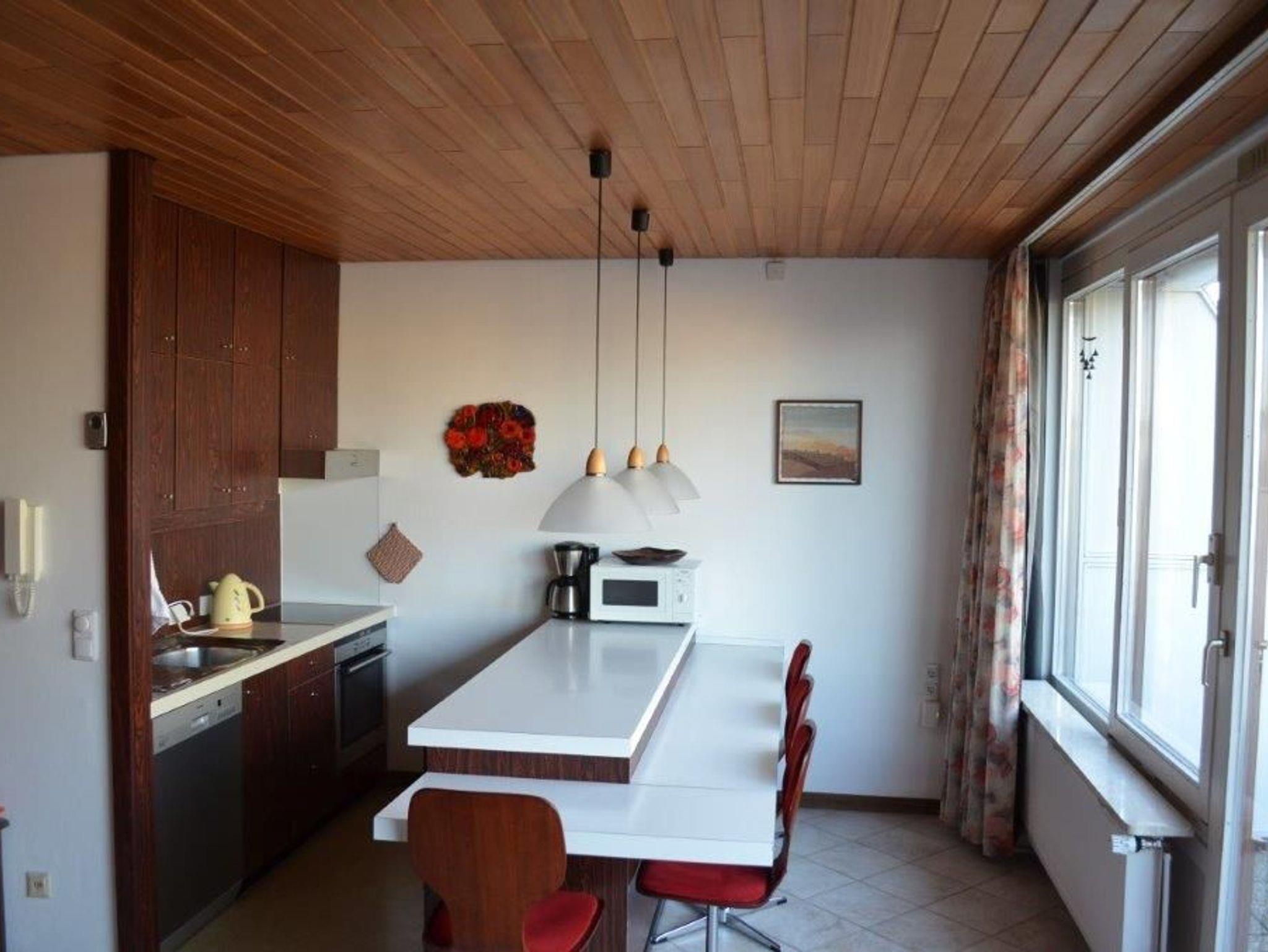 In der offenen Küche finden sich ein E-Herd mit Ceran-Kochfeldern, ein Backofen, Geschirrspüler, Kühlschrank mit TK-Fach, Mikrowelle und 4 Essplätze.