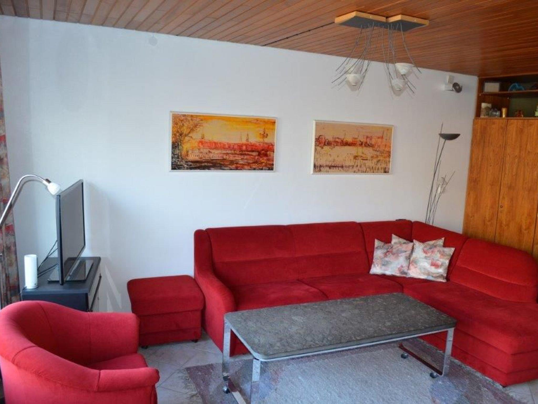Im Wohnzimmer stehen eine große Eck-Couch-Garnitur mit einem Sessel sowie Hocker, Couchtisch, Flachbild-TV und Stereo-Radio.