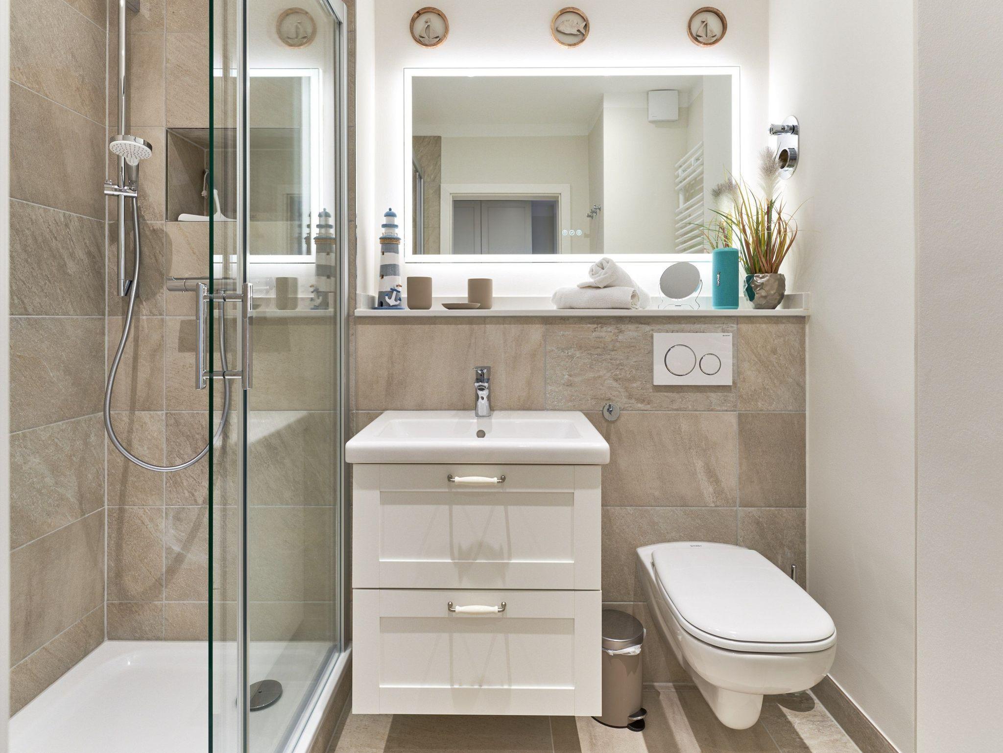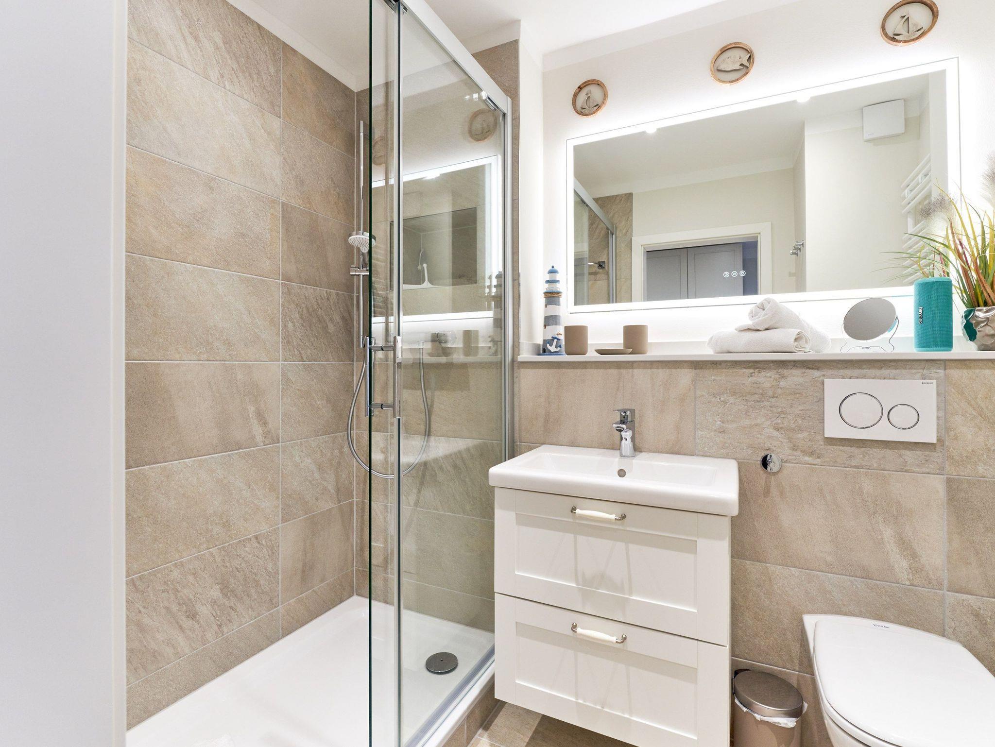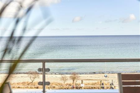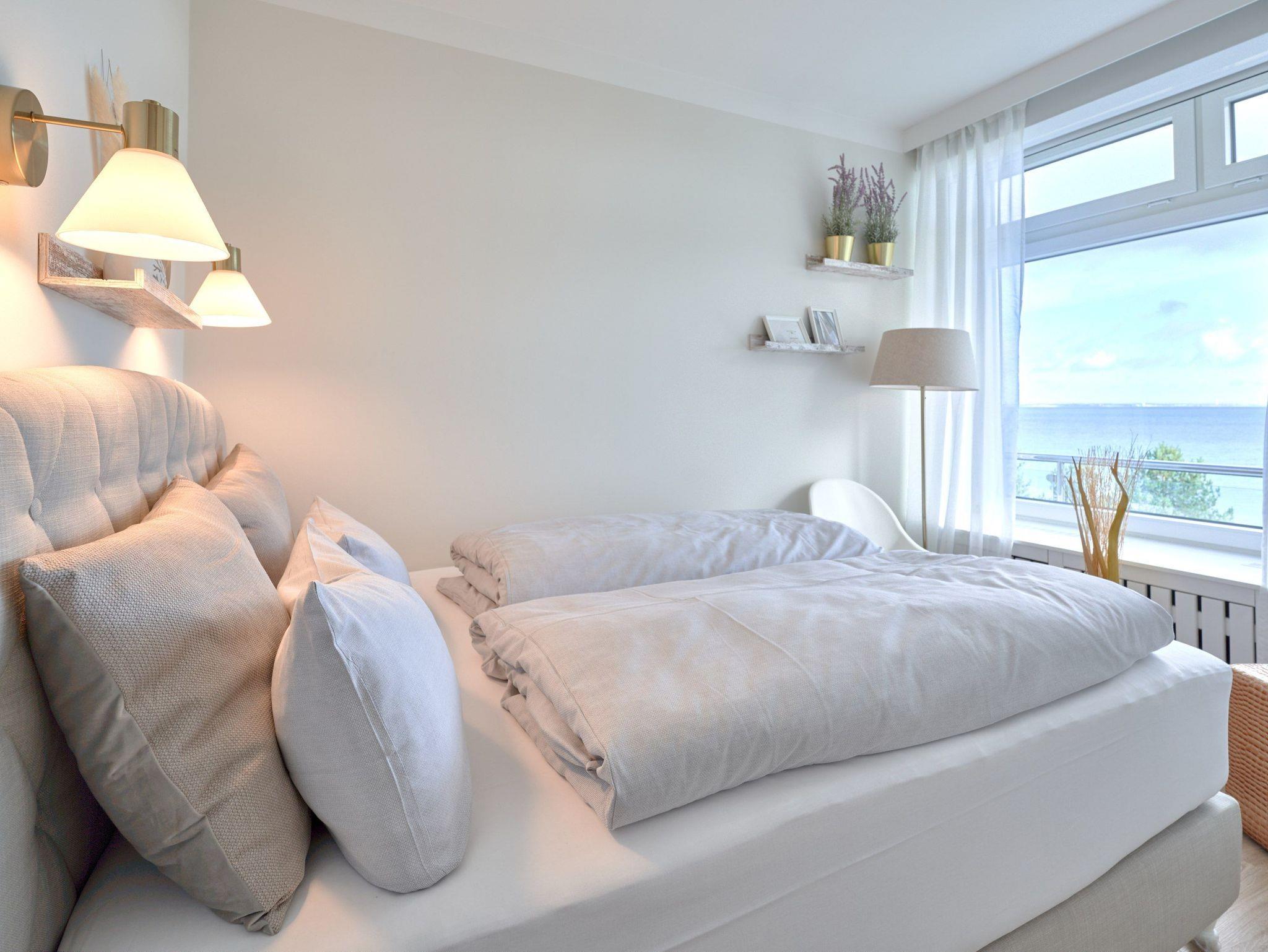 Das Schlafzimmer ist mit einem Boxspringbett (1,60 x2,00m) ausgestattet. Auch von hier blicken Sie auf die Ostsee! Das Schlafzimmer sowie das Wohnzimmer haben Rollläden zum Verdunkeln. Feines Duschbad, ausgestattet mit einem Handtuchheizkörper, XXL-Dusche, Fön, Kosmetikspiegel und Ablagen. Im Flurbereich stehen Ihnen ein großzügiger Kleiderschrank sowie Garderobe und Büchertauschecke zur Verfügung.