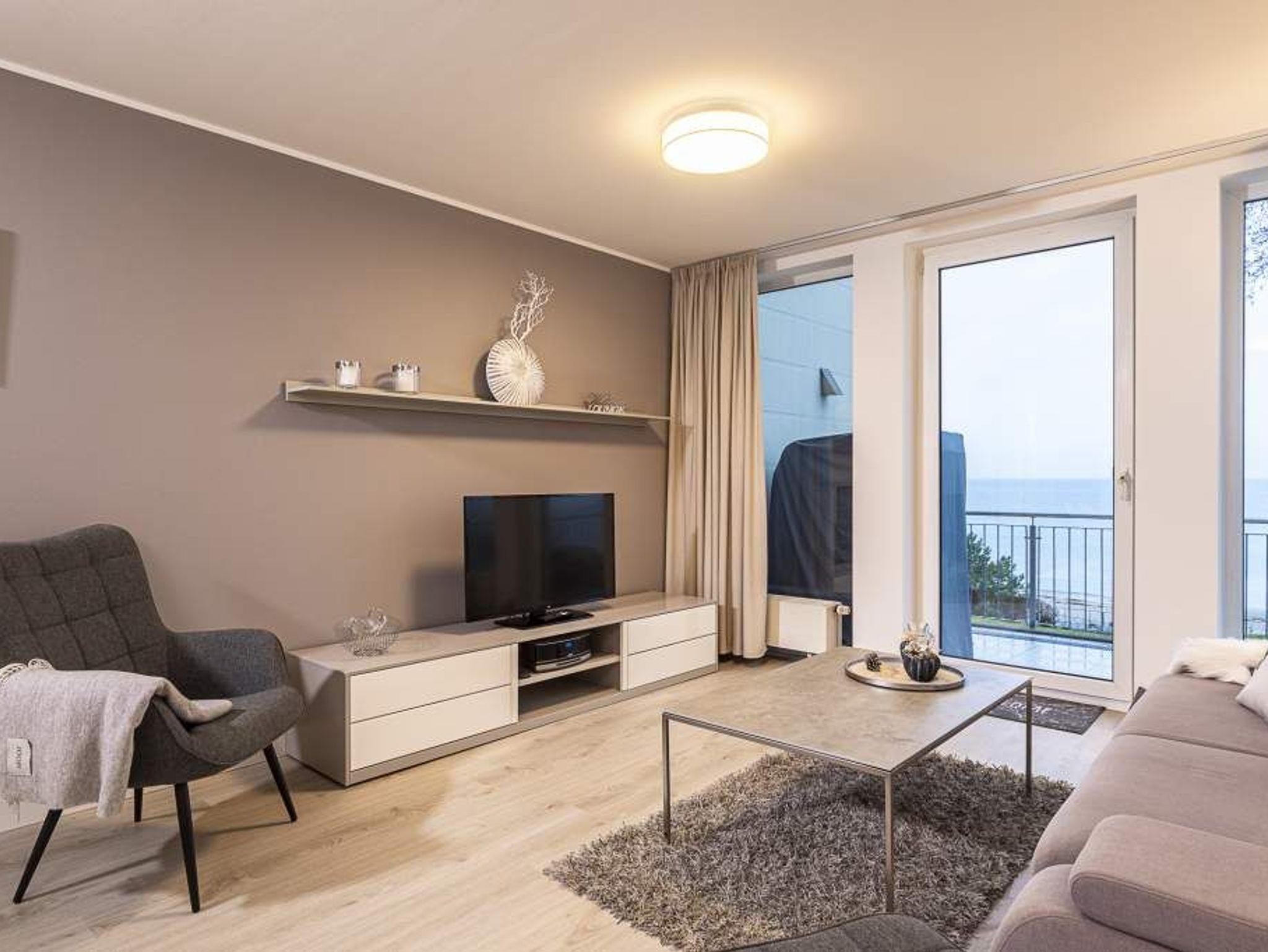 Diese helle 3-Zimmer-Ferienwohnung bietet Ihnen neben dem traumhaften Blick auf die Lübecker Bucht auch den Blick ins Grüne, mit Nachmittagssonne. Der Wohn- und Essbereich ist geschmackvoll und freundlich eingerichtet und verfügt über ein bequemes Sofa, welches sich in wenigen Handgriffen zu einem Schlafsofa umgestalten lässt, und zwei Sessel. Kostenloser WLAN-Zugang, Flachbildfernseher. Vom Wohnzimmer treten Sie hinaus auf den ersten Balkon (Richtung Süd/Osten), hier empfängt Sie ein phantastischer Meerblick, den Sie vom dort befindlichen Strandkorb genießen können. Die offene Küche ist in den Wohn-Essbereich integriert. Das erste Schlafzimmer verfügt über den Zugang zum zweiten Balkon. Das Schlafzimmer ist mit einem Doppelbett (1,60 x 2,00m), einem Kleiderschrank sowie mit einer Anrichte / TV ausgestattet. Auf dem 2. Balkon Richtung Südwest können Sie den Blick ins Grüne und die Mittags- bzw. Nachmittagssonne genießen. Das zweite Schlafzimmer verfügt über ein sehr bequemes Schrankbett (1,40 x2,00m). Hier haben Sie die Möglichkeit, den Raum tagsüber z. B. für Ihre Kinder als Spielzimmer oder als Lesezimmer zu nutzen. Selbstverständlich steht Ihnen auch hier ein TV-Gerät zur Verfügung. Das in heller Optik gehaltene Badezimmer ist mit einer Wanne mit Duschvorrichtung ausgestattet.