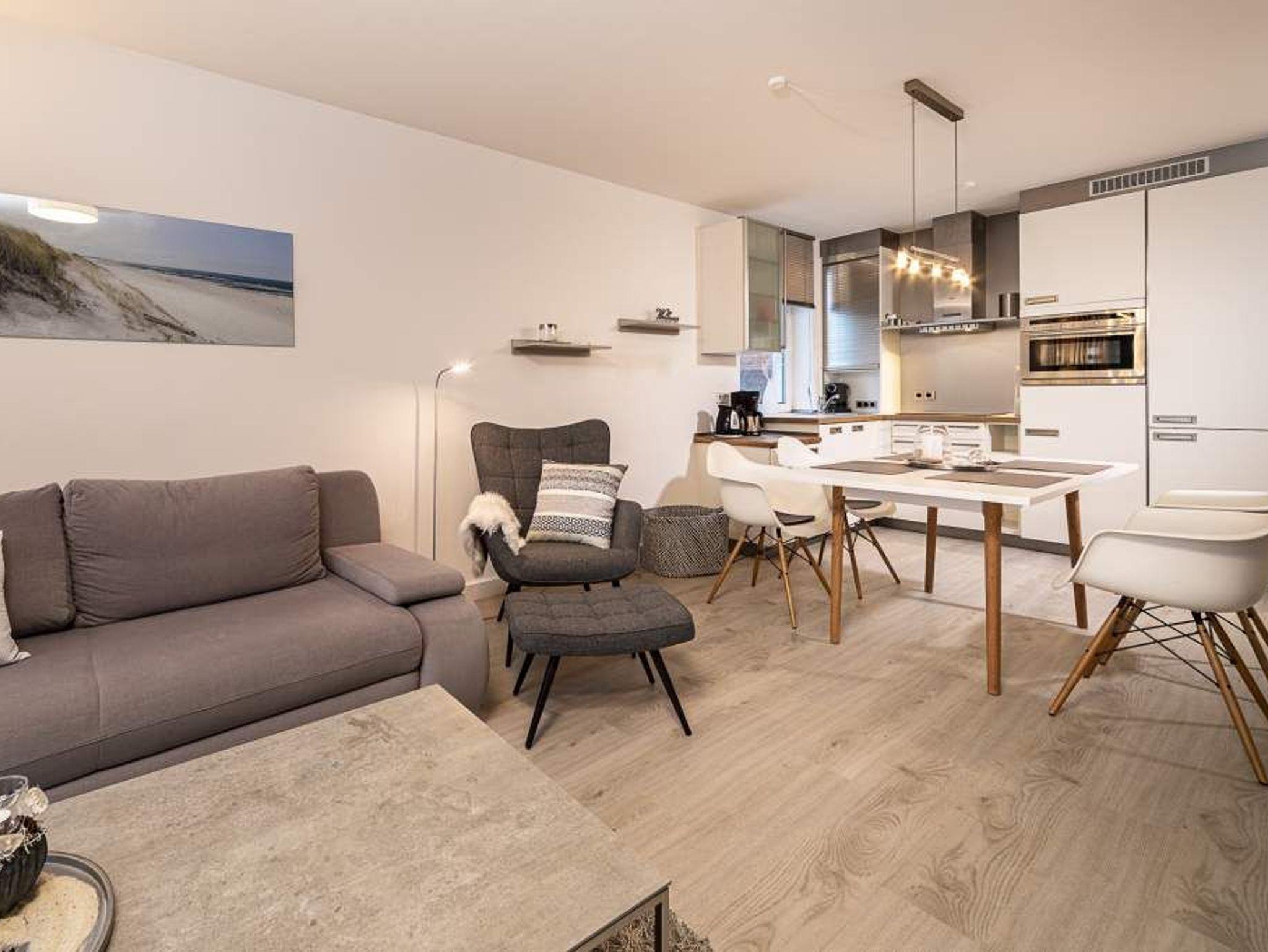 Helle und freundliche 3-Zimmer-Ferienwohnung, ca. 70 m², für bis zu 4 Personen mit 100% Meerblick, zwei Balkonen, Wannenbad, Waschmaschine, Fahrstuhl und Tiefgaragenstellplatz, Einfahrtshöhe 1,90 m.