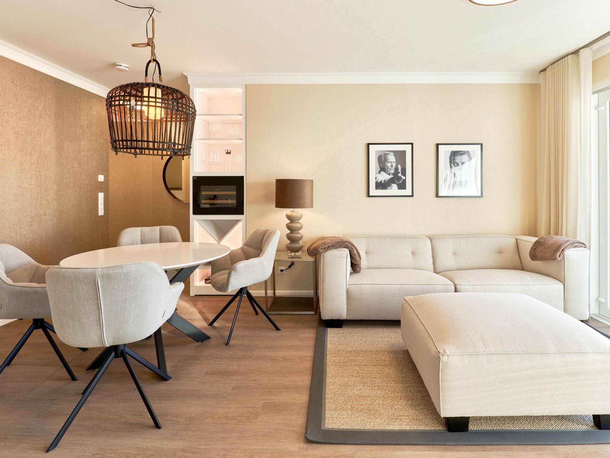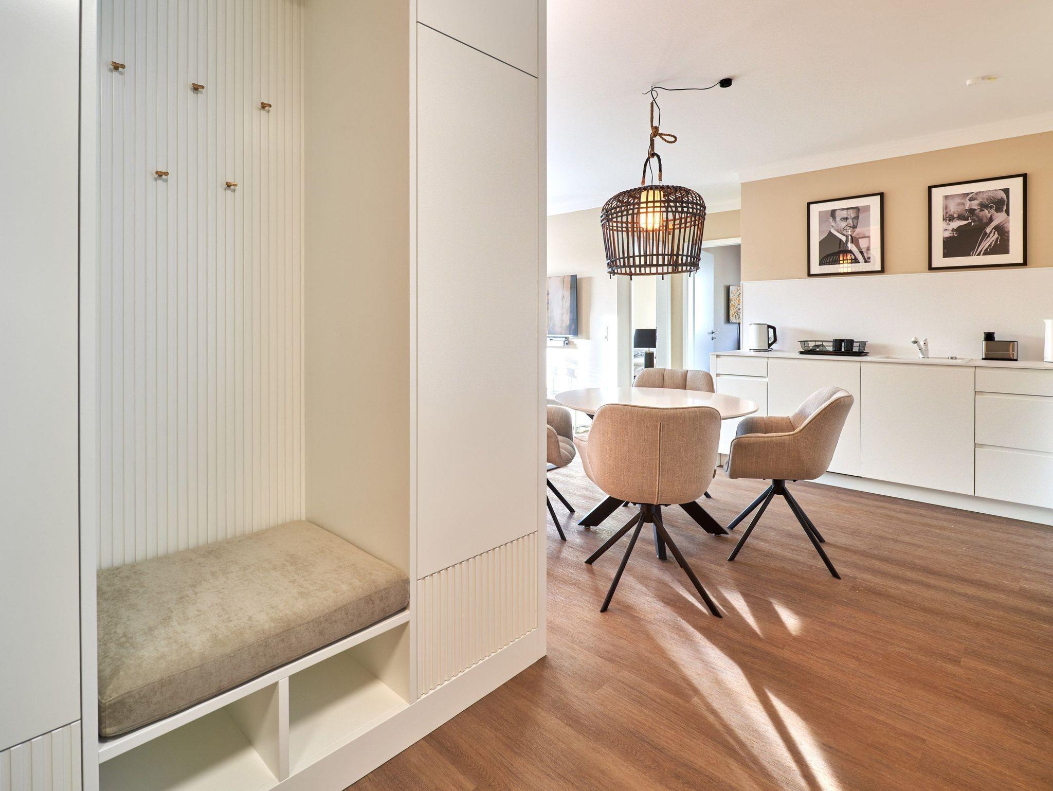 Diese Design-Ferienwohnung zeichnet sich durch eine moderne, stylische und exklusive Inneneinrichtung (Markenhersteller und individuelle Tischlereinbauten) aus, die bis ins Detail aufeinander abgestimmt ist. Die Küche in heller Optik ist mit hochwertigen Einbaugeräten ausgestattet. Neben einer Kaffeemaschine steht Ihnen auch eine Nespresso-Maschine zur Verfügung. Spülmaschine, Induktionsherd, Weinkühlschrank und vieles mehr gehören ebenso zu der sehr guten Ausstattung. Freuen Sie sich auf diese feine Wohlfühlwohnung. Im Wohnzimmer steht Ihnen ein Entertainment-Smart-TV in 55 zur Verfügung. Das Soundbar-System kann per Bluetooth mit einem Smartphone / Tablet angesteuert werden. Im ansprechenden Wohn-Essbereich können Sie die Seele baumeln lassen.