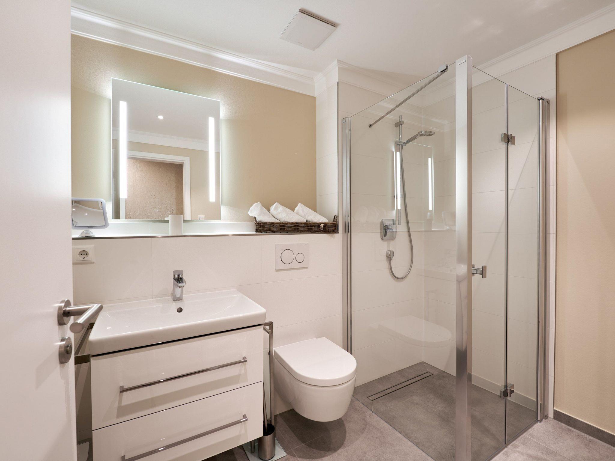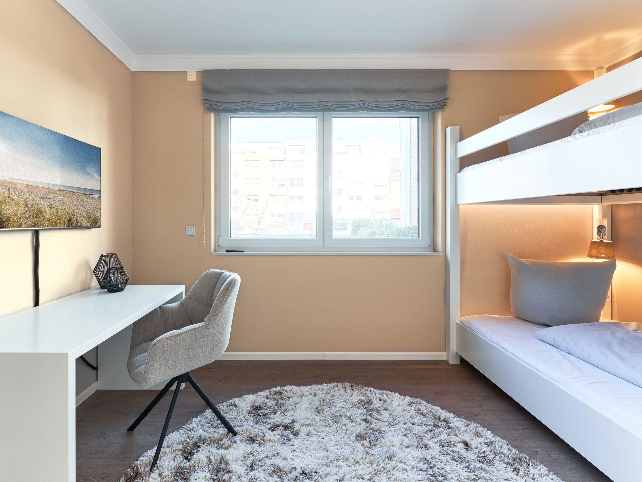 Das erste Schlafzimmer ist mit einem bequemen Doppelbett (1,80 x 2,00m), einem Smart-TV (43) sowie mit einem Kleiderschrank ausgestattet. Im 2. Schlafzimmer stehen für Sie ein hochwertiges Etagenbett (1,20 x 2,00m), angrenzend ein Einbauschrank sowie ein Schreibtisch, angefertigt in hochwertiger Tischlerarbeit, sowie ein TV (43) bereit. Alle Räume lassen sich durch Außenrollläden verdunklen. Das Duschbad ist mit einem Handtuchheizkörper und einer bodengleichen Dusche ausgestattet. Kosmetikspiegel und Haartrockner sind hier selbstverständlich vorhanden.