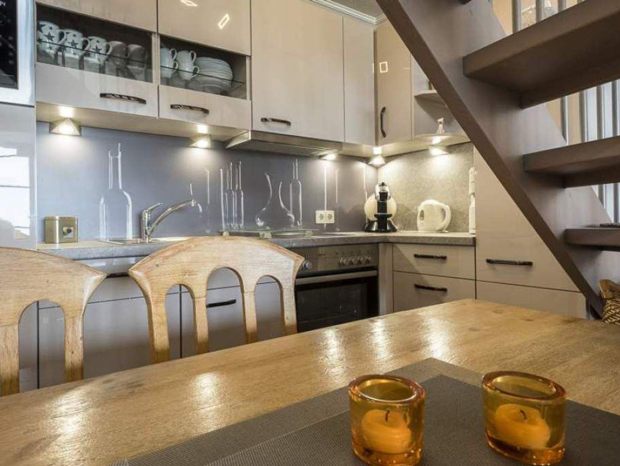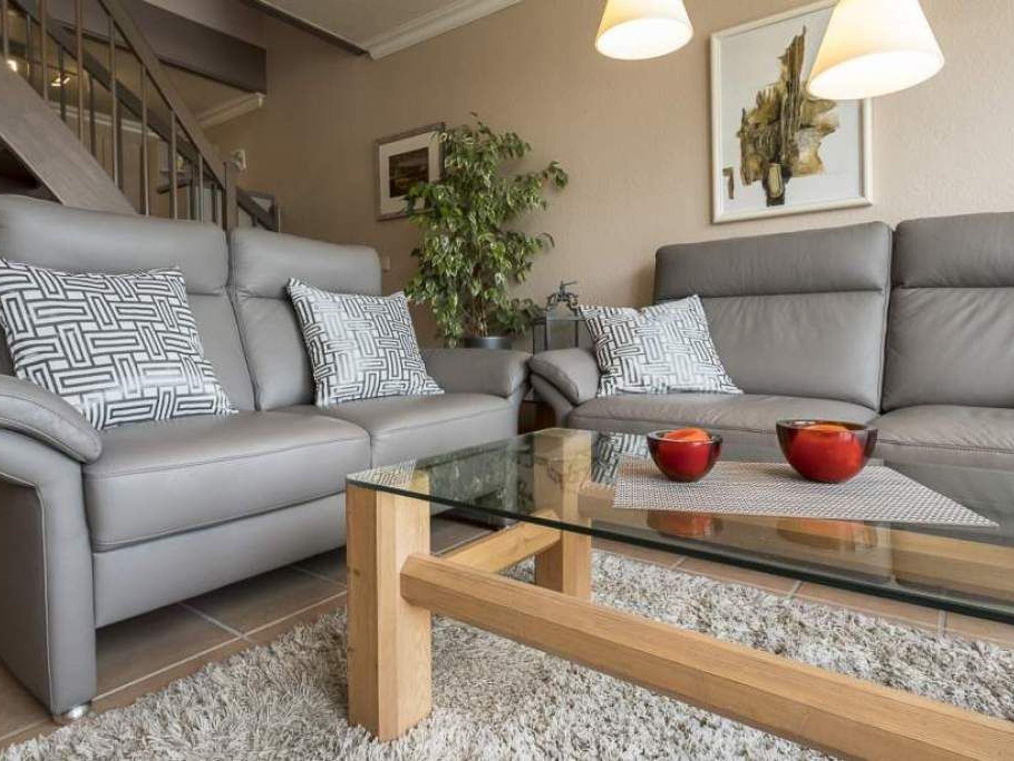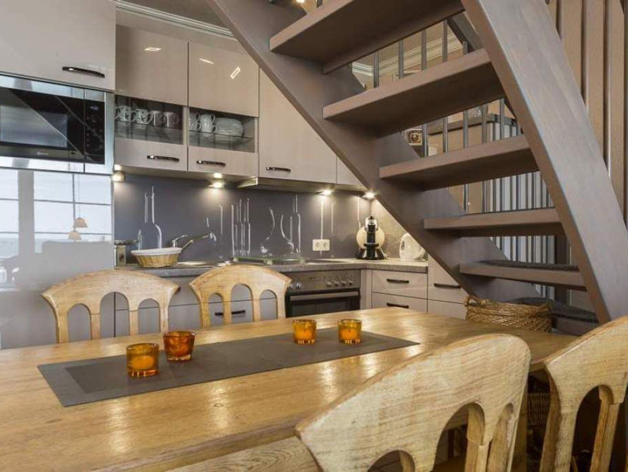 Im unteren Bereich erwartet Sie das erste Schlafzimmer, ausgestattet mit einem Doppelbett (1,80 x 2,00m) und einem geräumigen Kleiderschrank. Das untere Bad verfügt über eine Dusche. Der Wohn-Essbereich ist mit einem Esstisch und mit gemütlichen Sitzgelegenheiten ausgestattet. Neben einem Flachbildfernseher, einem BluRay-Player und einem CD-Player steht Ihnen selbstverständlich kostenloses WLAN zur Verfügung. Der Balkon, Richtung Osten, ist mit einem Tisch und Stühlen ausgestattet. Die helle Küche ist komplett ausgestattet. Über eine Treppe gelangen Sie in den oberen Bereich. Das Galeriezimmer ist mit einem Fernseher, einem DVD-Player und einem Sofa ausgestattet, das mit nur wenigen Handgriffen in ein bequemes Schlafsofa umzuwandeln ist. Im oberen Schlafzimmer stehen zwei Einzelbetten und ein geräumiger Schrank. Von dort aus haben Sie Zugang zur Dachterrasse Richtung Westen und können die Nachmittags- und Abendsonne genießen. Das zweite Bad verfügt über eine Badewanne.