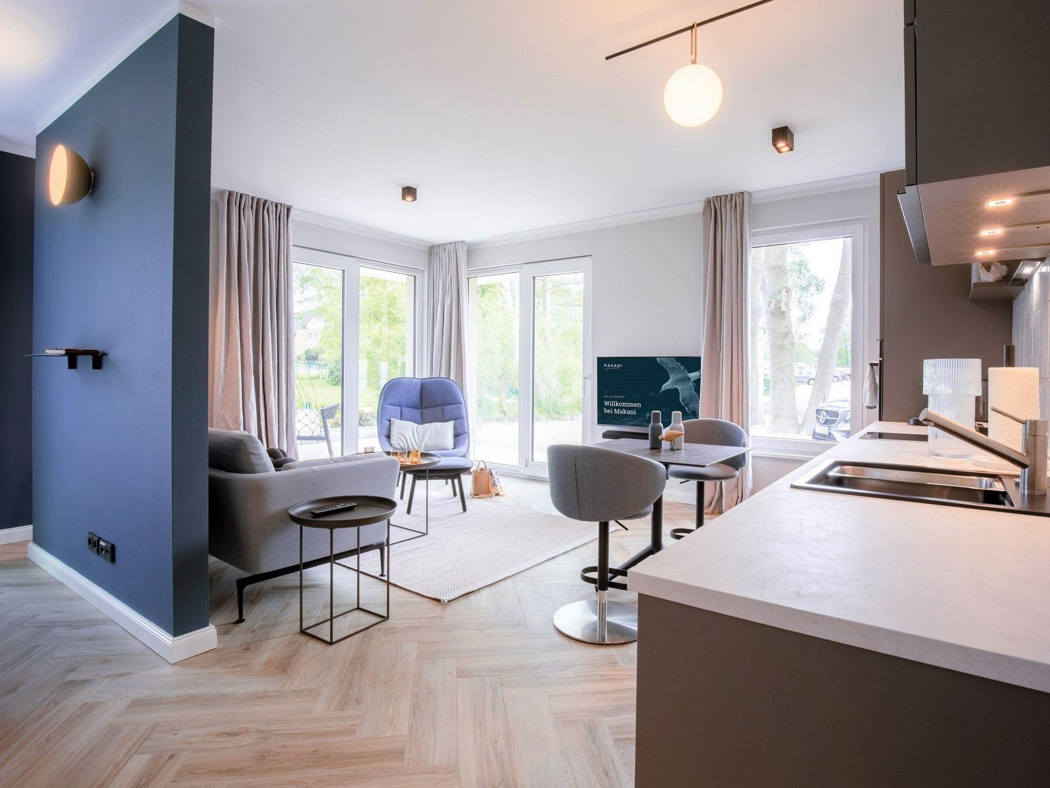 Das Ferienappartement Makani 1 hat eine fließende Architektur, in der Sie den ganzen Tag die Ostseesonne genießen können. Hier setzt sich das Urlaubsgefühl von draußen im offen gestalteten Innenraum fort. Von hier aus geht es auf die großzügige Terrasse, dem richtigen Ort, um im Sommer die Süd- und Westsonne zu genießen und im Winter den rauen Charme der Ostsee. Denn an der Außenwand sind Infrarot-Strahler integriert, die für wohlige Wärme sorgen.