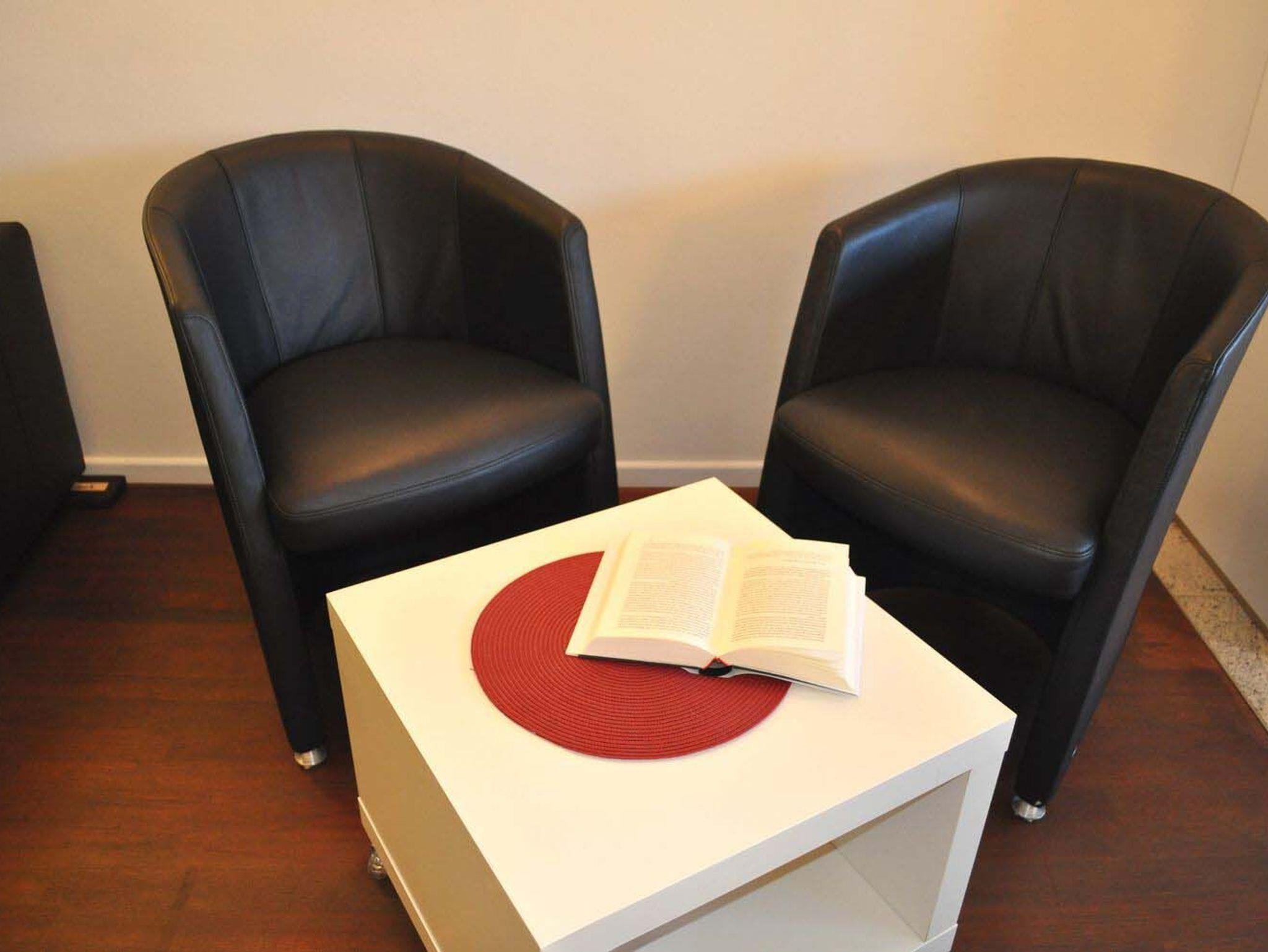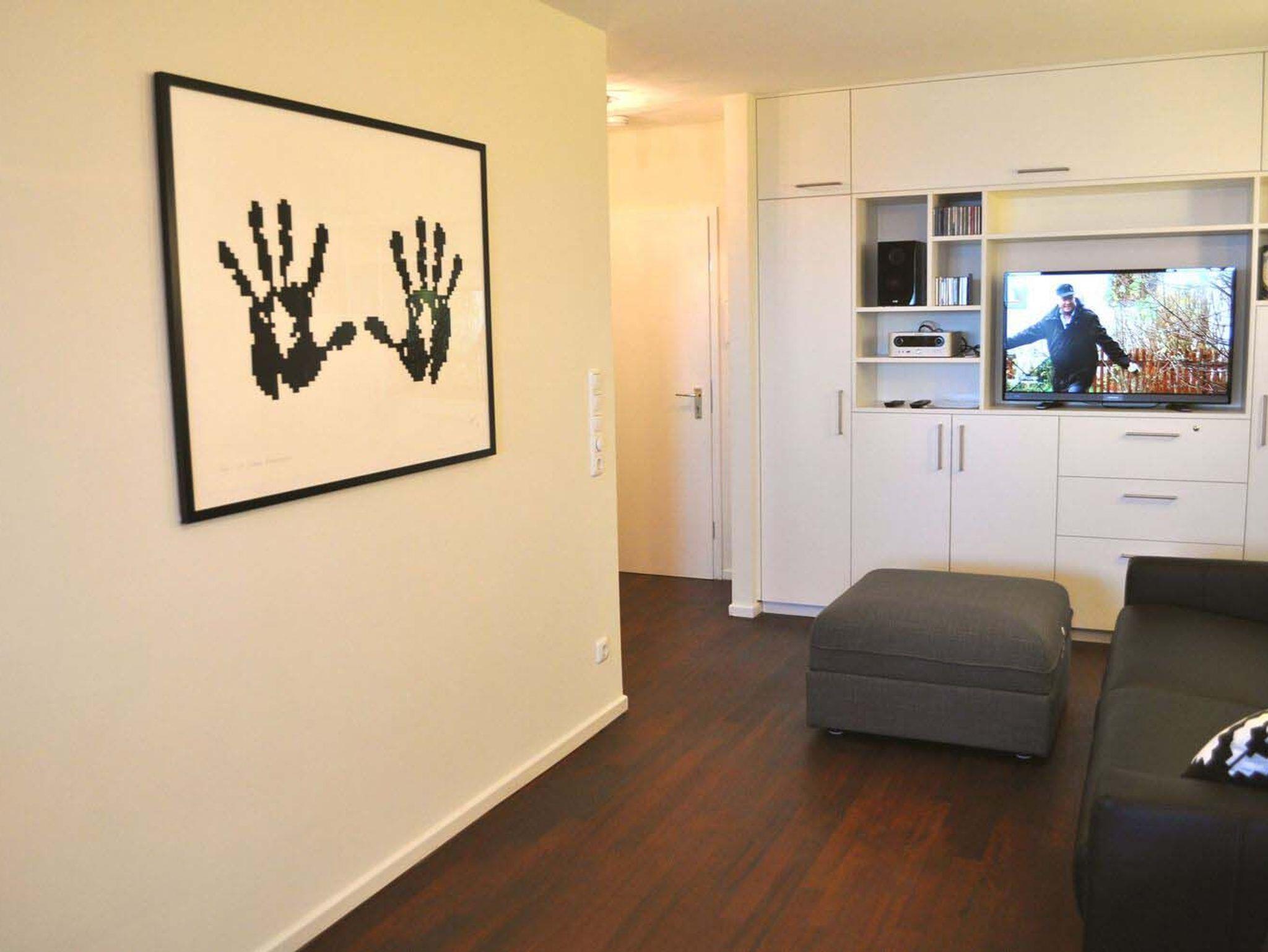 Wohnzimmer: 2 Sessel, 3 Designer-Wandleuchten, 4 Plattenherd mit Ceranfeld, 4 Stühle, Backofen, Couchtisch, Dunstabzugshaube, Einbauküche, Einbauschrank, Esstisch, Flachbildschirm, Geschirr, Kabel-TV, Kaffeemaschine, Kochtöpfe, Kühlschrank mit Gefrierfach, Lederschlafcouch, Nespresso Maschine, Spülmaschine, Staubsauger, Toaster, Wasserkocher