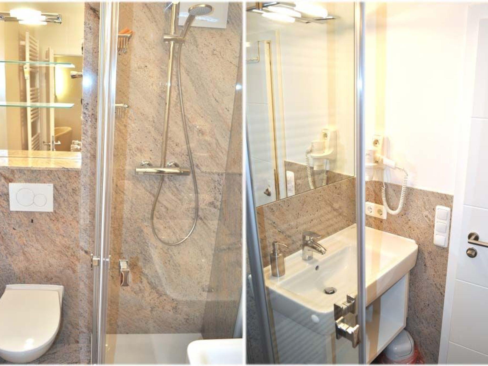 Bad 1: Duschkabine, Flachdusche mit Brauskopf und Regendusche, Fön, Lüfter, Spiegel, Waschtisch, WC