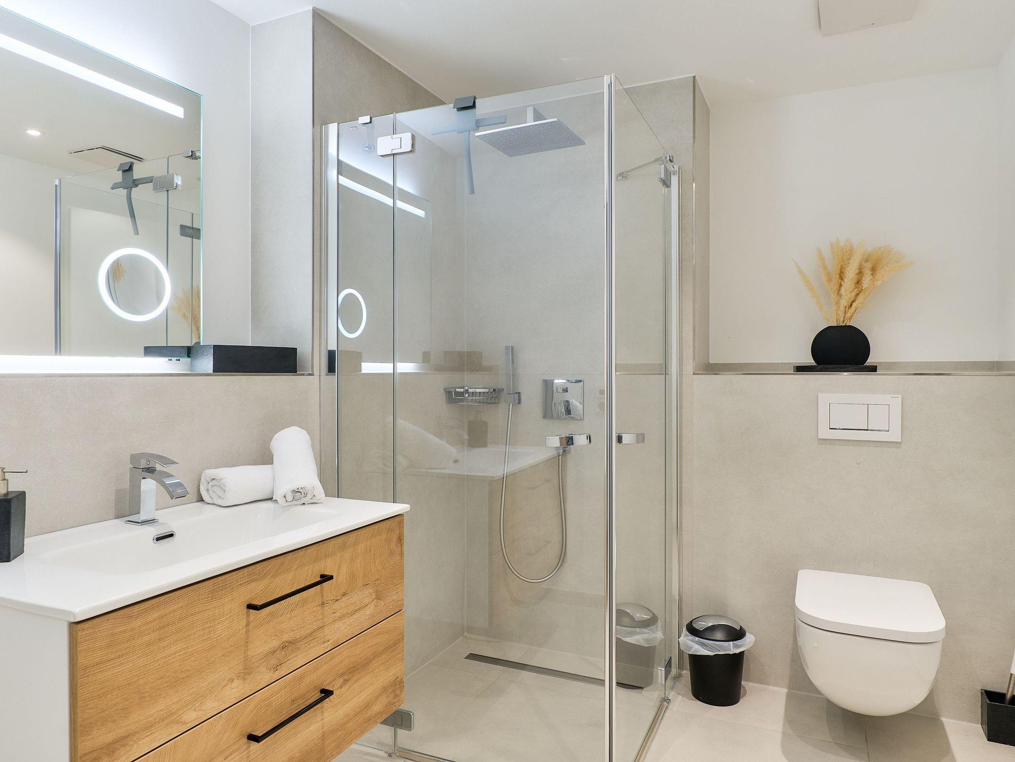 Sehr geschmackvoller Wohn-Essbereich.[nbsp] Die separate, abgegrenzte Einbauküche ist komplett ausgestattet. Backofen, Ceran-Kochfeld, Mikrowelle, Geschirrspüler, Kühlschrank mit Gefrierschrank, Filterkaffeemaschine, Kapselmaschine, Eierkocher, Mixer, Toaster und Wasserkocher, Teekanne … und noch vieles mehr. [nbsp] Der Wohnbereich ist mit einem hochwertigen Sofa, einem Wohnzimmertisch, einem TV (65 Zoll), einer Bose-Anlage sowie einem sehr ansprechenden Essbereich ausgestattet. Aus dem Wohnbereich gelangen Sie auf den Westbalkon. Hier stehen Ihnen Tisch und Stühle zur Verfügung. Das 1. Schlafzimmer ist mit einem Boxspringbett (1,80m x 2,00m), einem großen Kleiderschrank, 2 Nachttischen sowie einem Wand-TV (55Zoll) ausgestattet. Das 2. Schlafzimmer ist ebenso mit einem Boxspringbett (1,80m x 2,00m), 2 Nachttischen, einem Kleiderschrank sowie einem Wand-TV (55 Zoll) ausgestattet. Alle Fenster haben elektrische Außenrollläden. Das Duschbad, in heller Optik, mit bodengleicher Dusche / Regendusche, mit separater Handbrause, Handtuchheizkörper, Fön, Kosmetikspiegel. Die gesamte Wohnung verfügt über eine Fußbodenheizung.