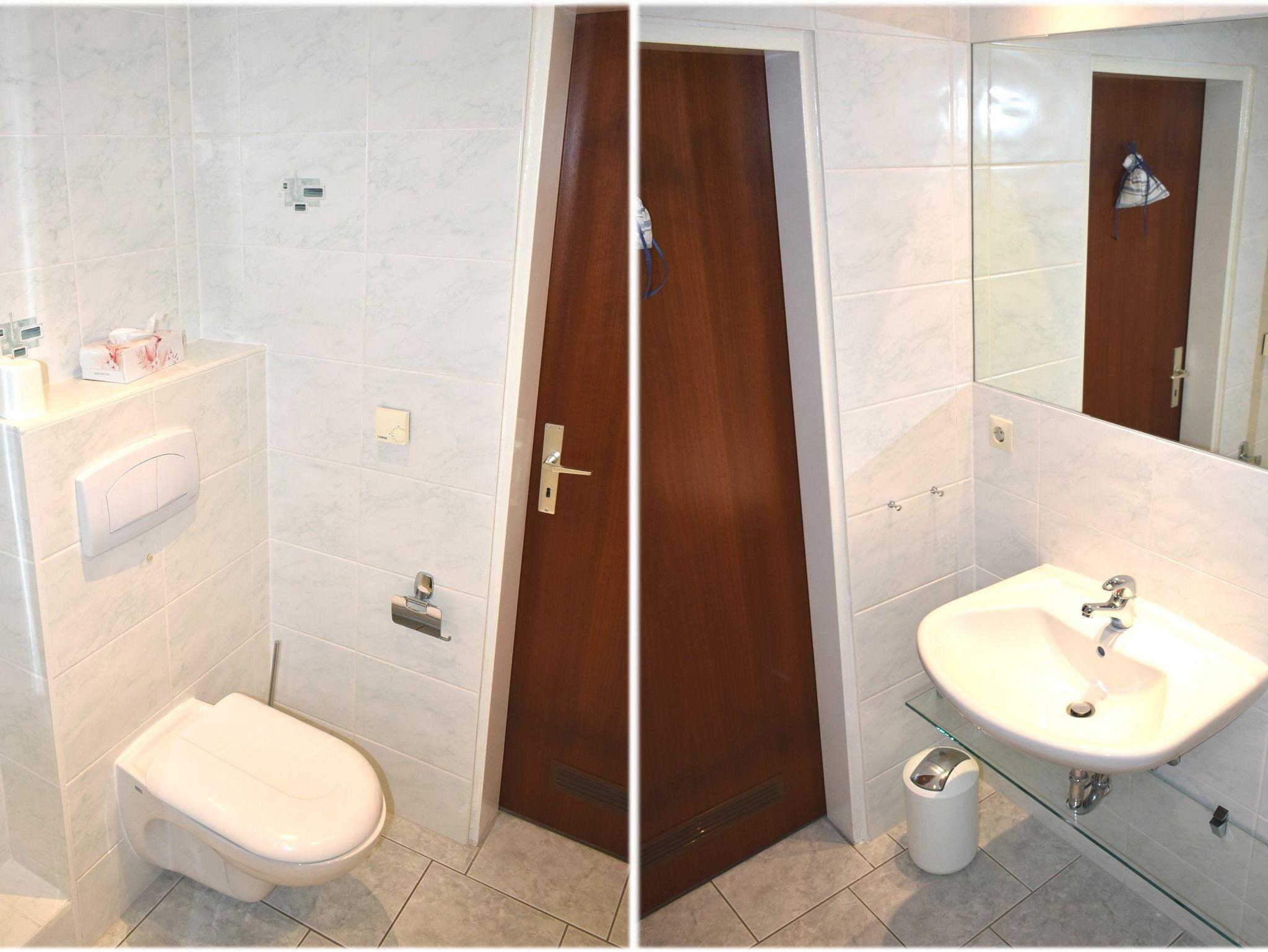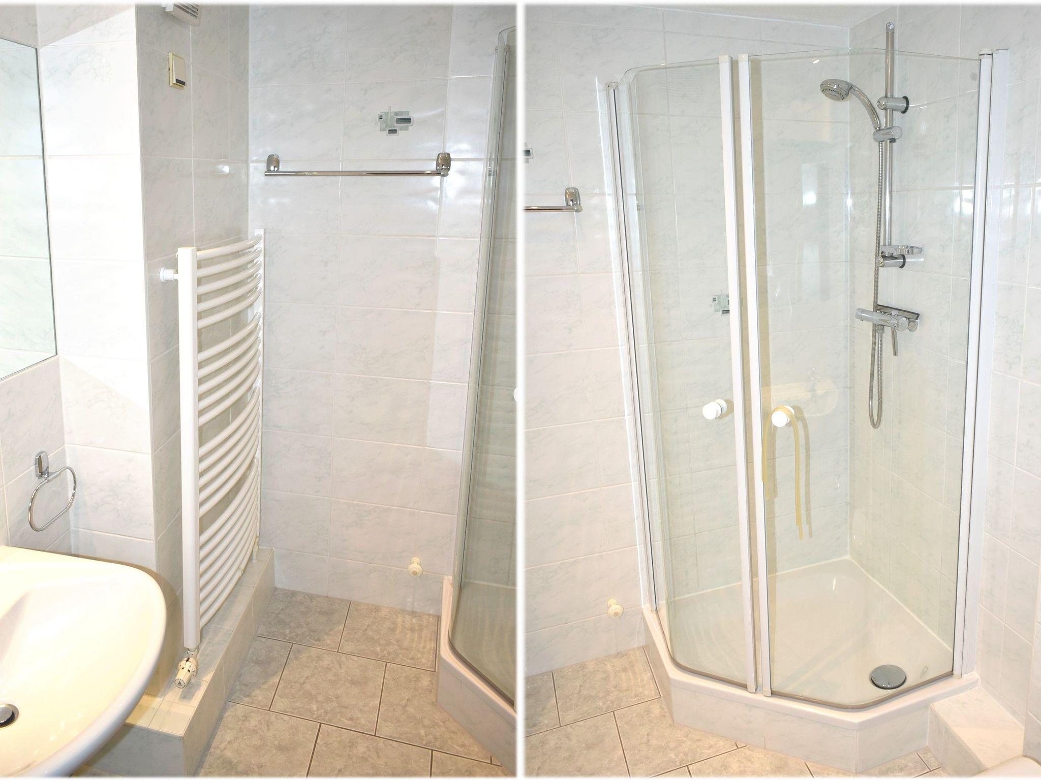 Bad 1: Duschkabine, Dusche, Spiegel, Waschbecken, WC, Handtuchheizung, Fussbodenheizung