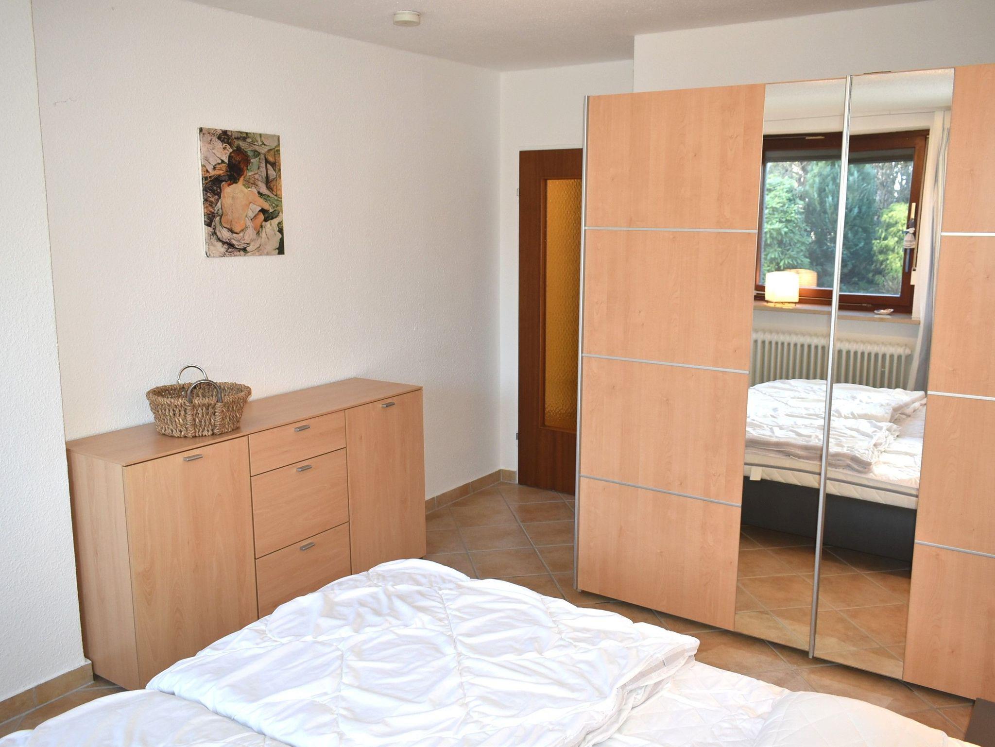 Schlafzimmer 1: Kleiderschrank, 2 Matratzen, 2 Nachttische, Doppelbett 2,00 x 1,80 m, 2 Nachttischlampen, Anrichte, Stummerdiener, Fön, Spiegel, Tischlampe